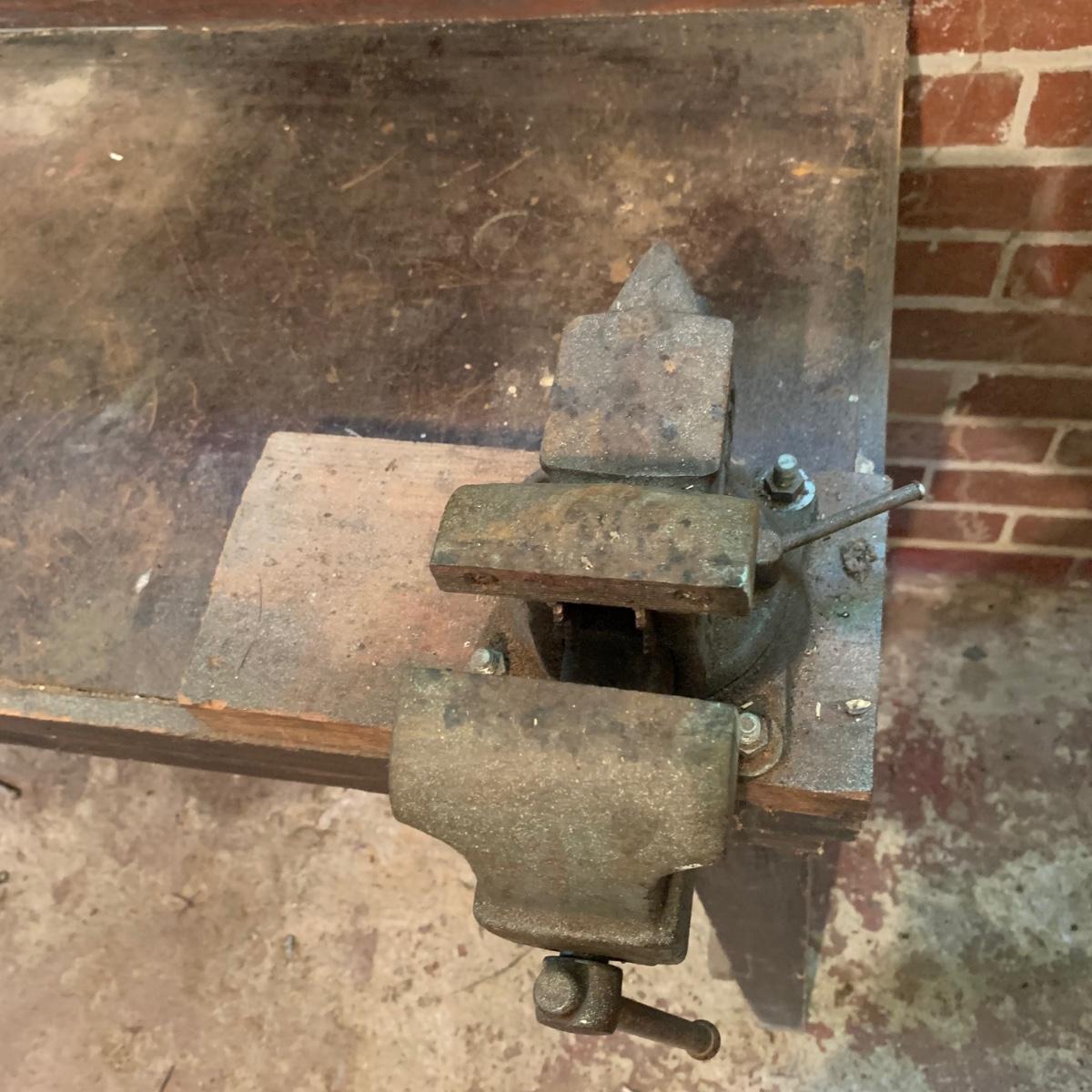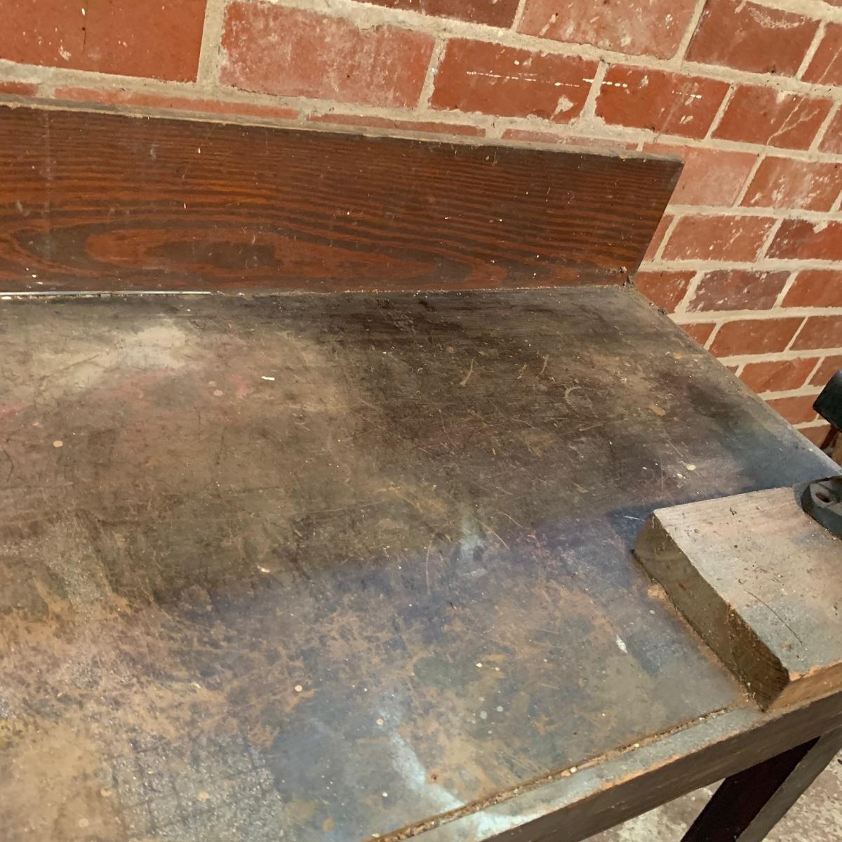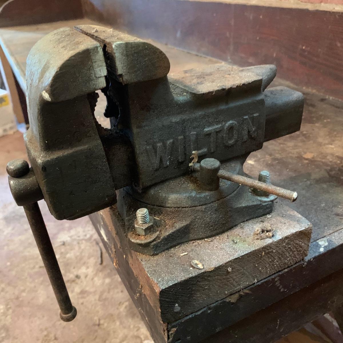 Solid wooden work bench with a layer of manufactured wood on its top surface. It is very sturdy. The table measures 84” x 21” x 40.5”. The table surface height is 34”. A Wilton vise is bolted onto the table. Both items are worn on the surface, but structurally in very good condition. Local pickup only. The winning bidder will need to bring help to move this item, as it is quite large and heavy.