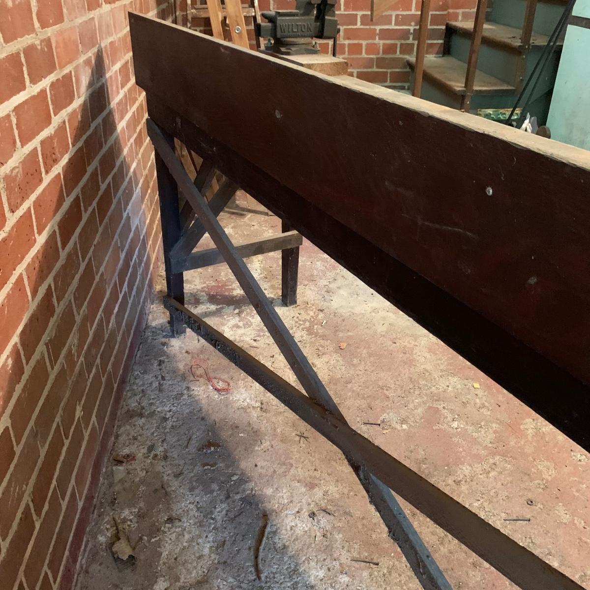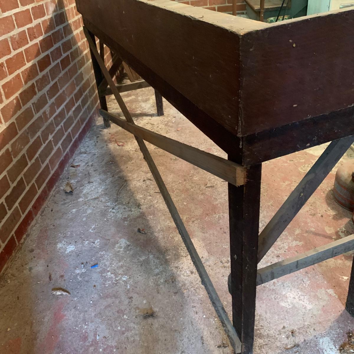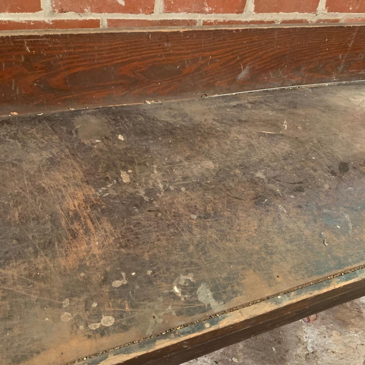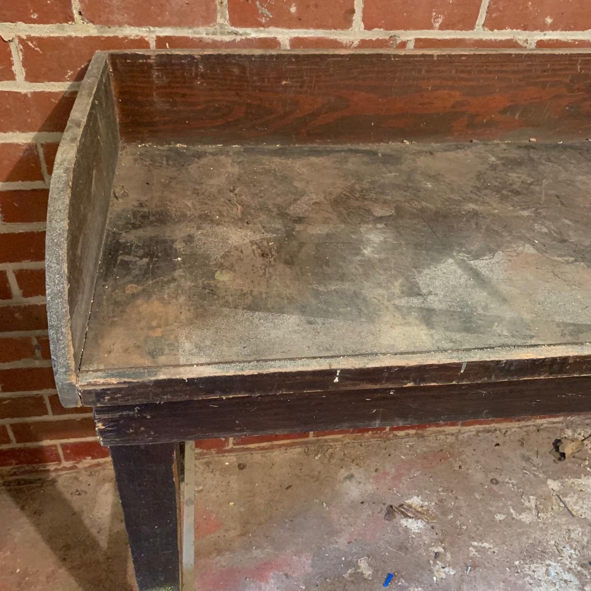 Solid wooden work bench with a layer of manufactured wood on its top surface. It is very sturdy. The table measures 84” x 21” x 40.5”. The table surface height is 34”. A Wilton vise is bolted onto the table. Both items are worn on the surface, but structurally in very good condition. Local pickup only. The winning bidder will need to bring help to move this item, as it is quite large and heavy.