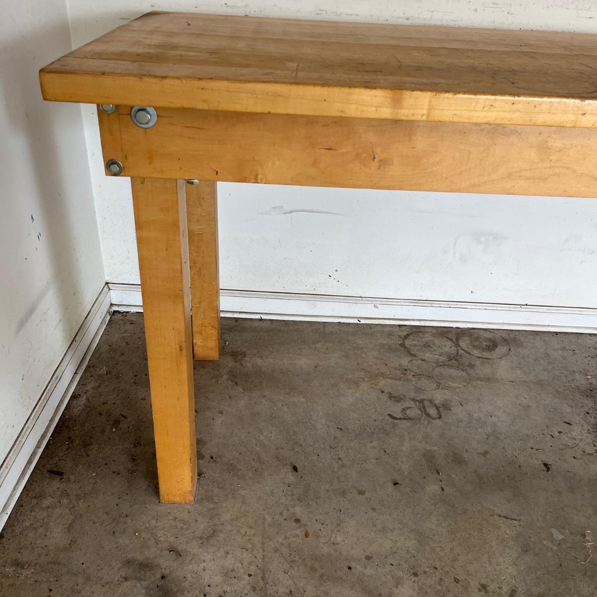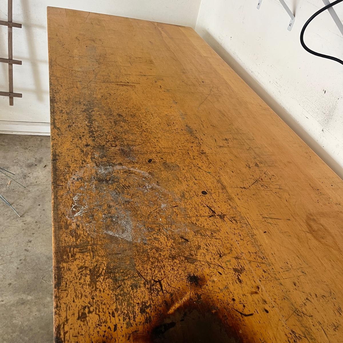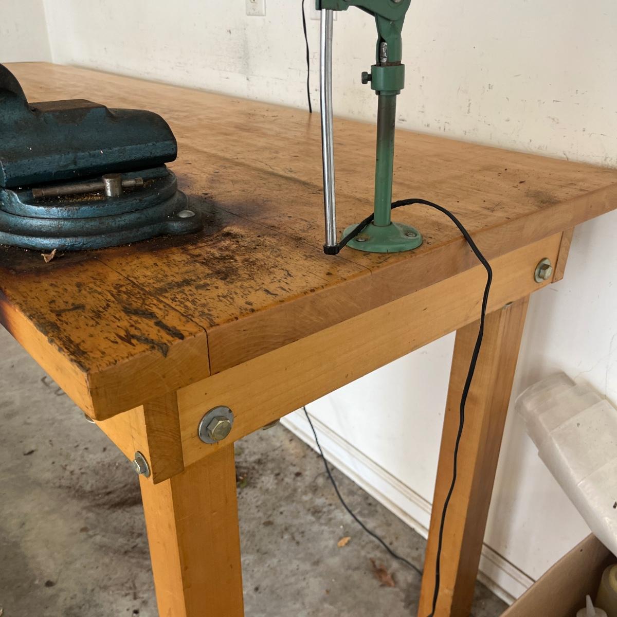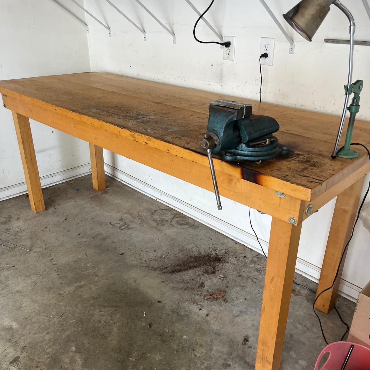 Lot includes a heavy wooden workbench with attached light and vise. Bench measures 84” x 30” x 35”H. Bench has nicks, scratches and stains, see pictures. Light powered on when plugged in.