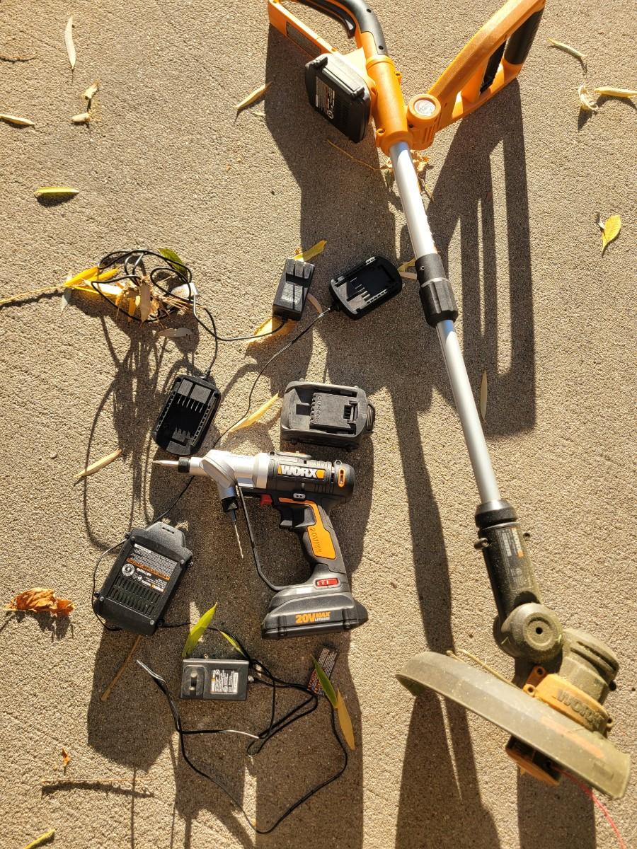 Worx trimmer and driver/impact and 4 batteries, 2 chargers
