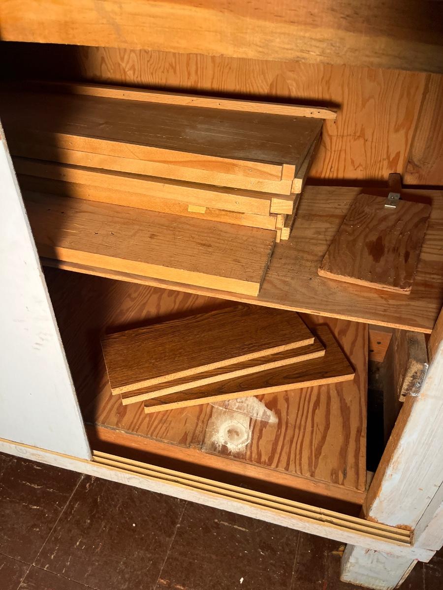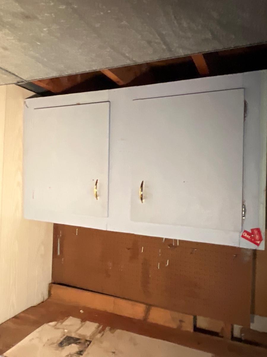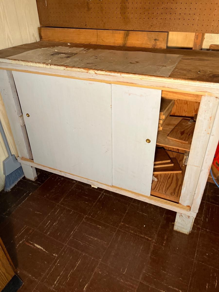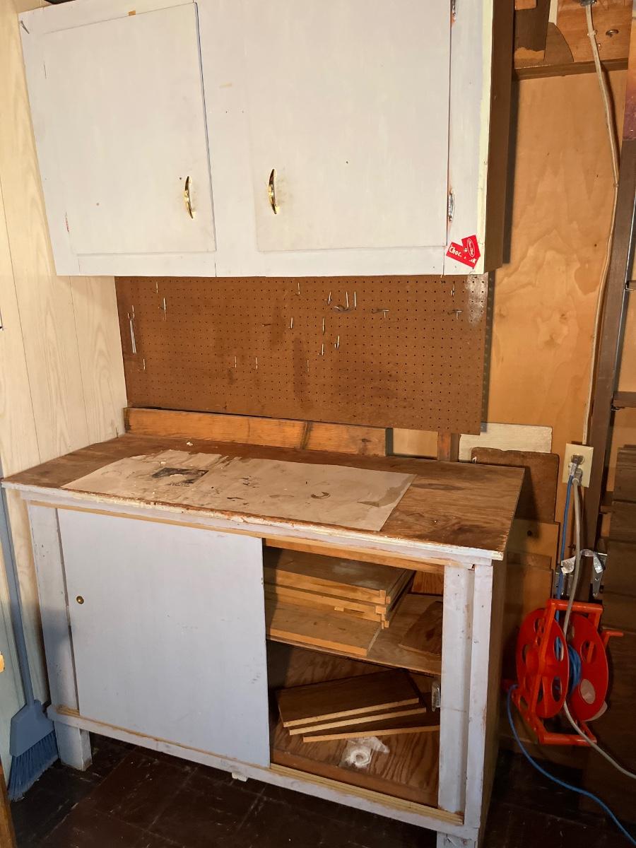 Workbench 53x22x37, cabinet 49x11x27. Bring tools to remove cabinet from wall. Located in basement.