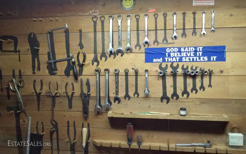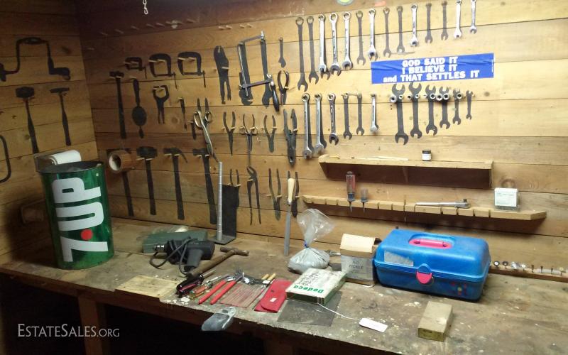 Workbench contents including: drill, wrenches, file, screwdrivers and more