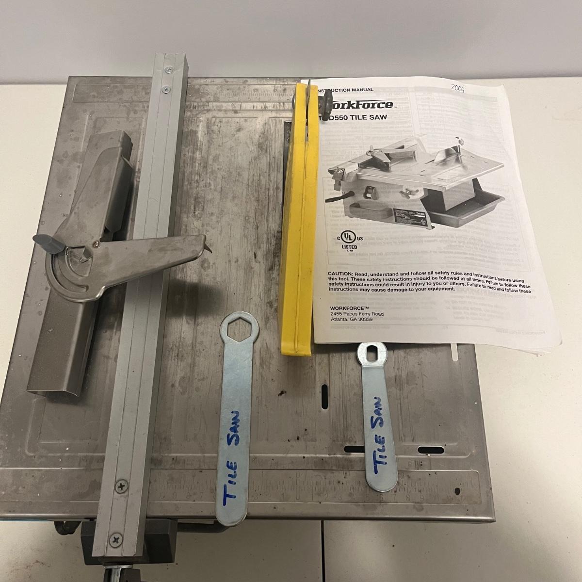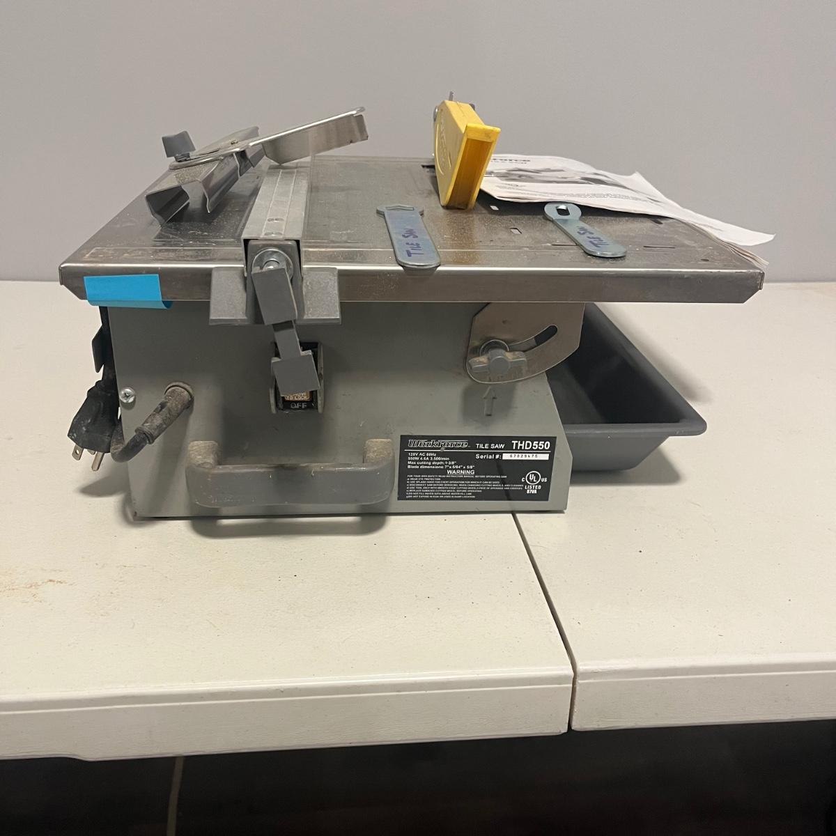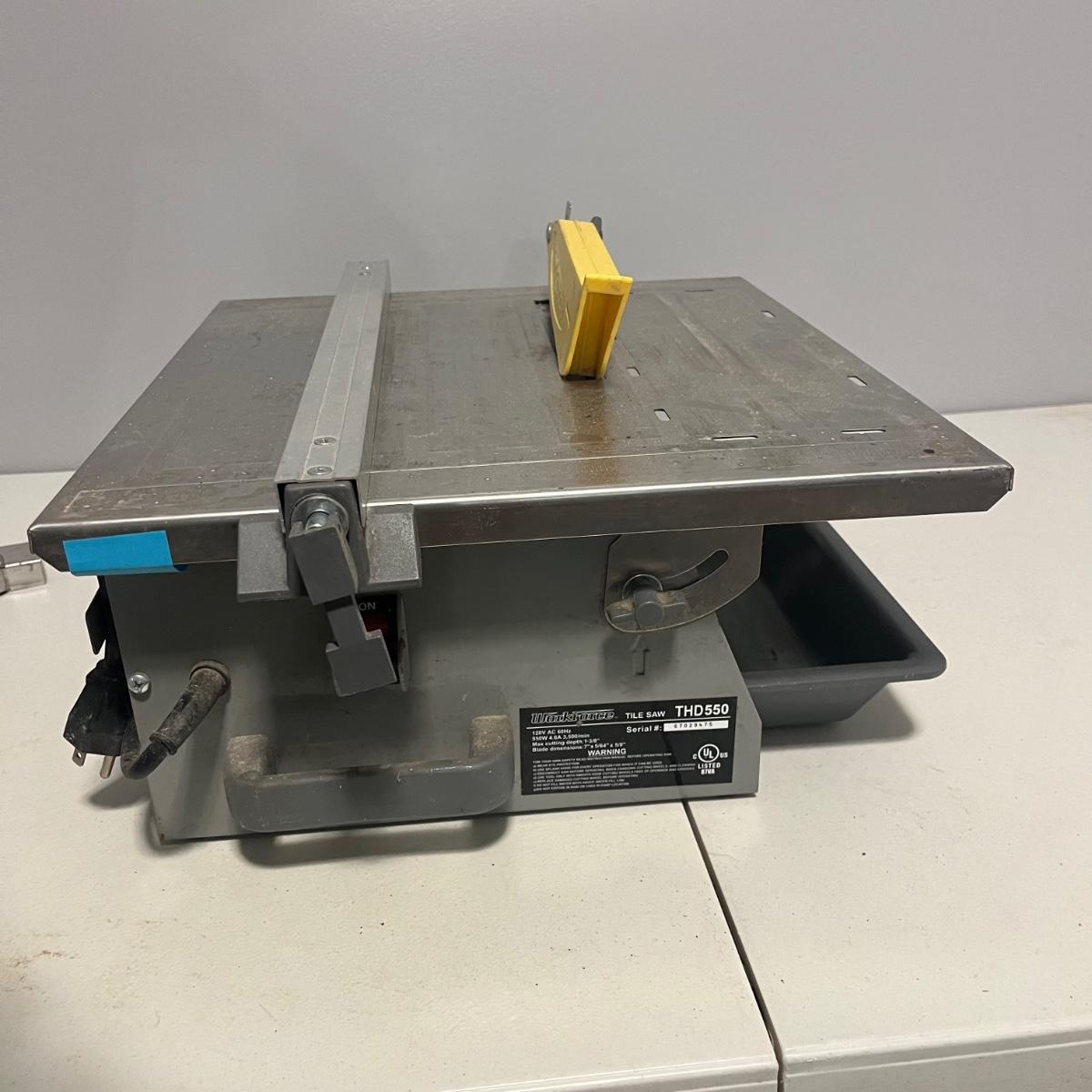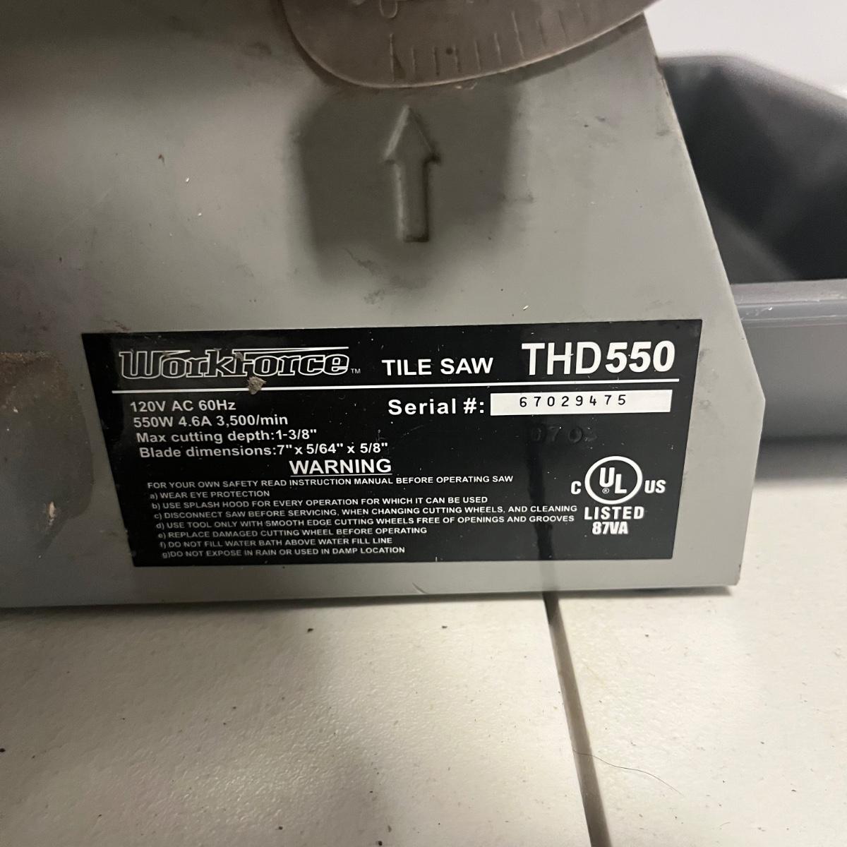 Lot includes a Workforce tile saw that powered on when plugged in. Saw measures 16”.5” x 15” x 10”H. Top has come unwelded from bracket, see pictures.
