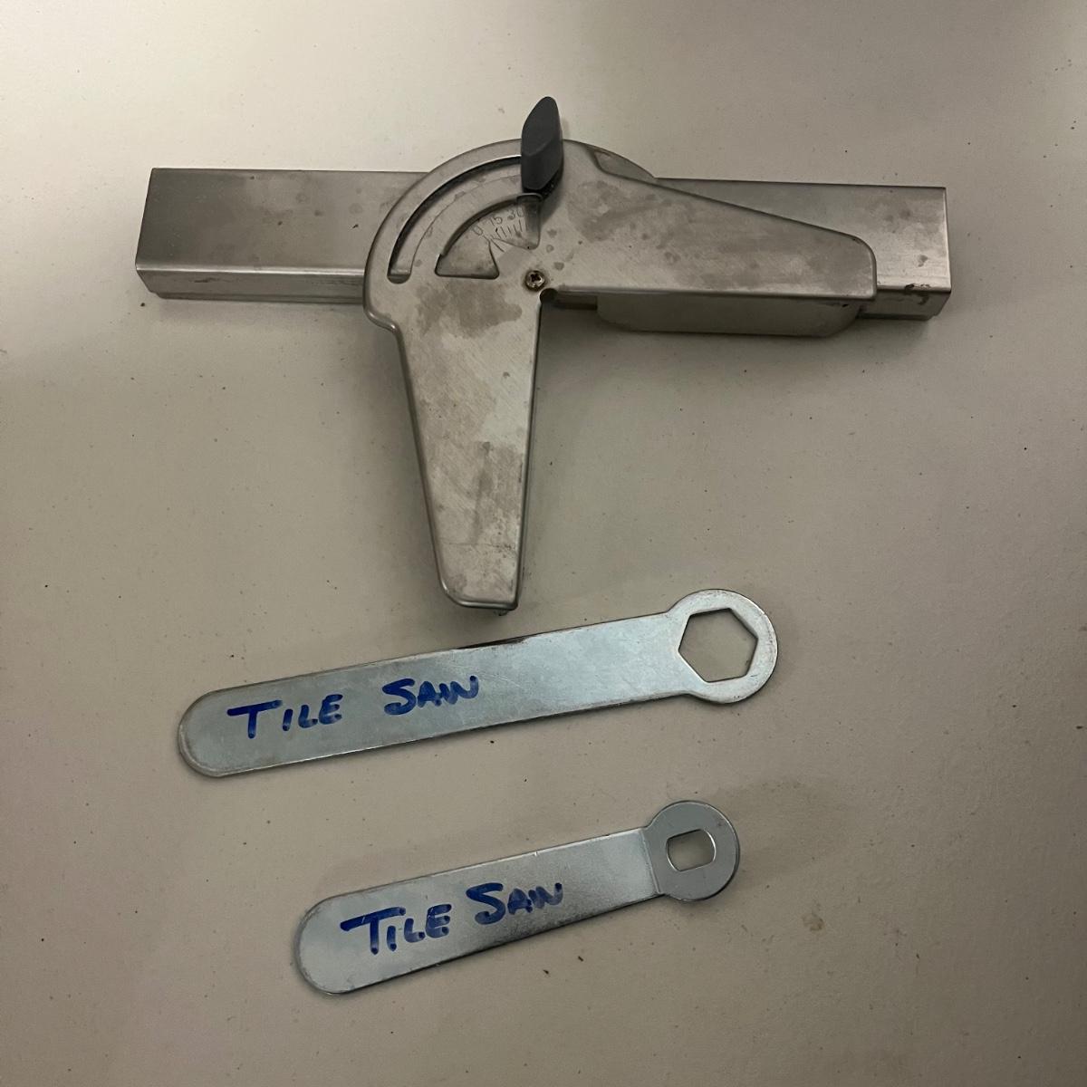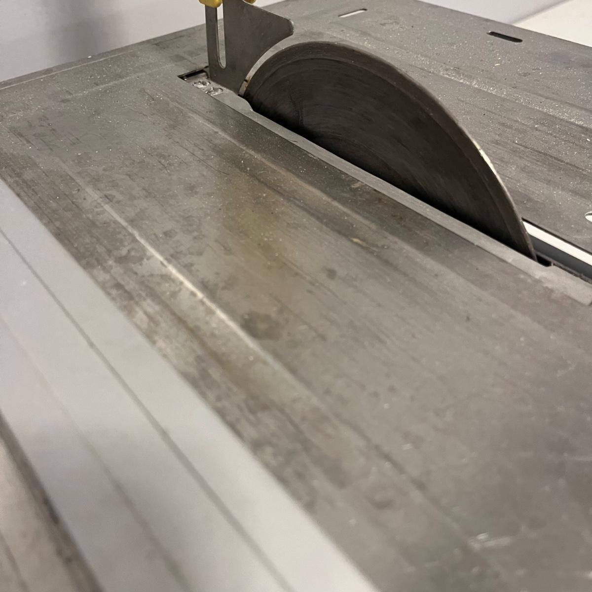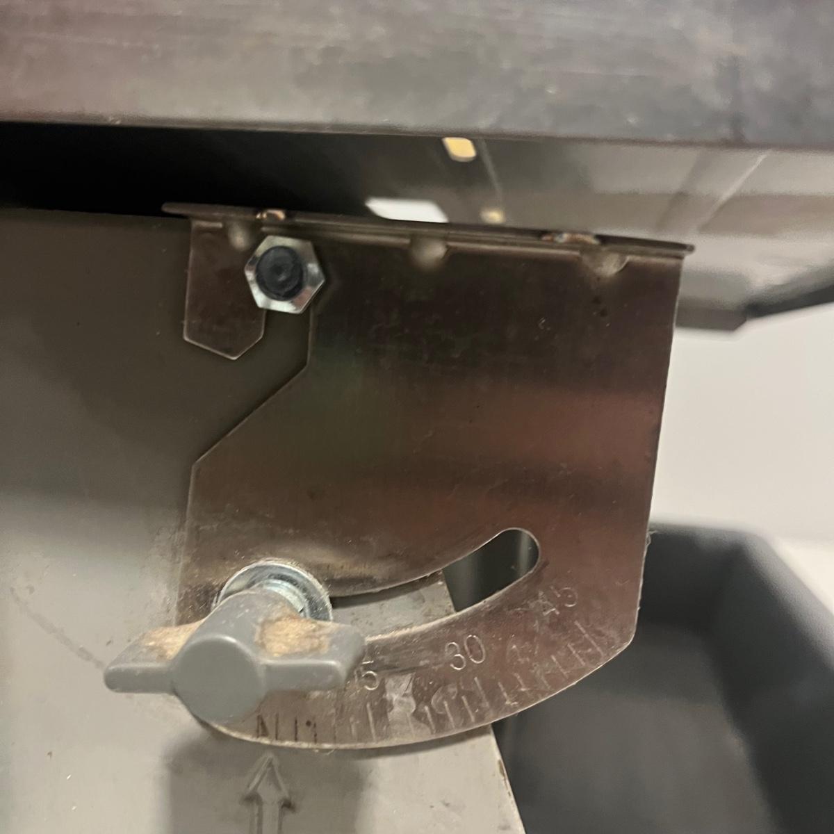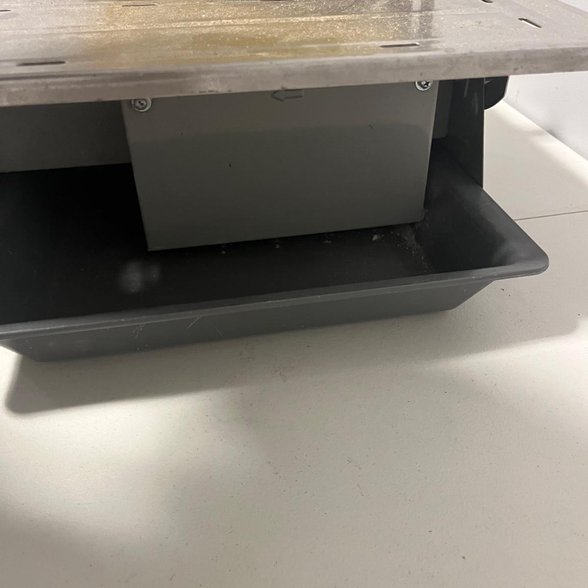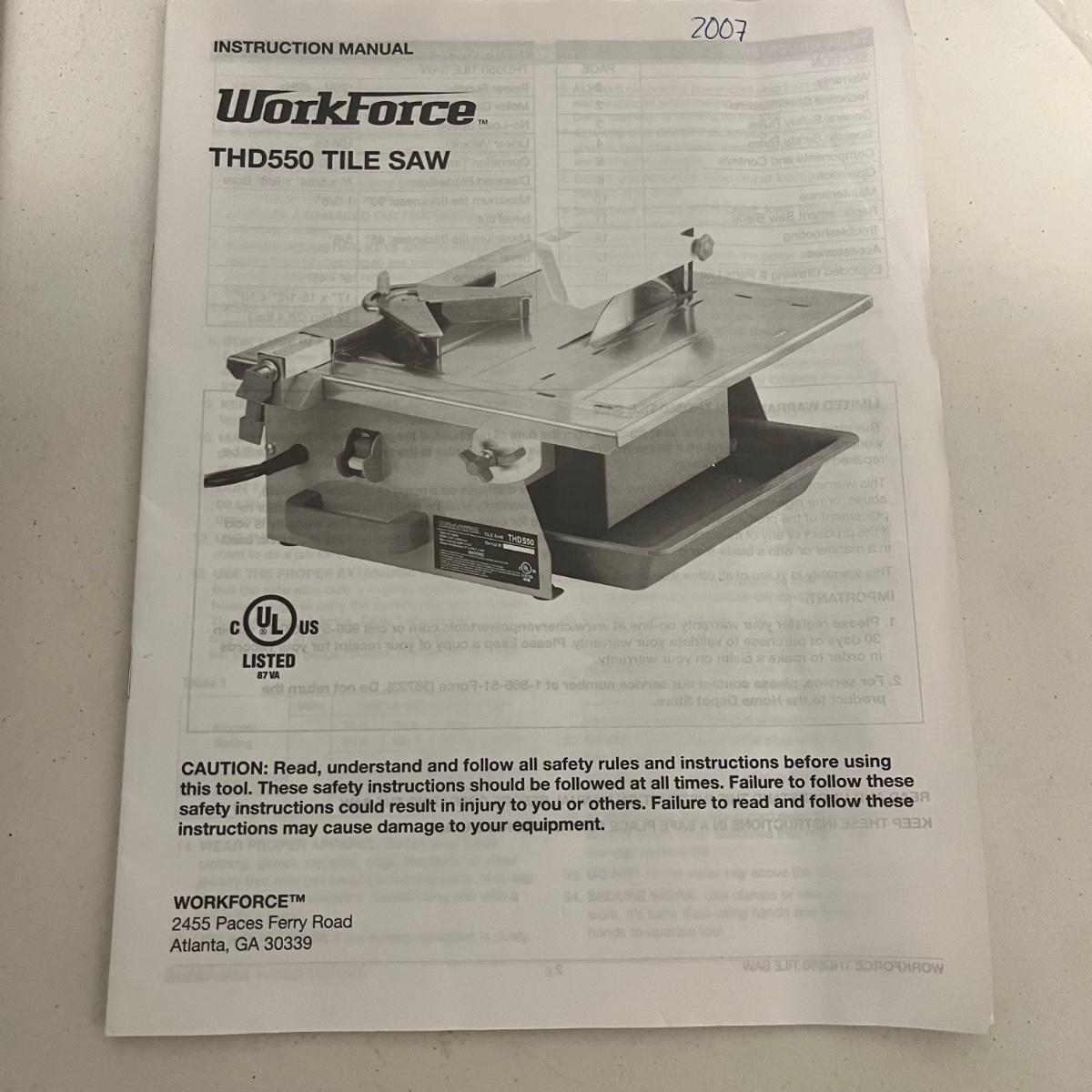 Lot includes a Workforce tile saw that powered on when plugged in. Saw measures 16”.5” x 15” x 10”H. Top has come unwelded from bracket, see pictures.