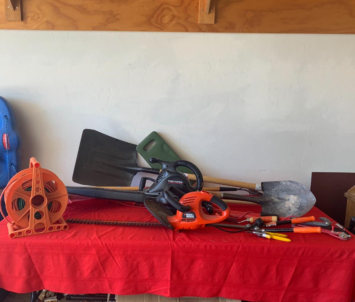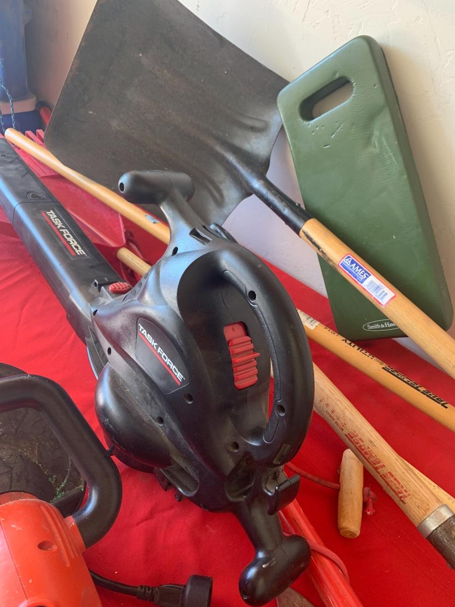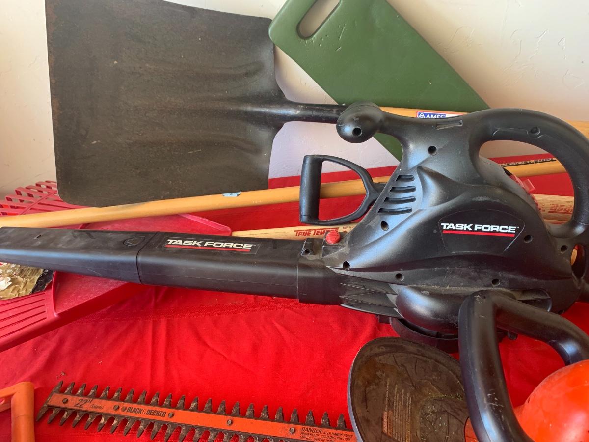 True Temper shovels, rakes, Task Force blower, black n decker trimmer, misc clippers. Extension cord, Tree Pruner.