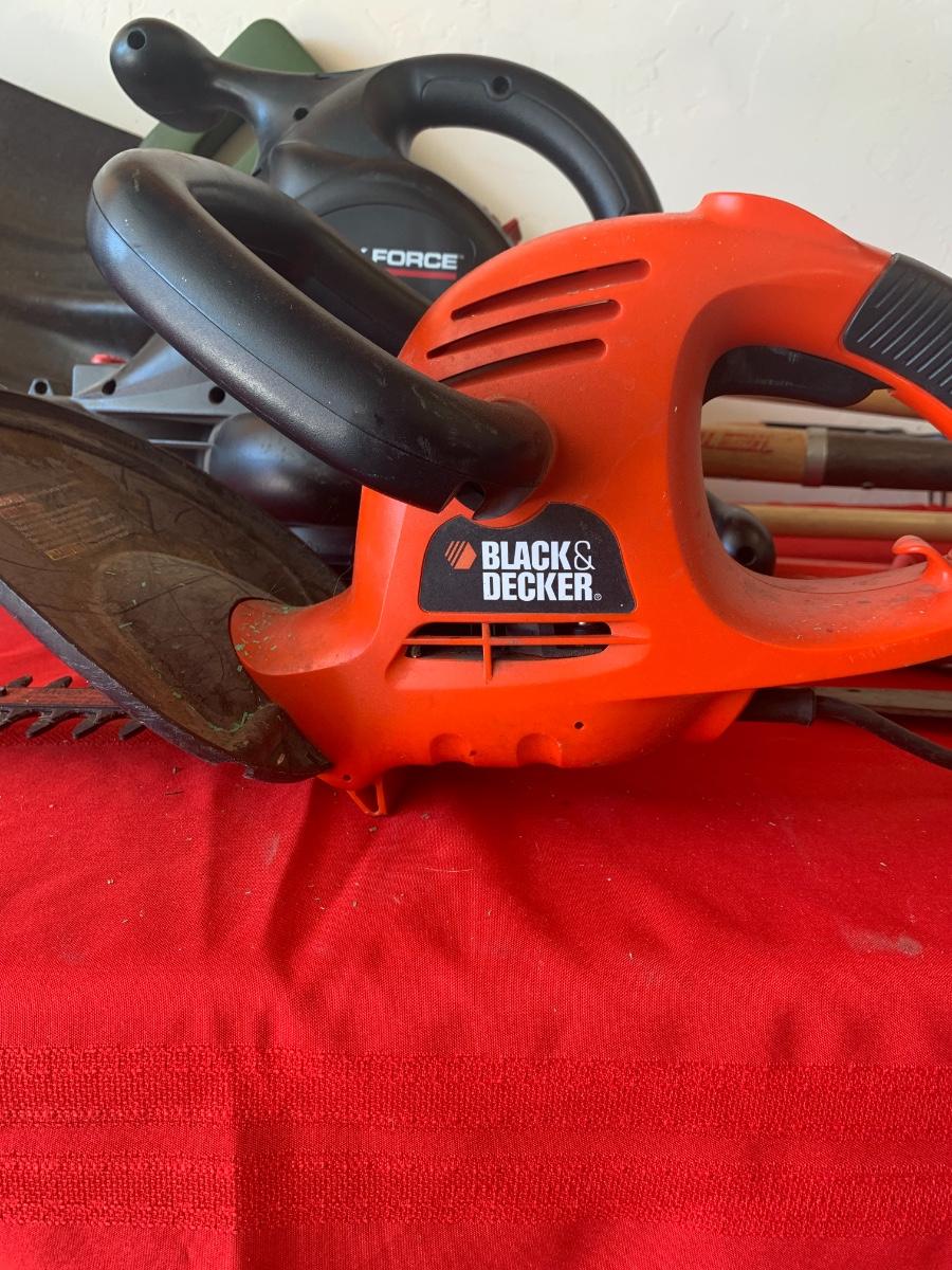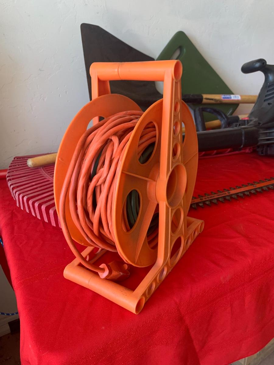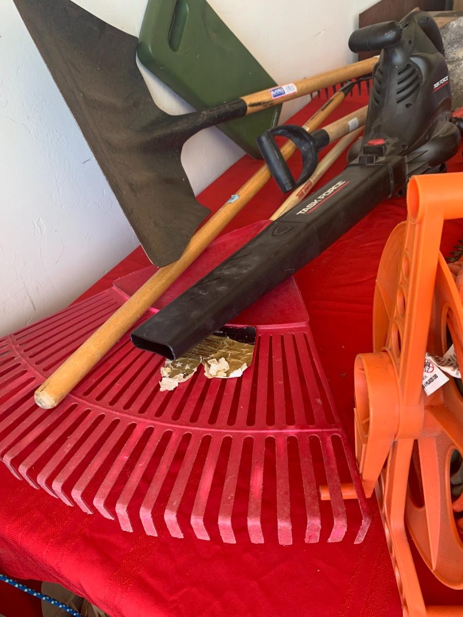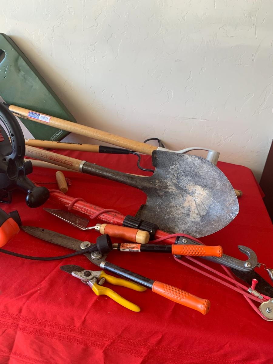 True Temper shovels, rakes, Task Force blower, black n decker trimmer, misc clippers. Extension cord, Tree Pruner.