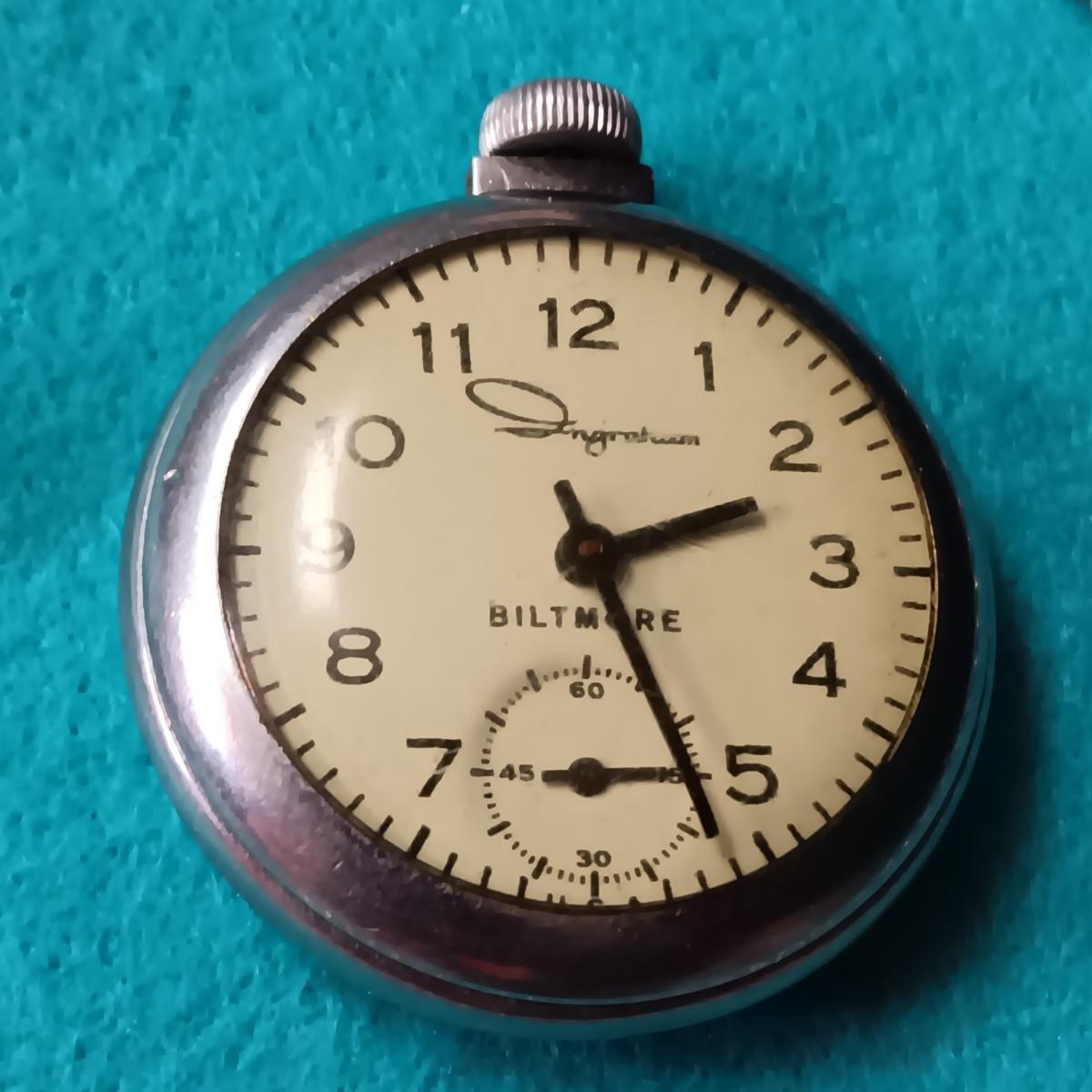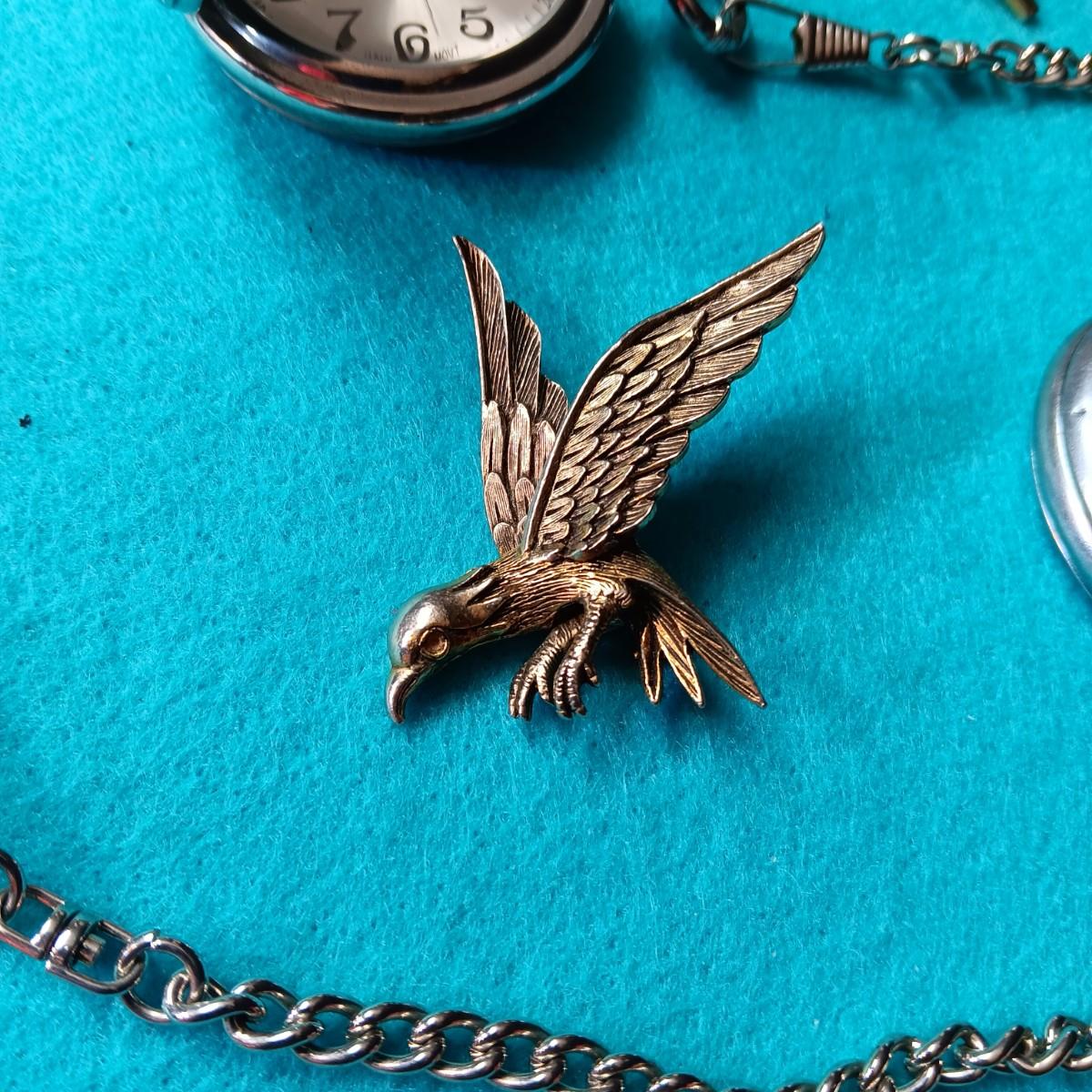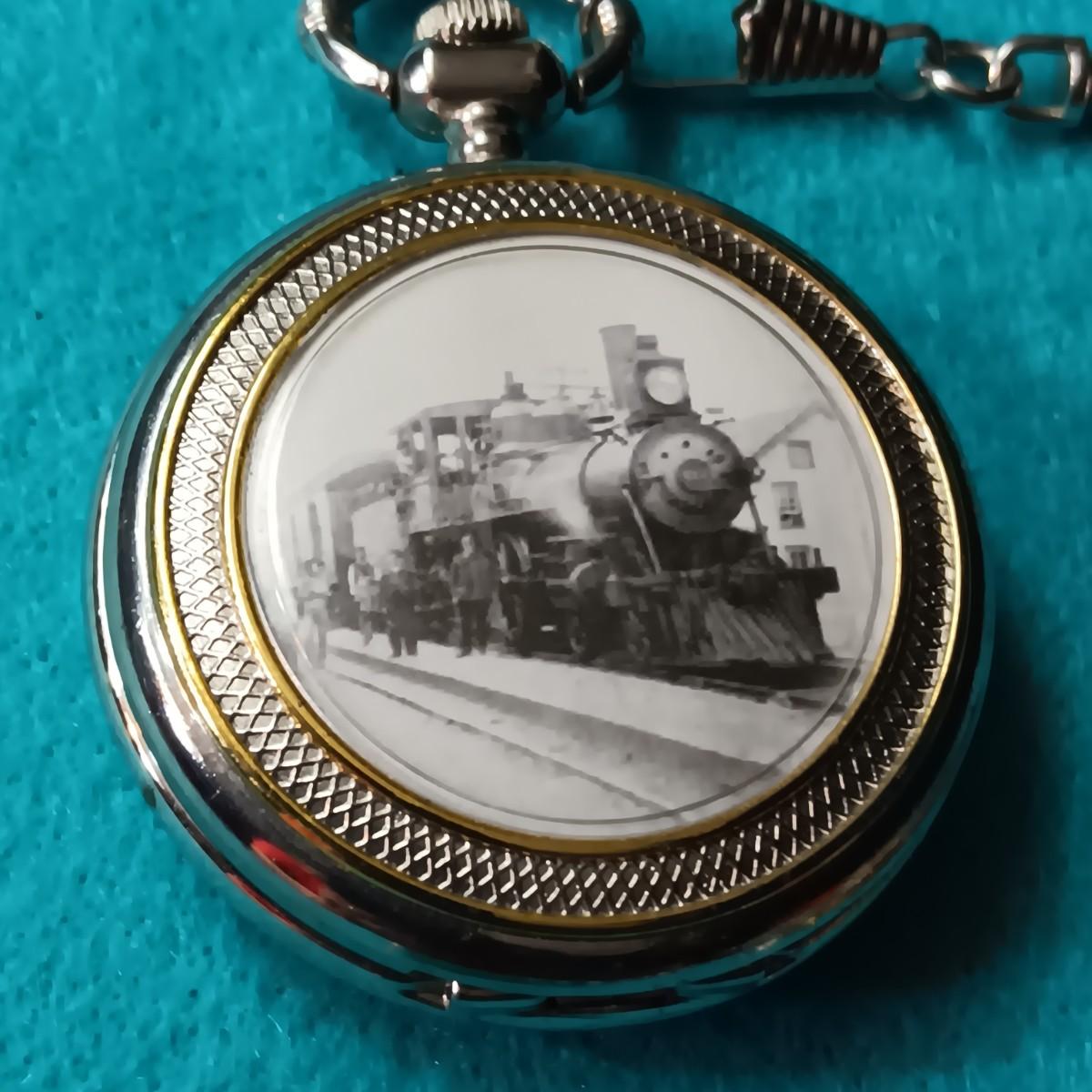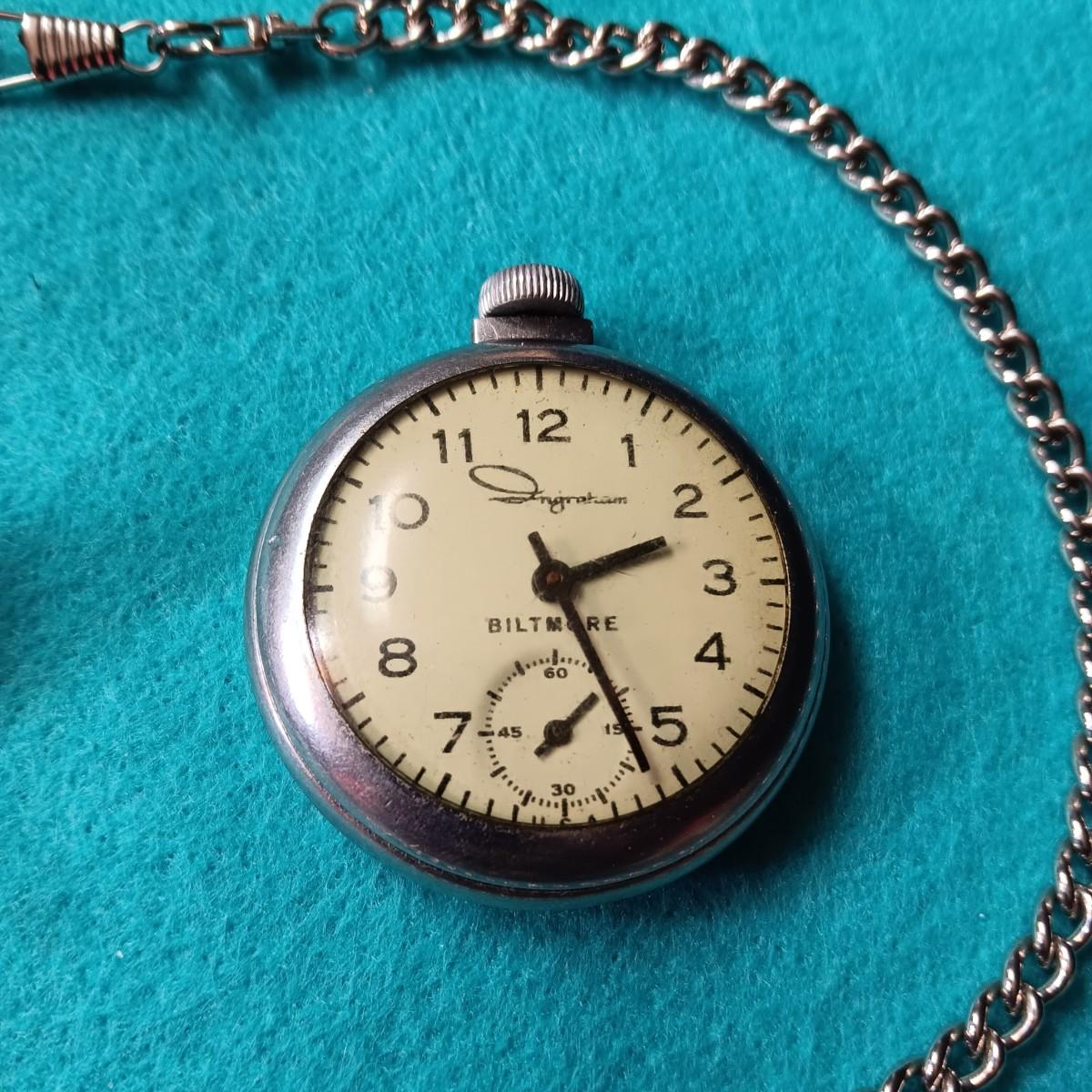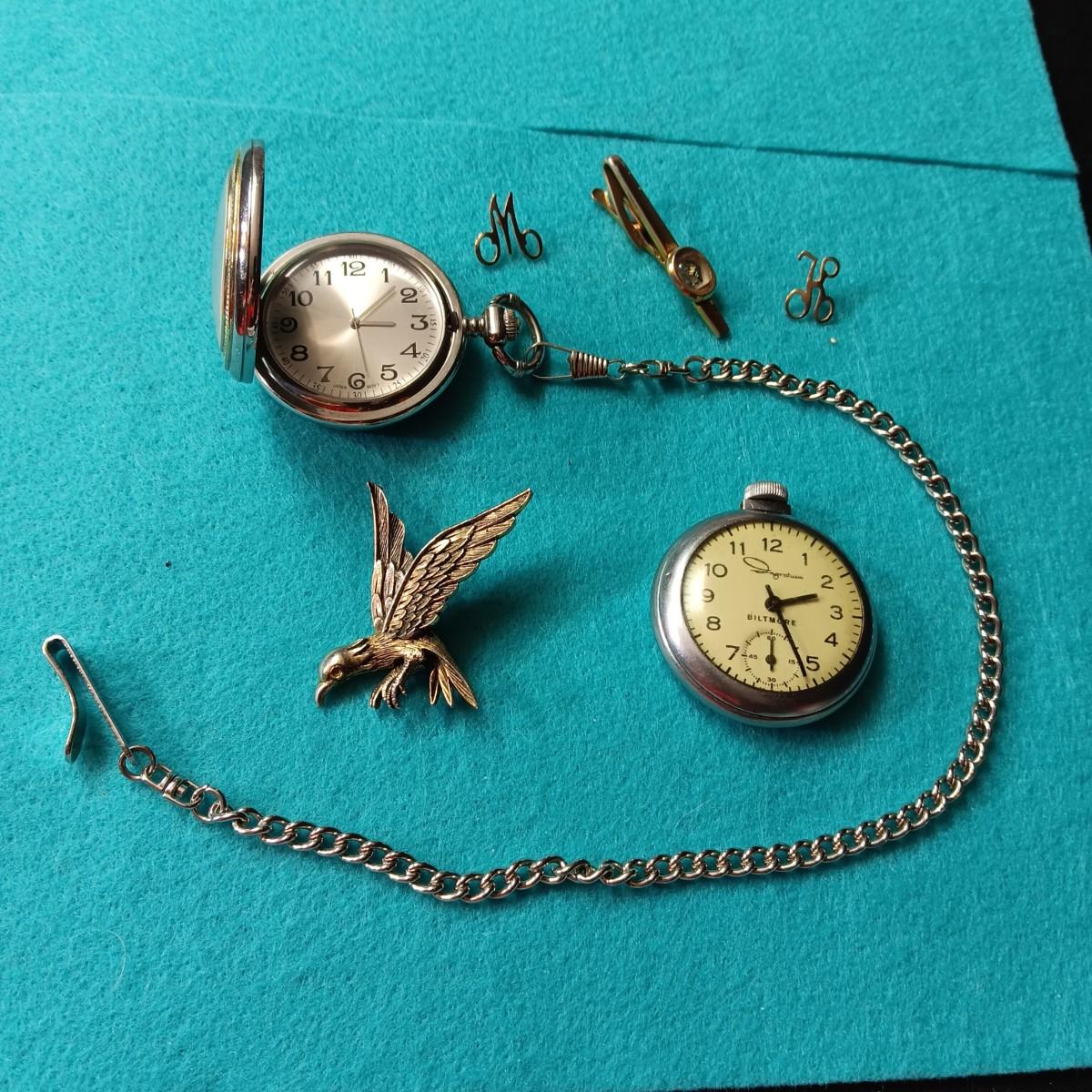 WORKING INGRAHAM POCKET WATCH, EAGLE PIN, TIE TACKS & CLIP, ONE RAILROAD THEME POCKET WATCH DOES NOT WORK