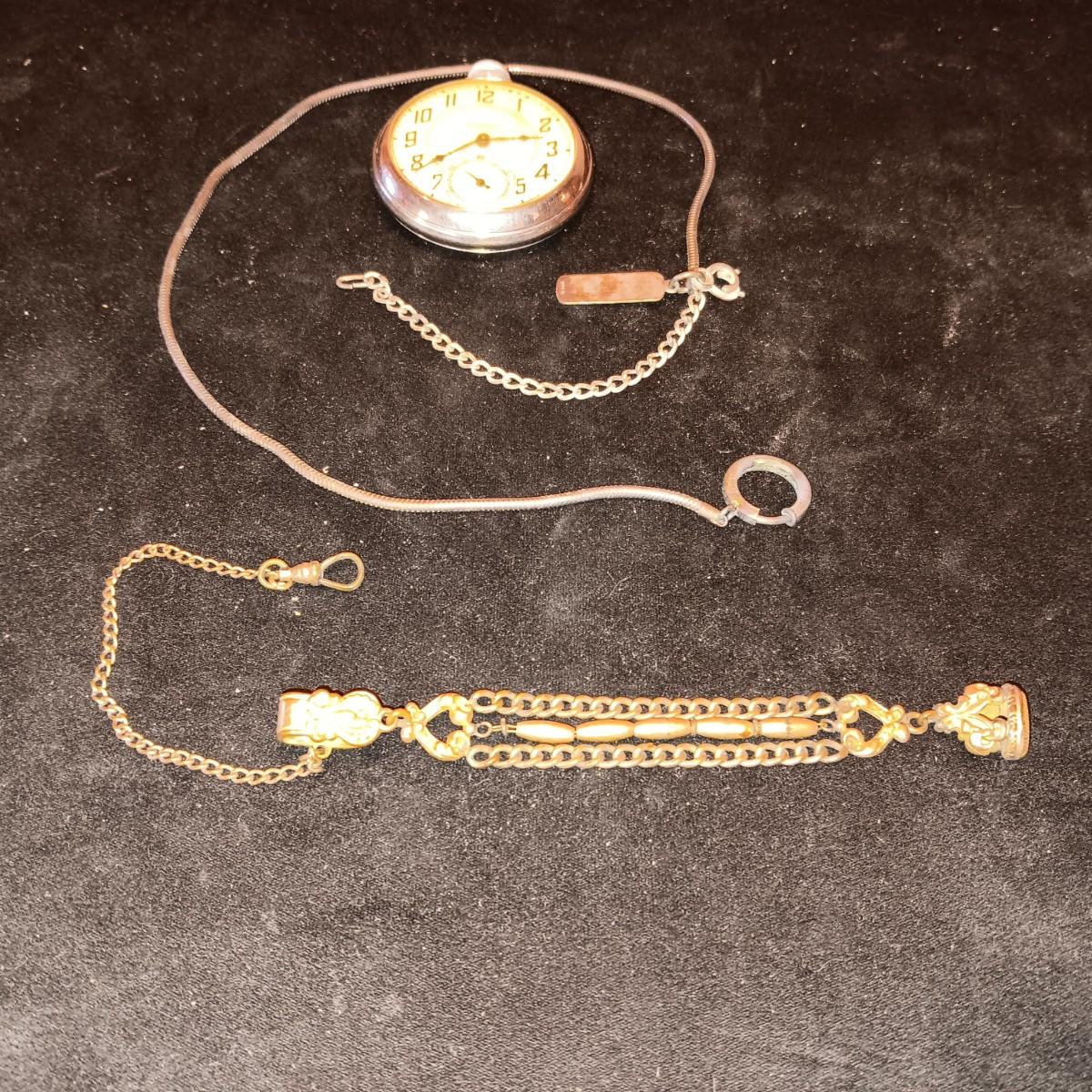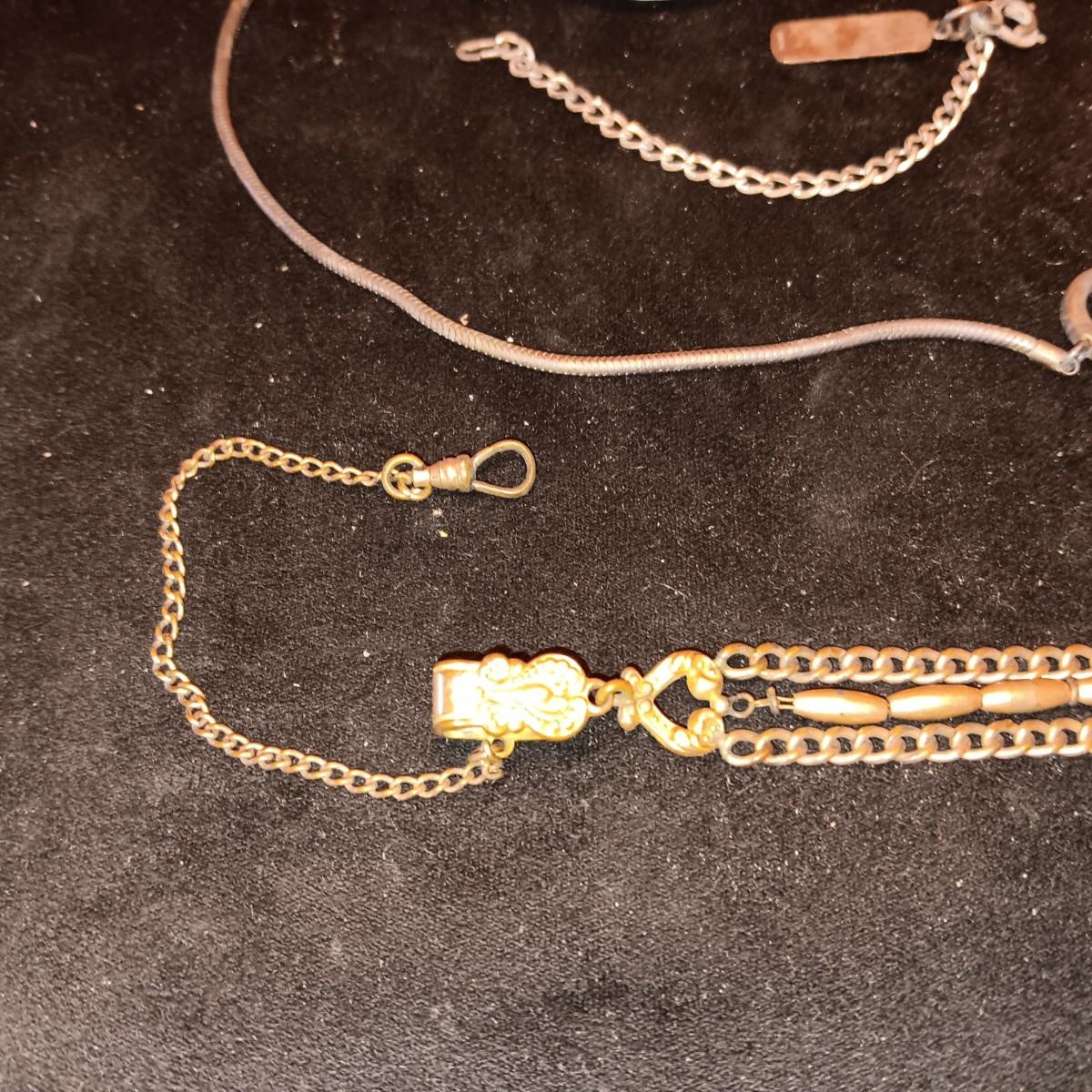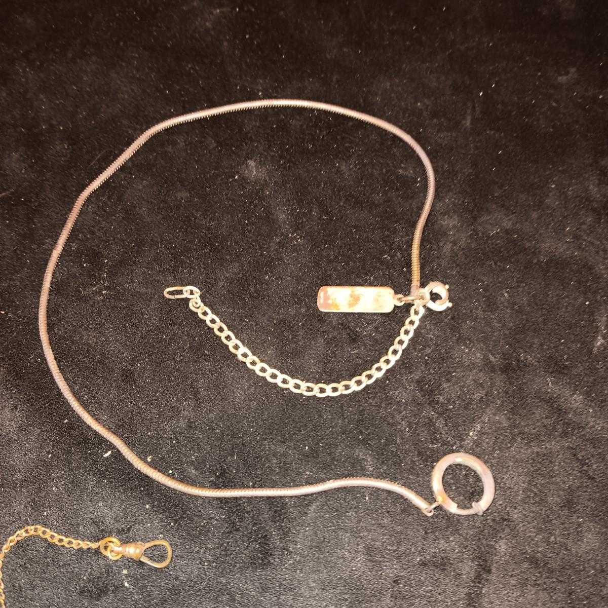 1 POCKET CHAIN HAS A SMALLER CHAIN ATTACHED THAT IS STERLING SILVER