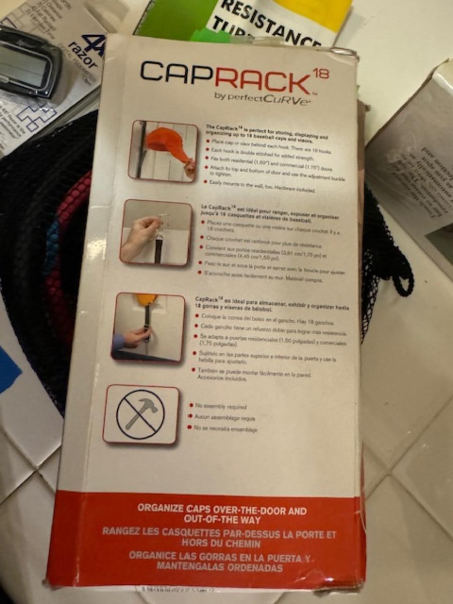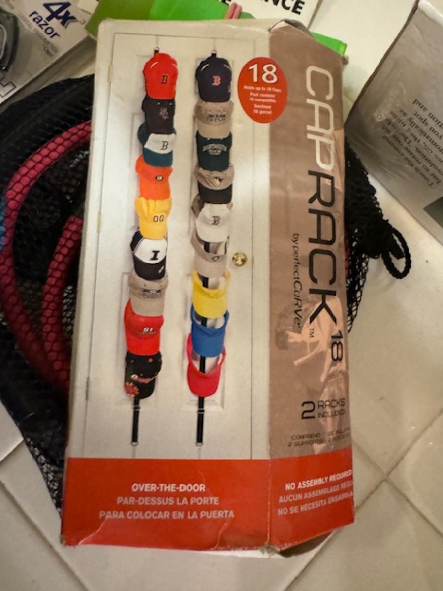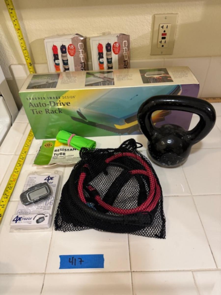 razor, pedometer, 2x 18 cap rack by perfect Curve, sharper image design auto drive tie rack, CAP 15lbs kettleball resistance band.