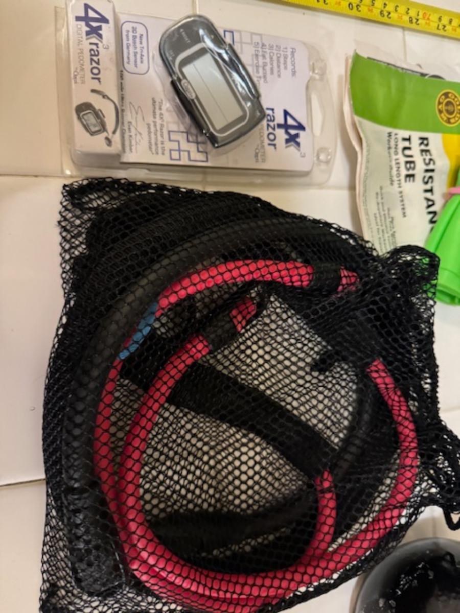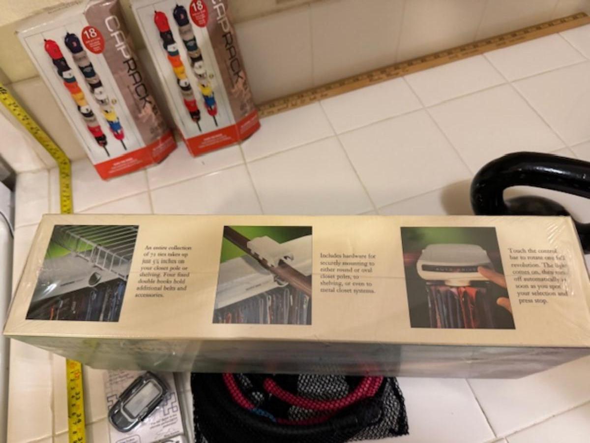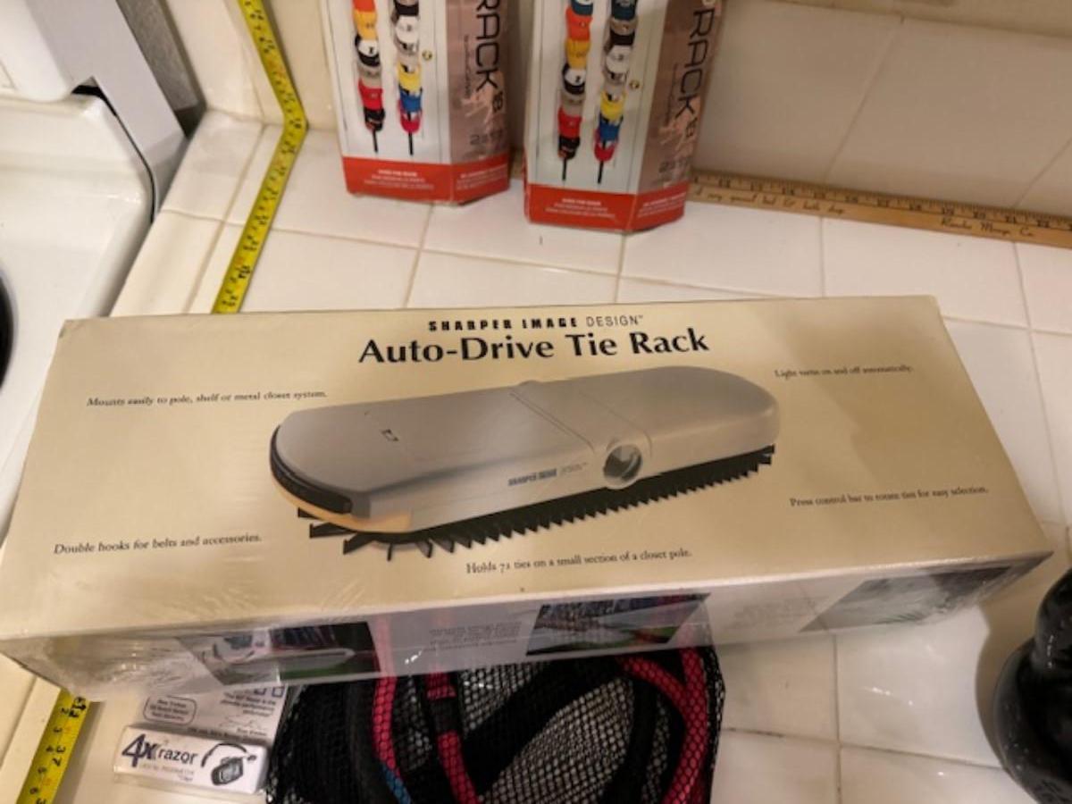 razor, pedometer, 2x 18 cap rack by perfect Curve, sharper image design auto drive tie rack, CAP 15lbs kettleball resistance band.