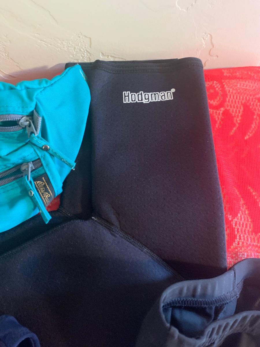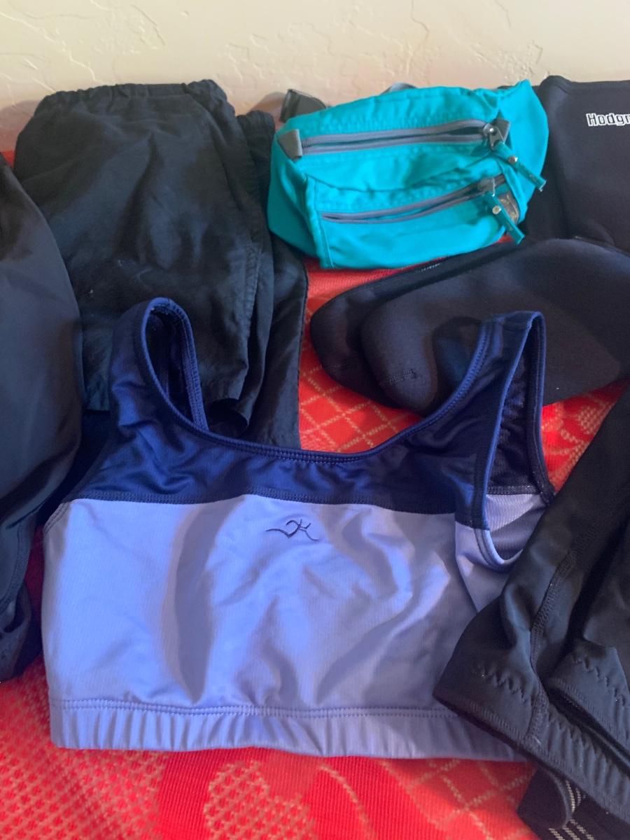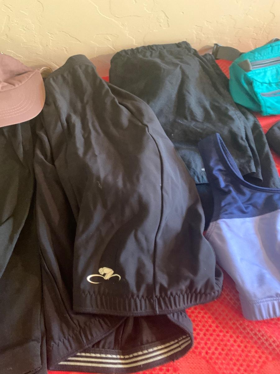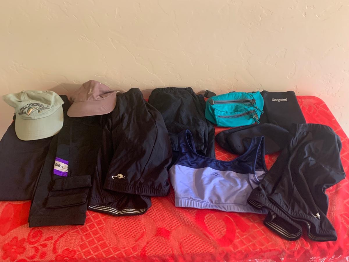 Includes J Crew, Early Winters, padded cycling shorts, Hodgman neoprene booties, Eddie Bauer fanny pack, and hiking and fishing hats