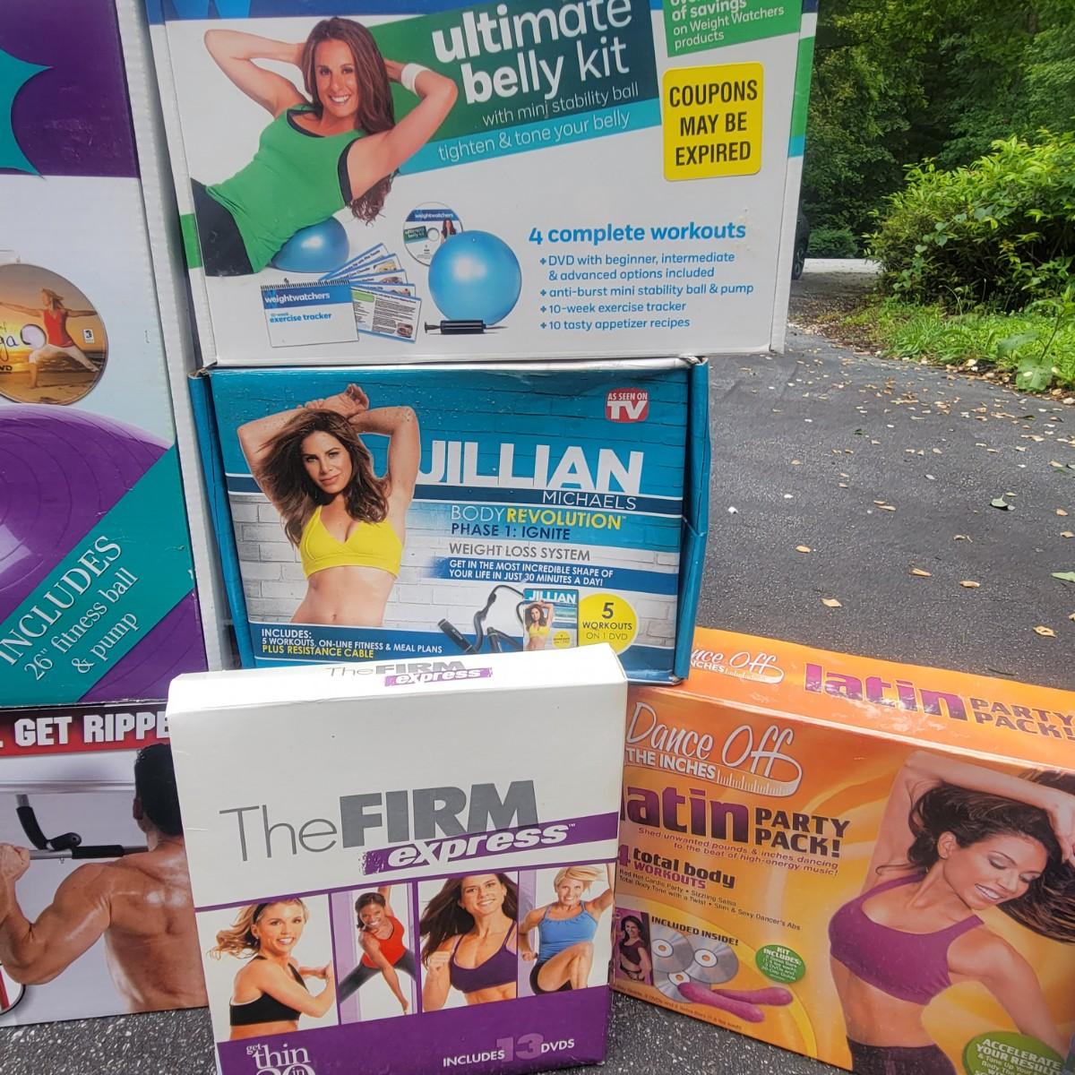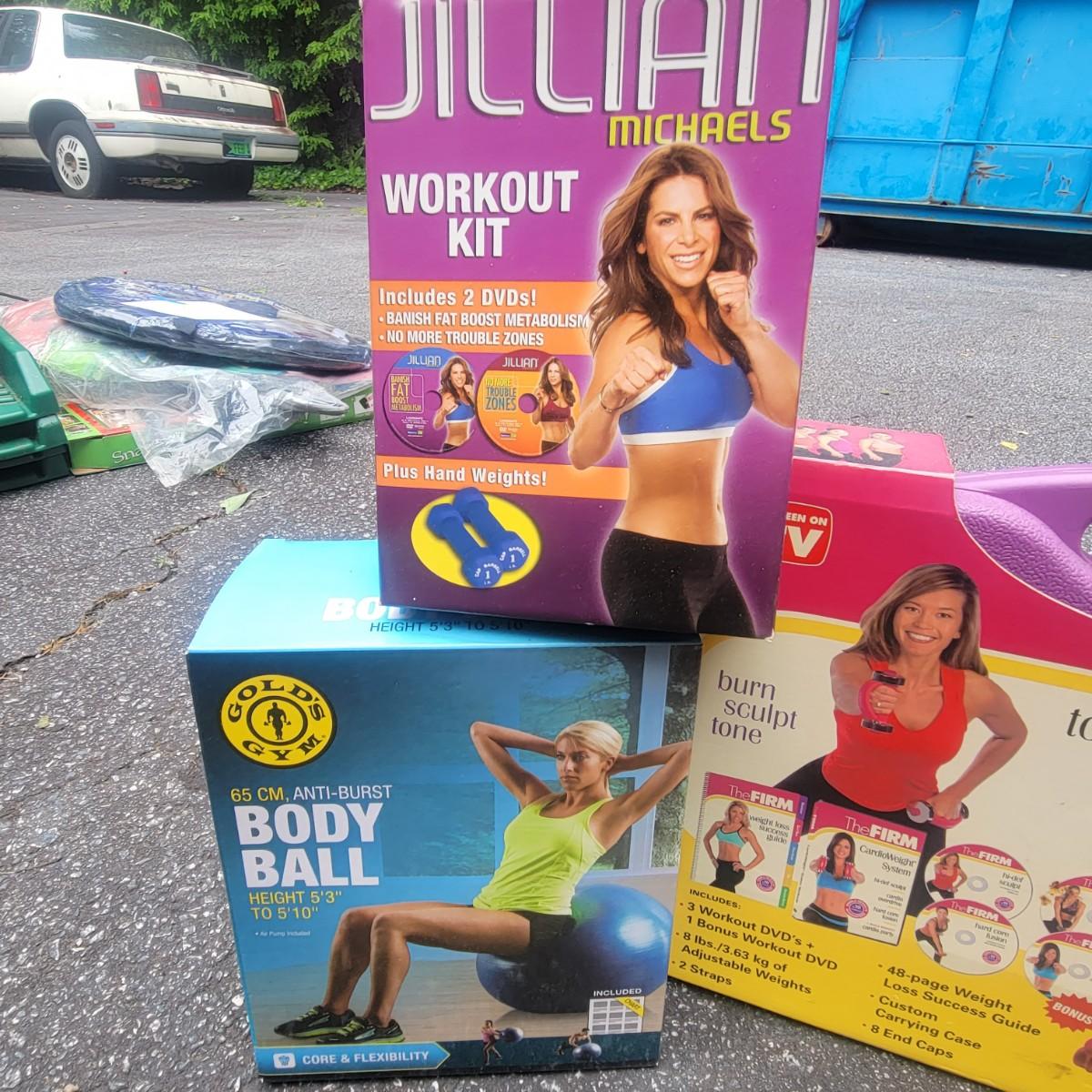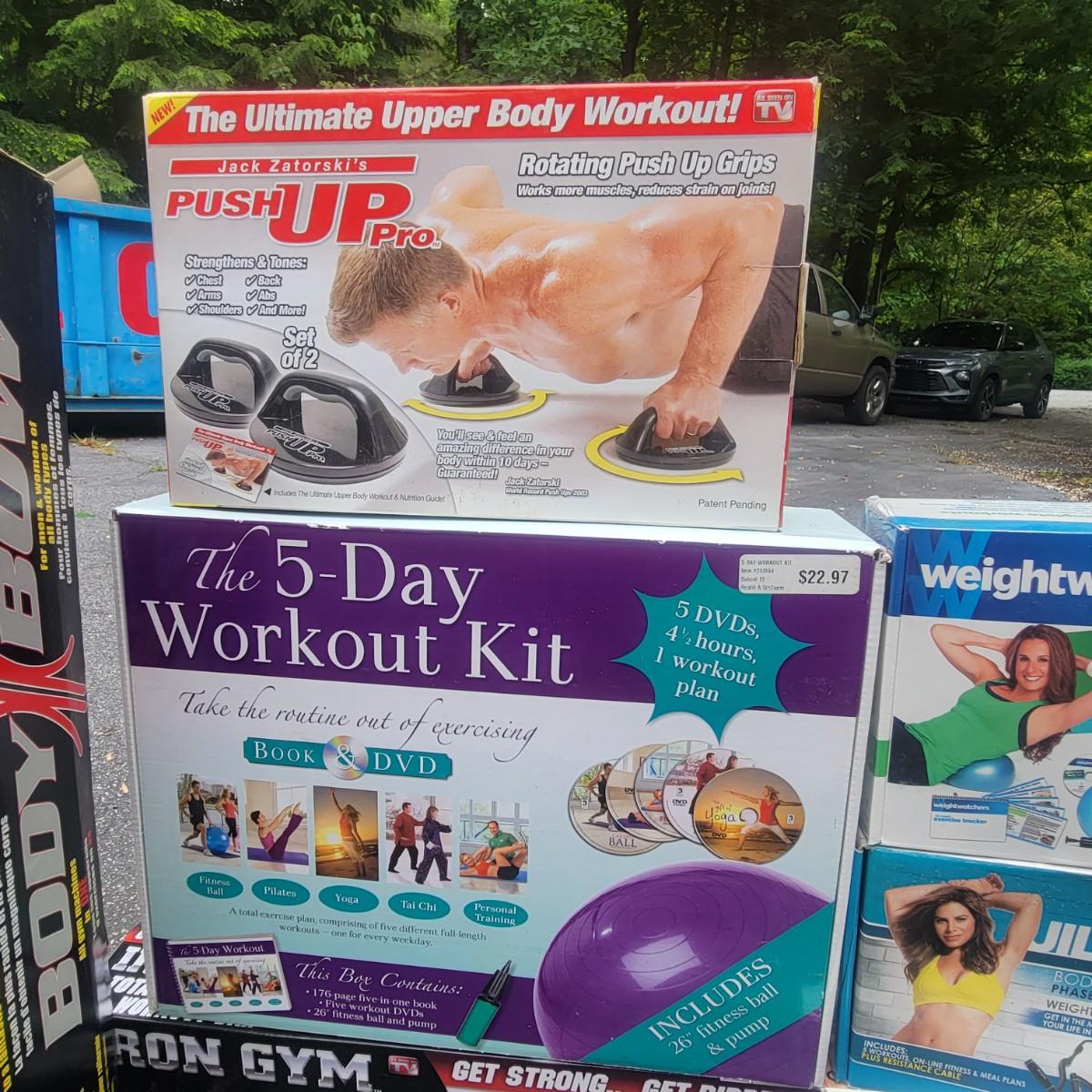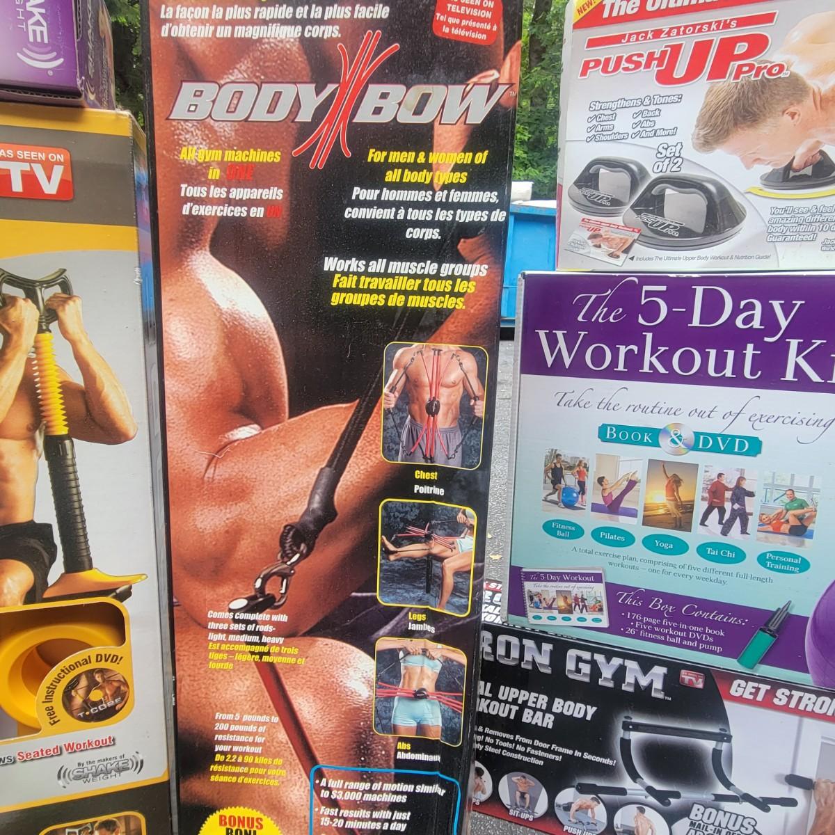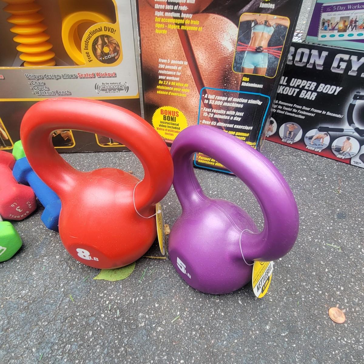A large assortment of workout equipment, kits and weights. Includes T Core system, shake weight, body bow kit, push up pro, five day workout kit, iron gym and more. Also has a 5lb and 8lb kettlebells, three 3lb weights and two 2lb weights. Local pickup only