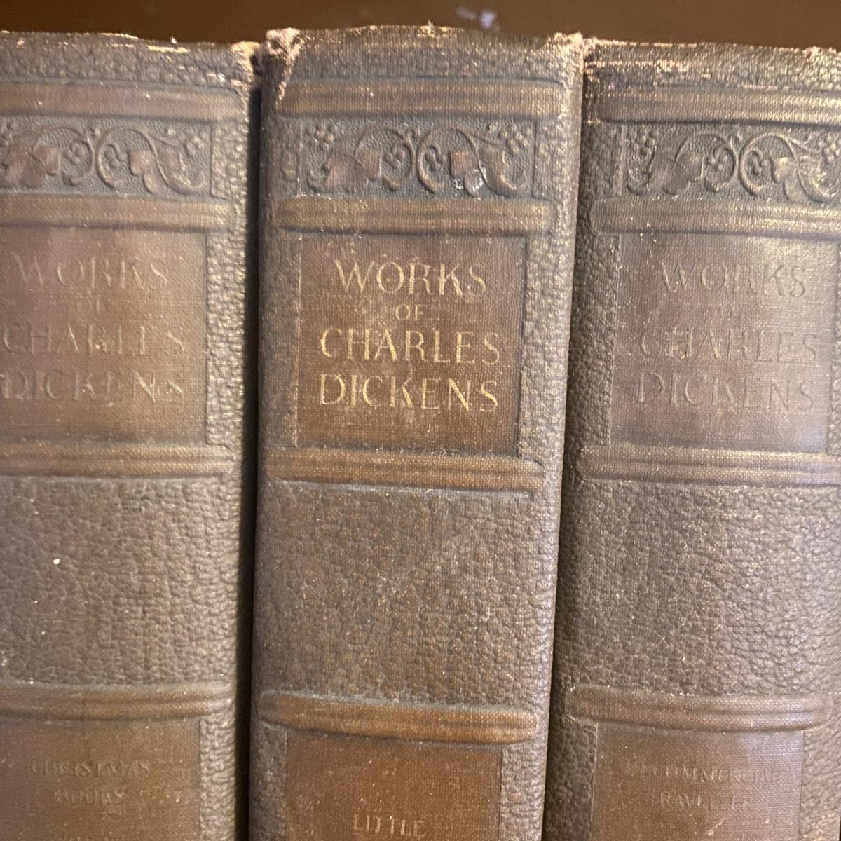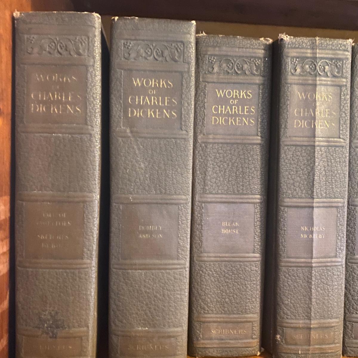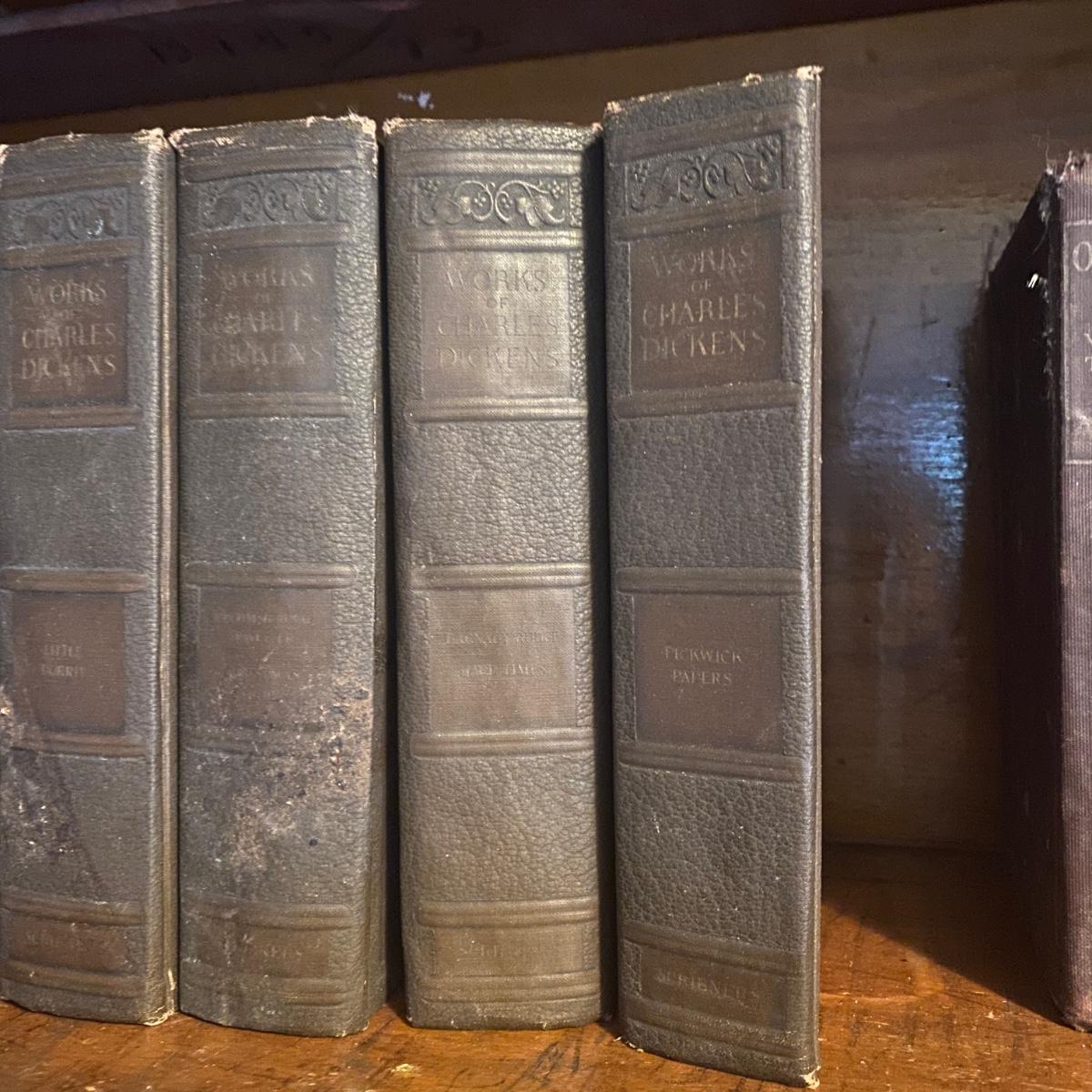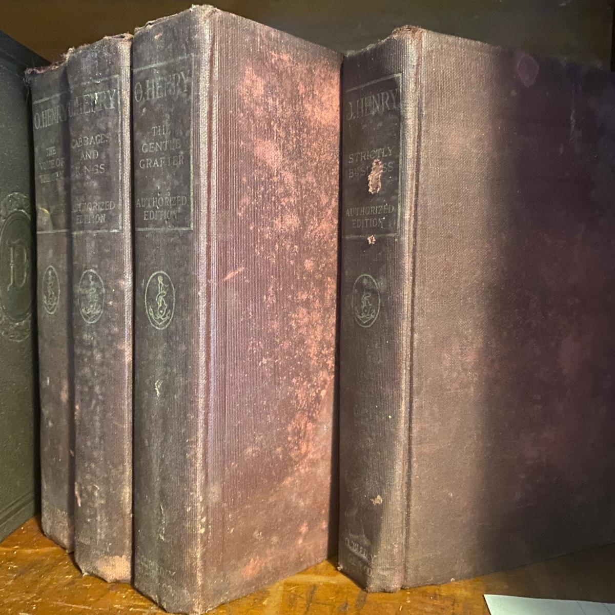 Lot includes 11 volumes of Works by Charles Dickens published in 1924. Dark worn covers show age. Also includes five volume set from 1919 and a worn five volume set from 1925 both by O.Henry. The worn cover set includes Strictly Business, The Gentle Grafter, Cabbages and Kings, Rolling Stones and The Voice of The City. Outside covers in worn set are in poor shape. Paper is fine. All volumes show signs of age. Shipping available