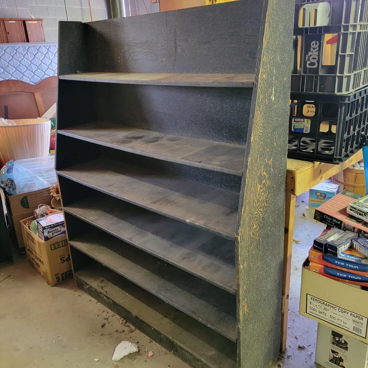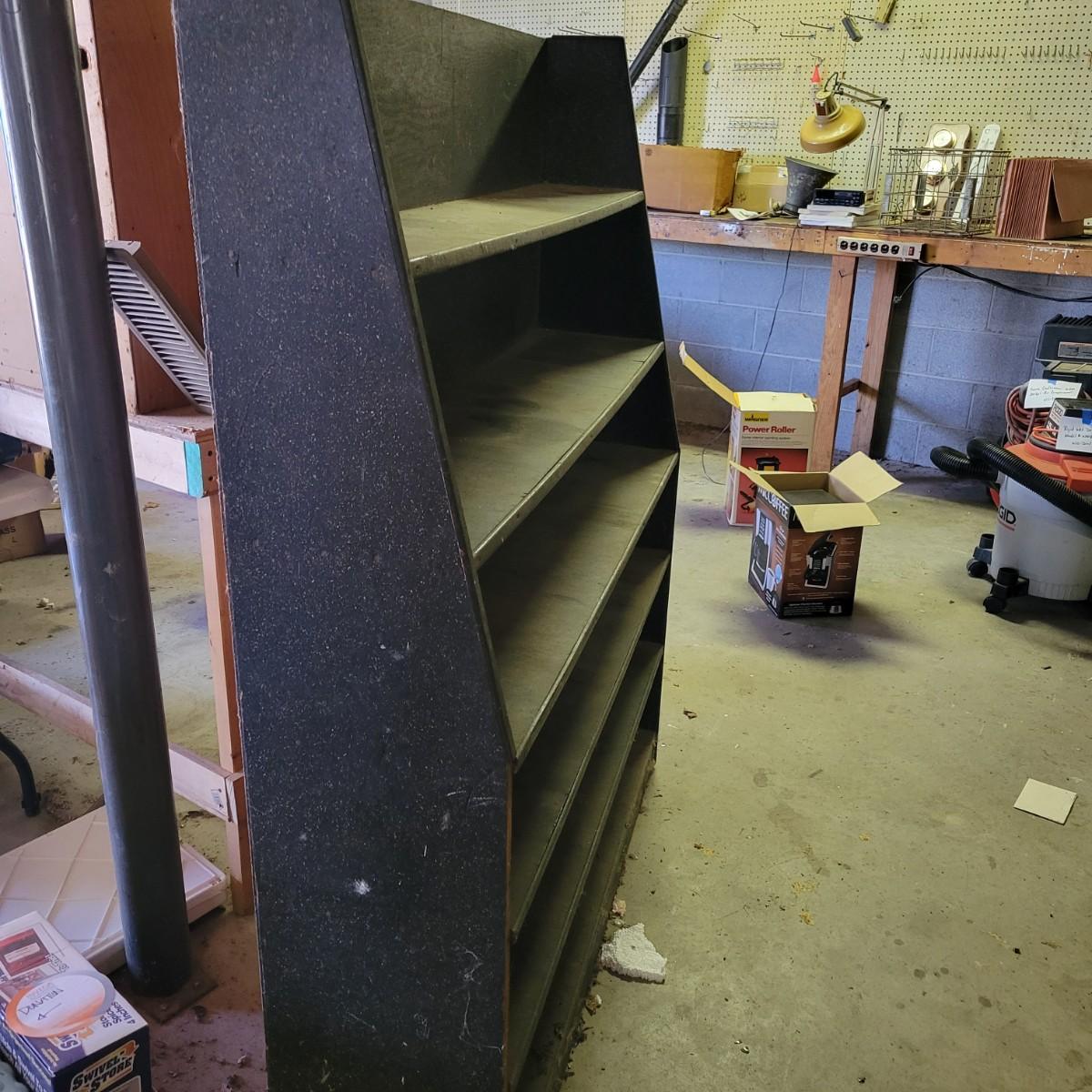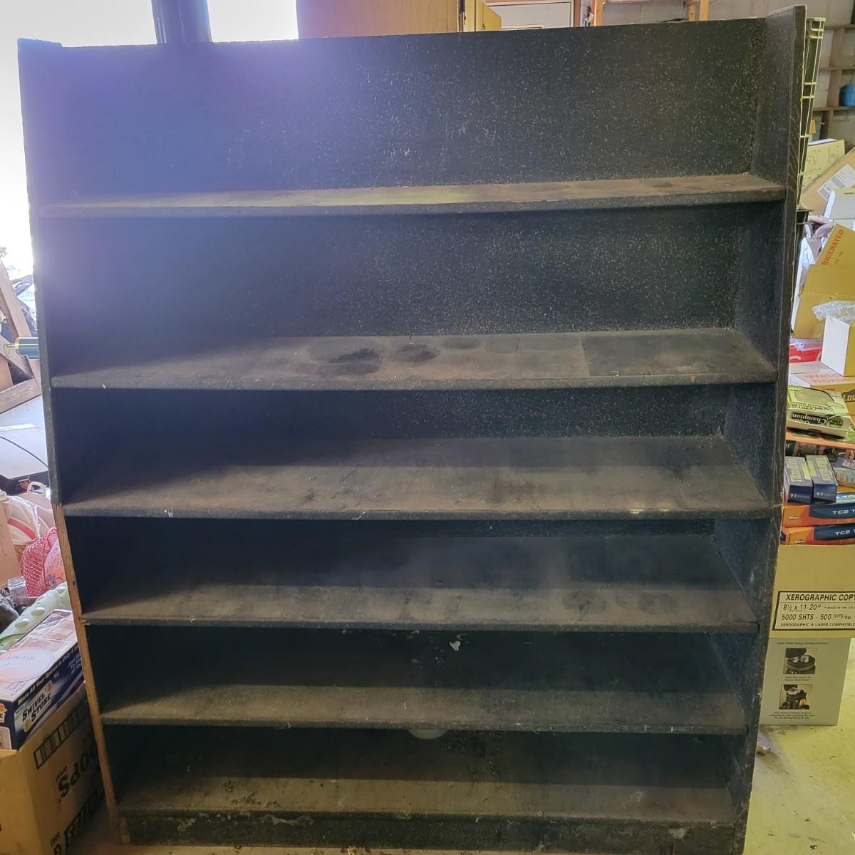 A black shelving unit perfect for a workshop. It has five shelves and measures approximately 49.5" x 12" x 60"H. Local pickup only. Winning bidder must bring assistance to help move and load this item due to its weight and/or size.
