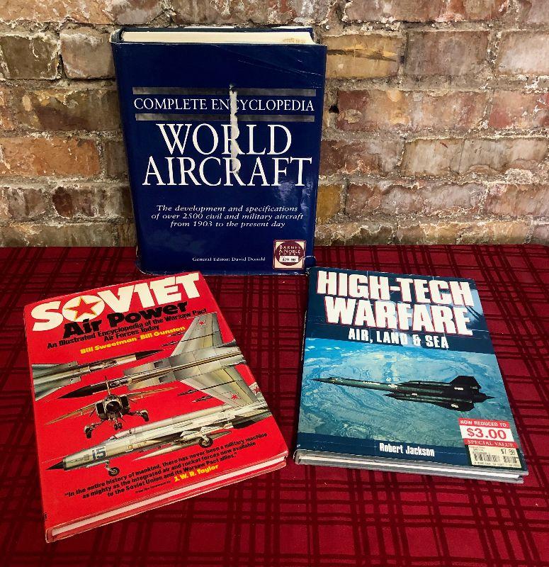 Three coffee table books including the Complete Encyclopedia of WORLD AIRCRAFT...Soviet Air Power and High-Tech Warfare..Air, Land & Sea....Excellent condition...