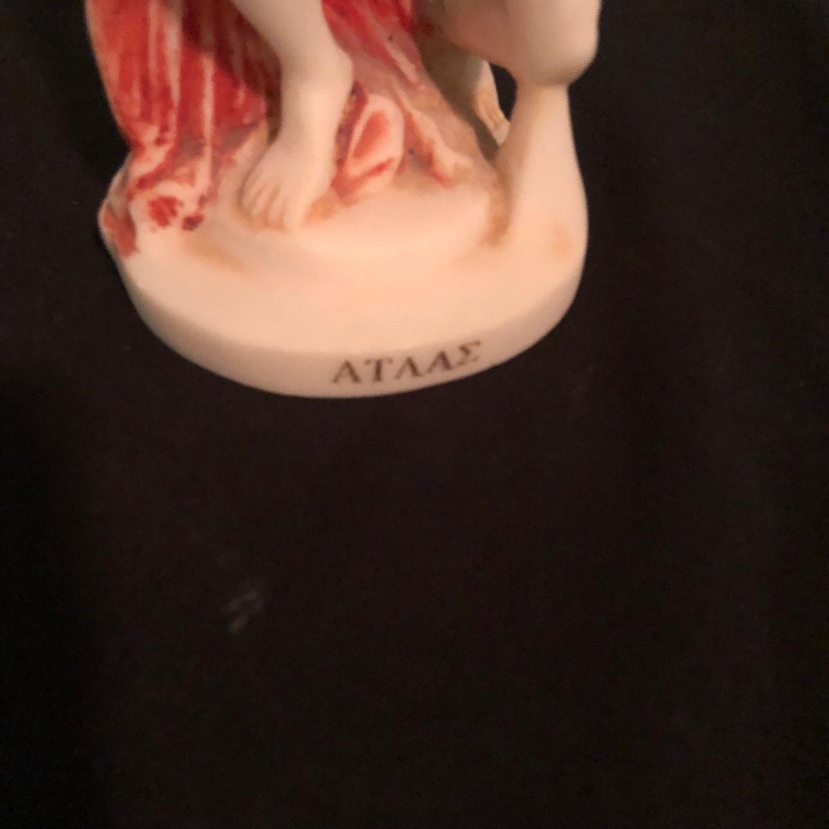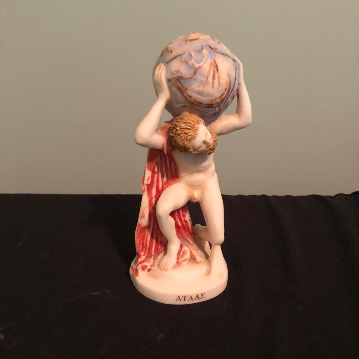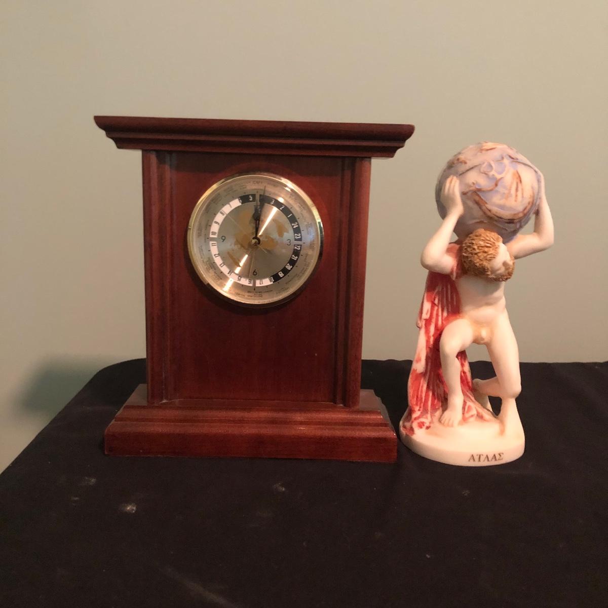 Lot includes wooden world clock that worked when tested and a ceramic Atlas figurine.