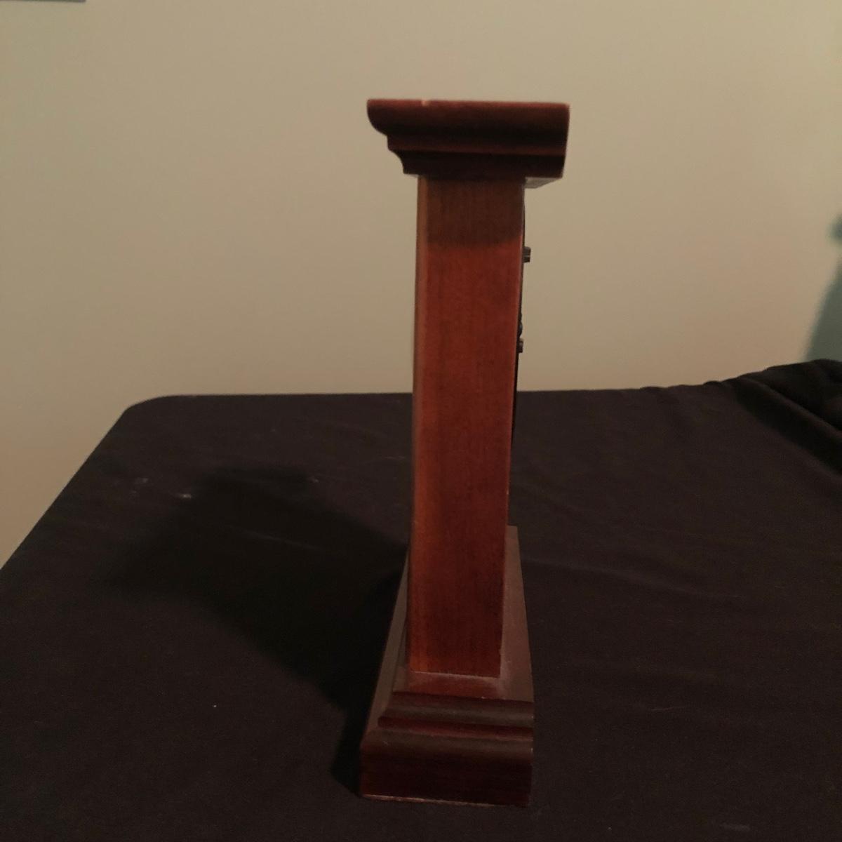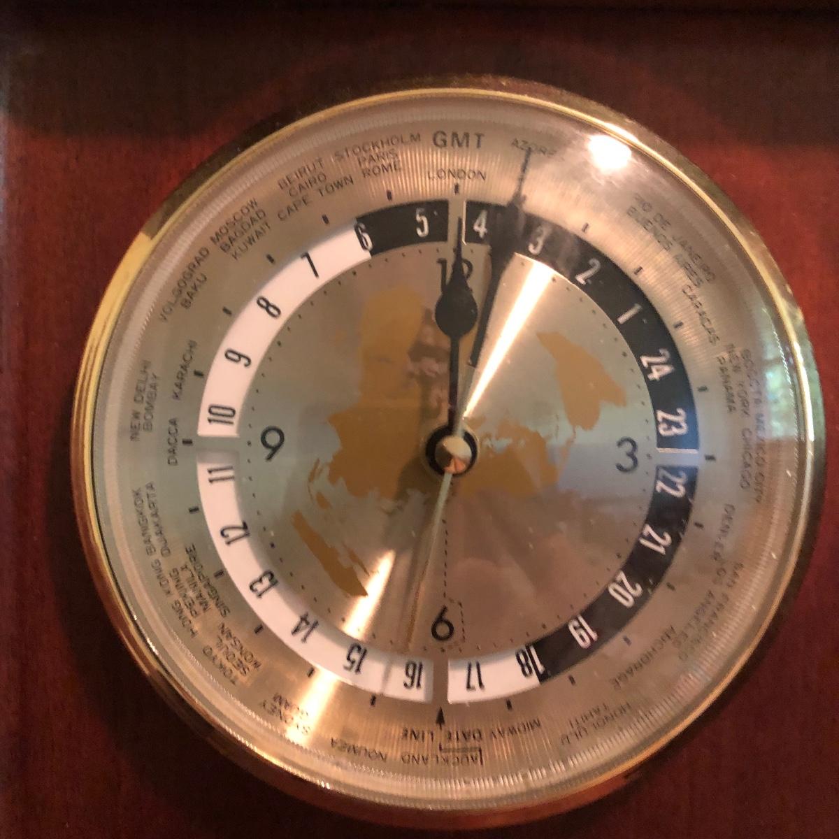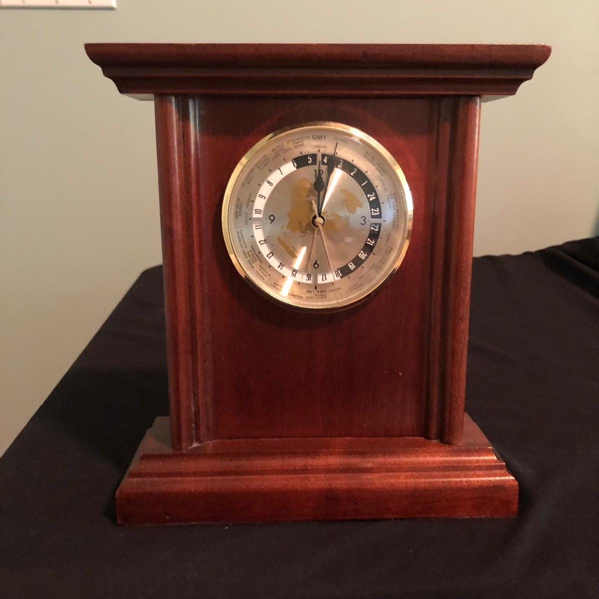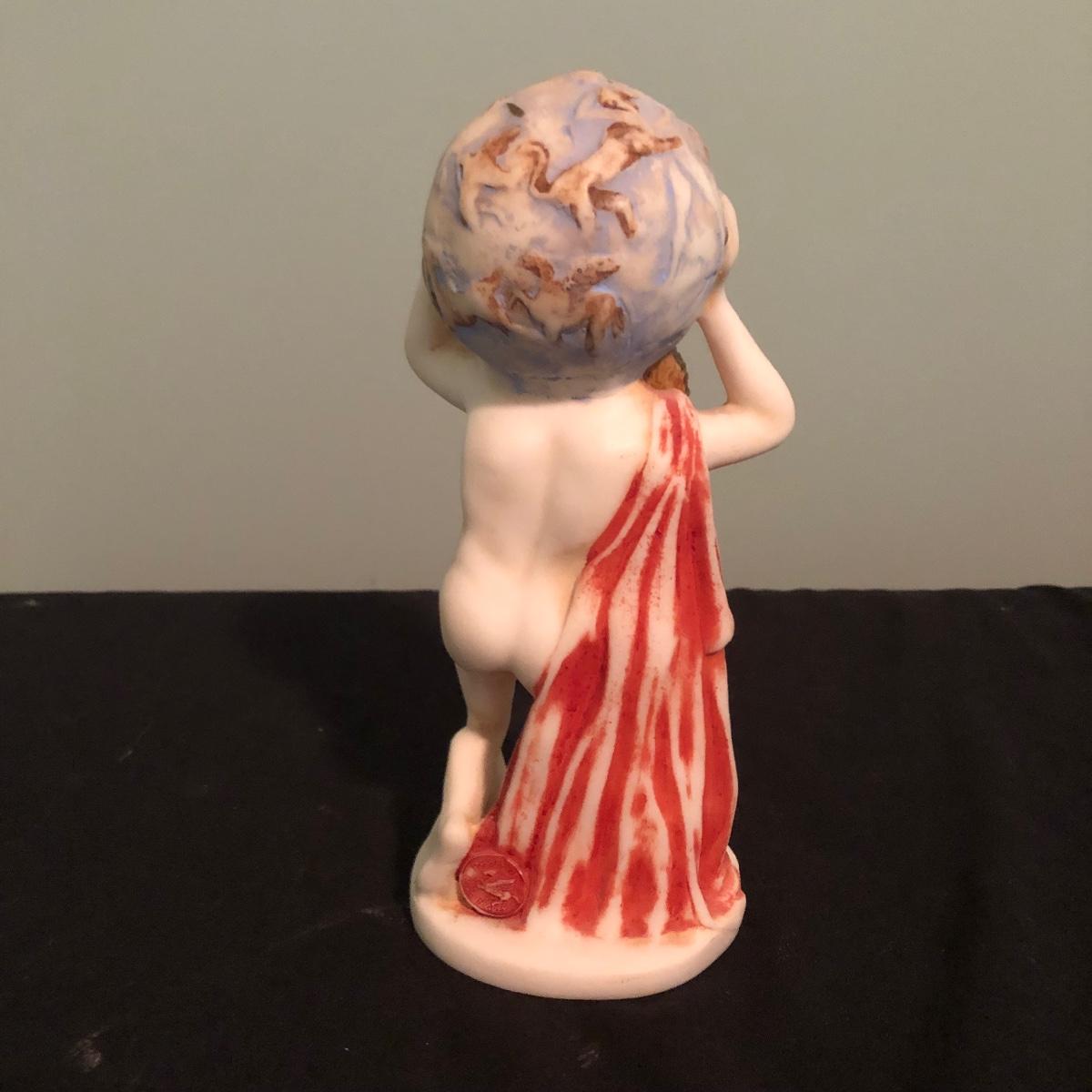 Lot includes wooden world clock that worked when tested and a ceramic Atlas figurine.