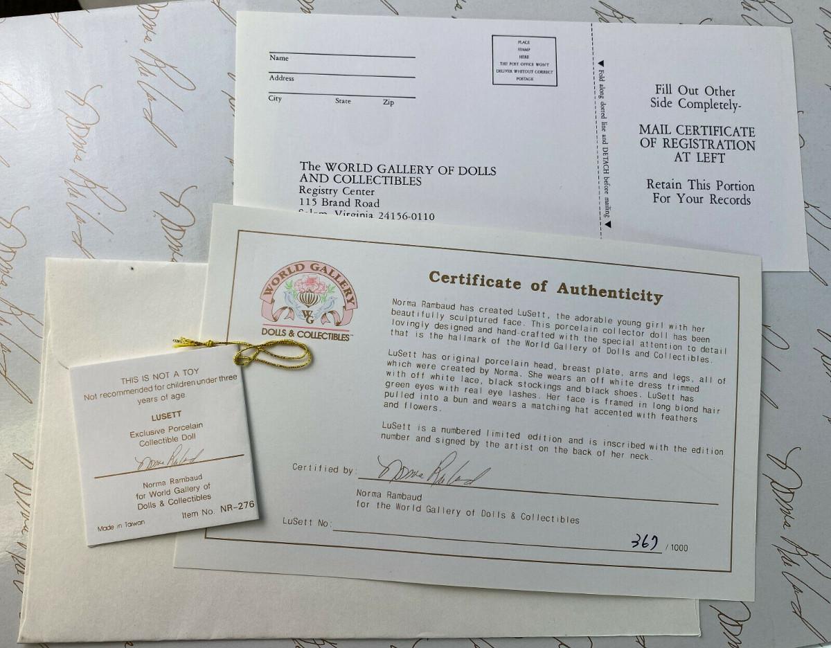 From a collector's estate..new condition here is a large 30" porcelain doll named LUSETT by artist Norma Rambaud for the World Gallery Collection..Hand numbered, limited edition #367/1000...Circa 1996“🦆