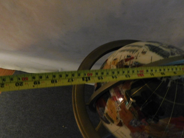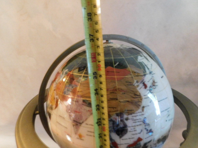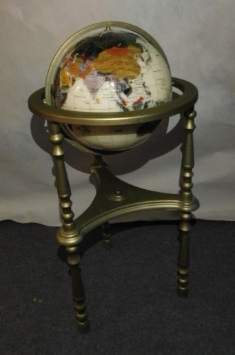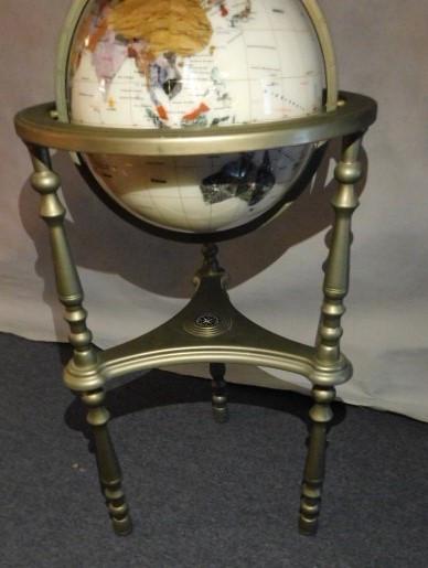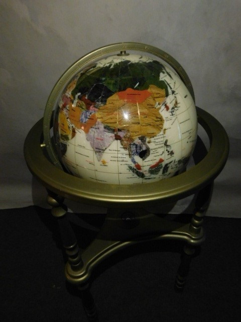 World Globe with Color Stone and Mother of Pearl Inlay Brass Stand 37"
