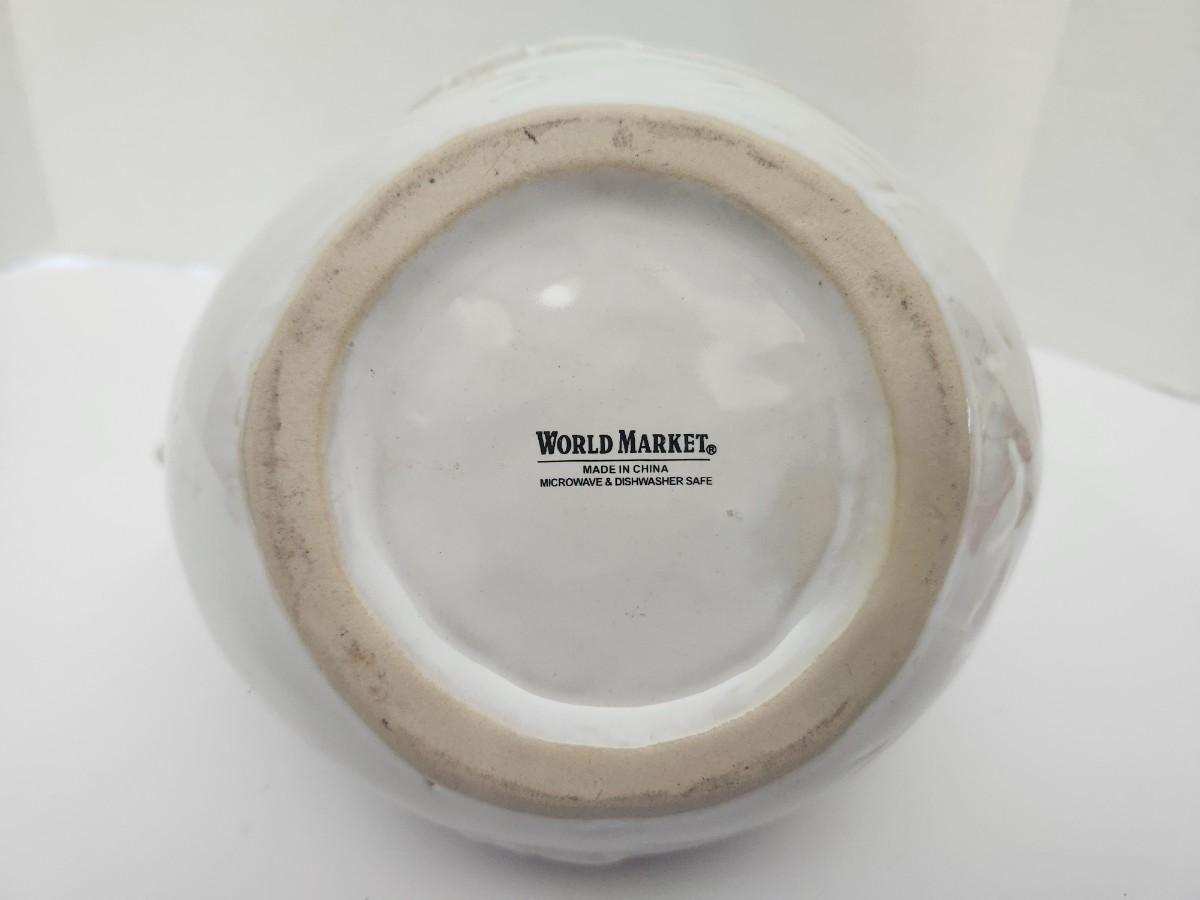 White glazed ceramic teapot in a figural bird form with raised feather detailing, curved handle, and fitted lid. Marked World Market on the underside and noted as made in China, microwave and dishwasher safe per manufacturer marking. Sculptural novelty teapot designed for functional use or decorative display. Sold exactly as shown.