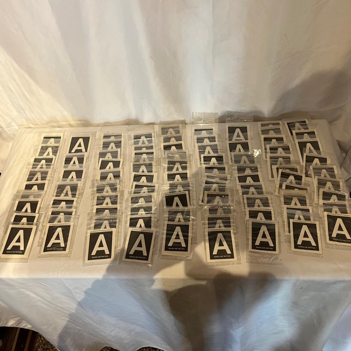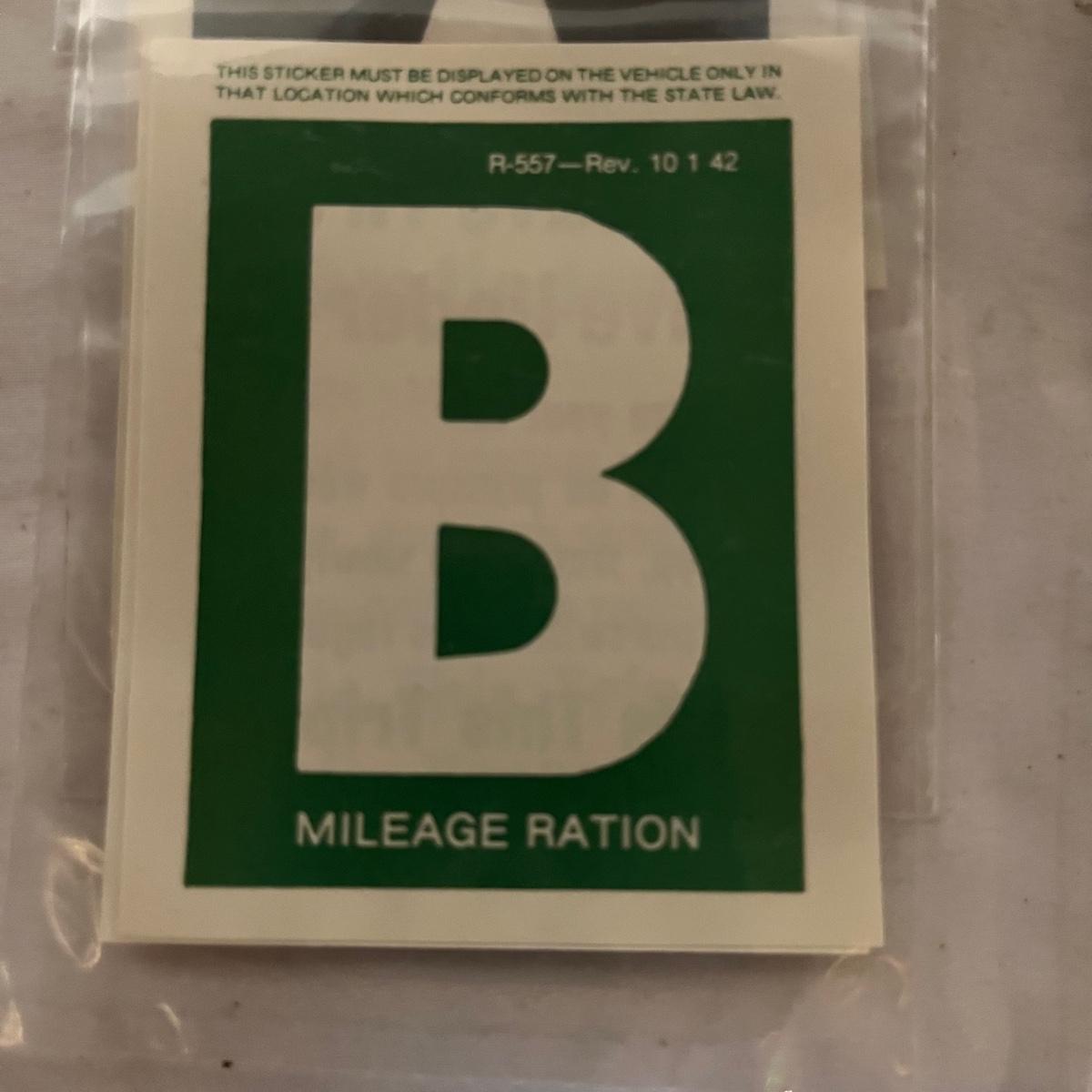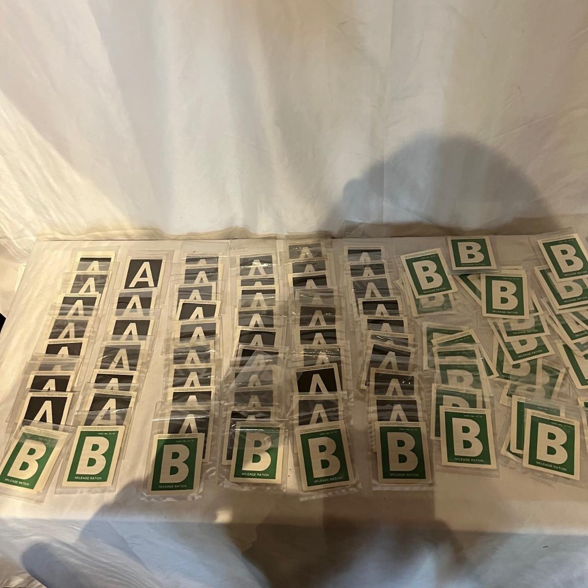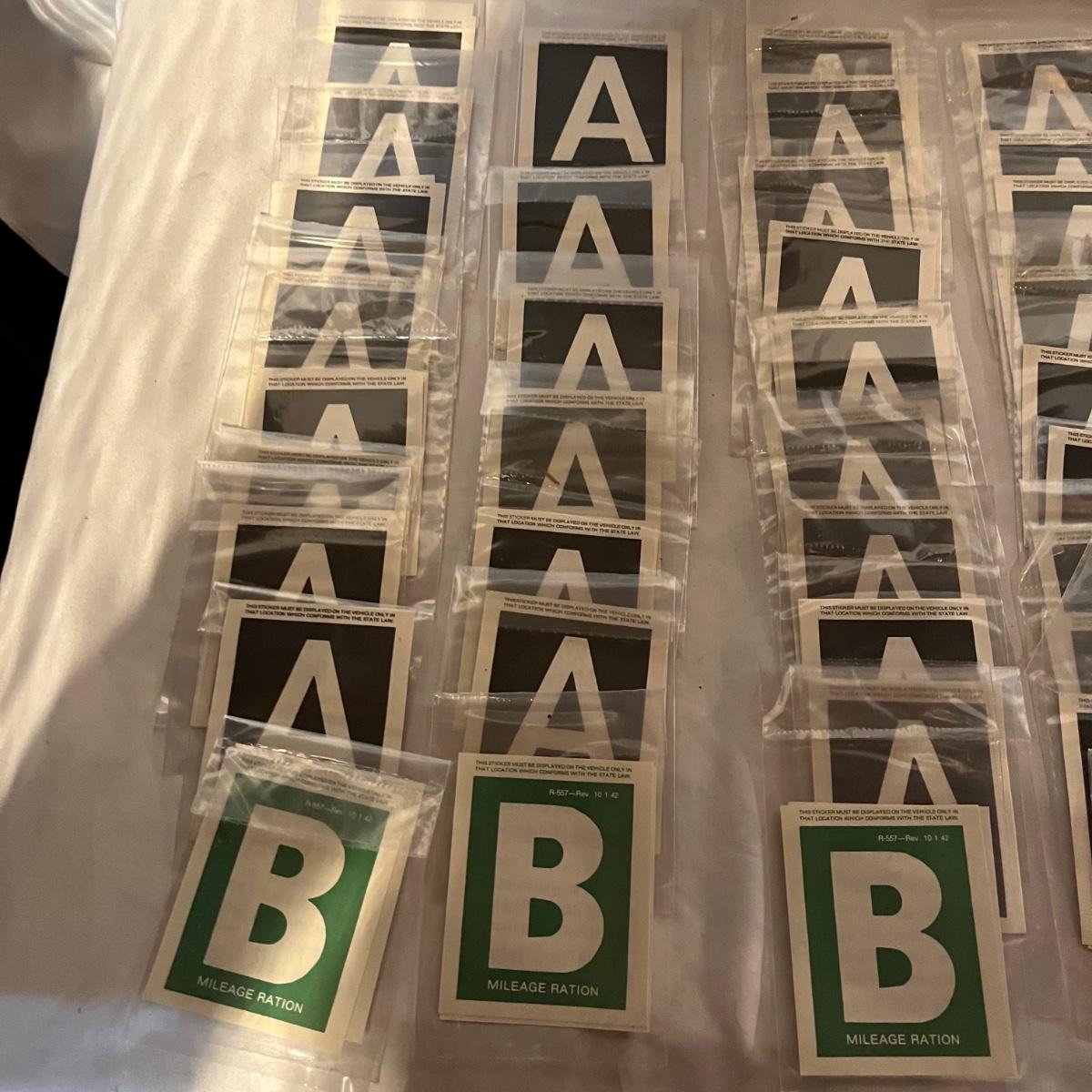 Lot includes over eighty A Gasoline & B Mileage Ration window stickers. Most are sealed in a plastic bag that contains one A and one B Sticker.