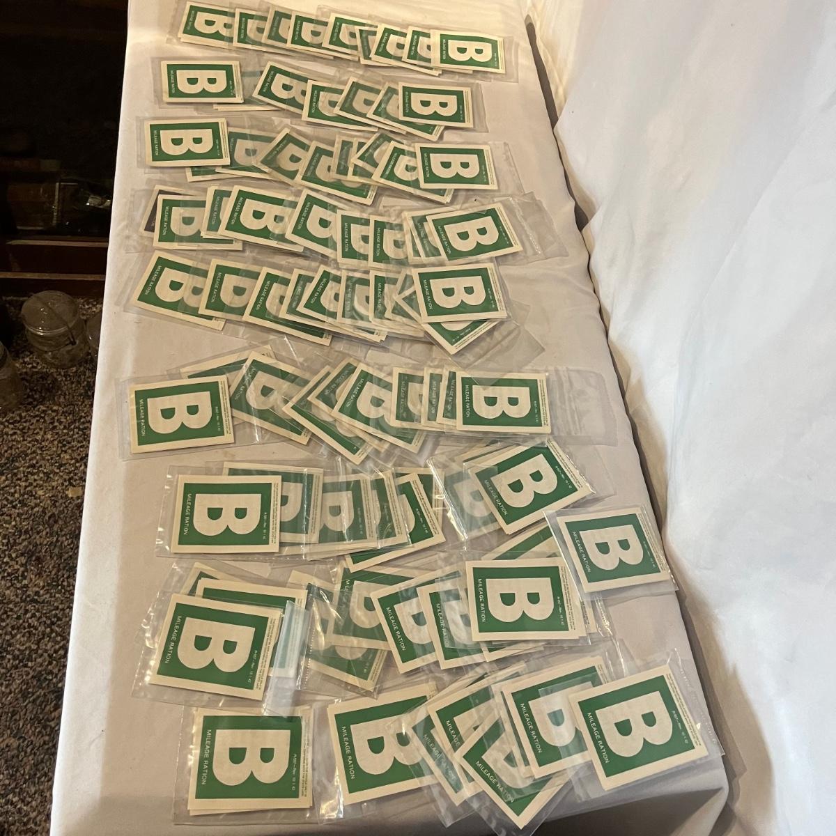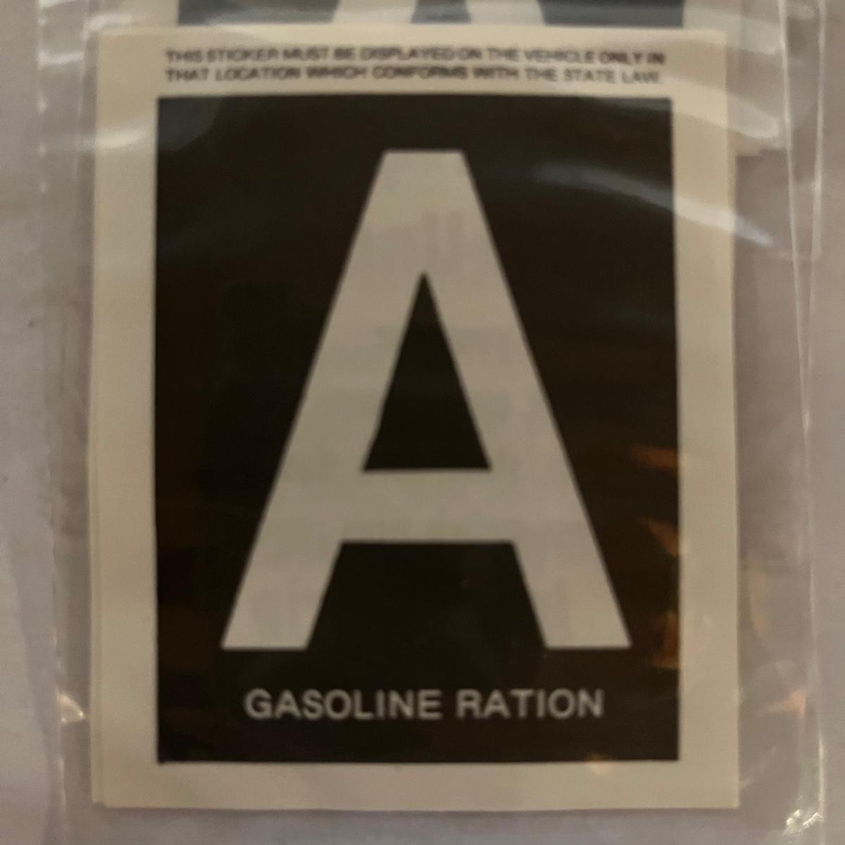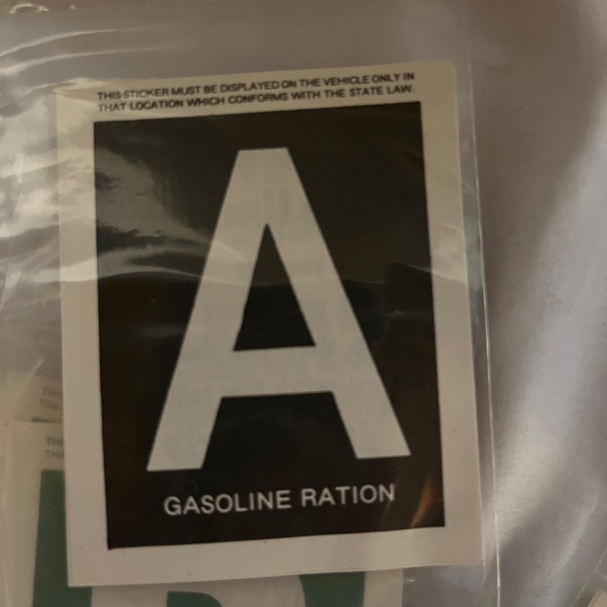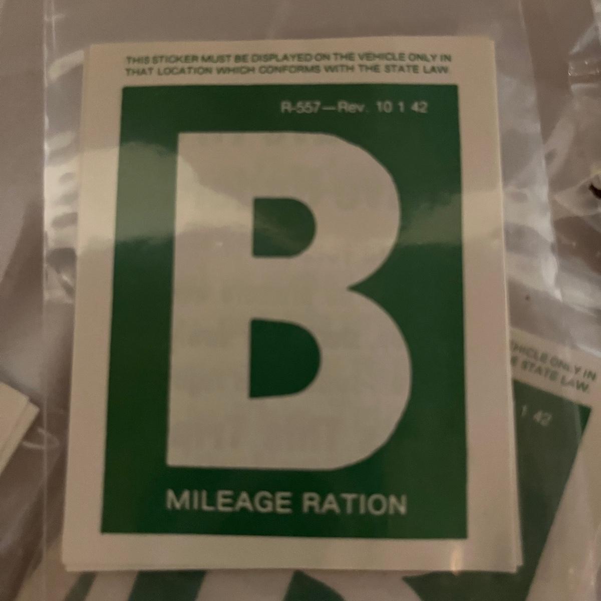 Lot includes over eighty A Gasoline & B Mileage Ration window stickers. Most are sealed in a plastic bag that contains one A and one B Sticker.