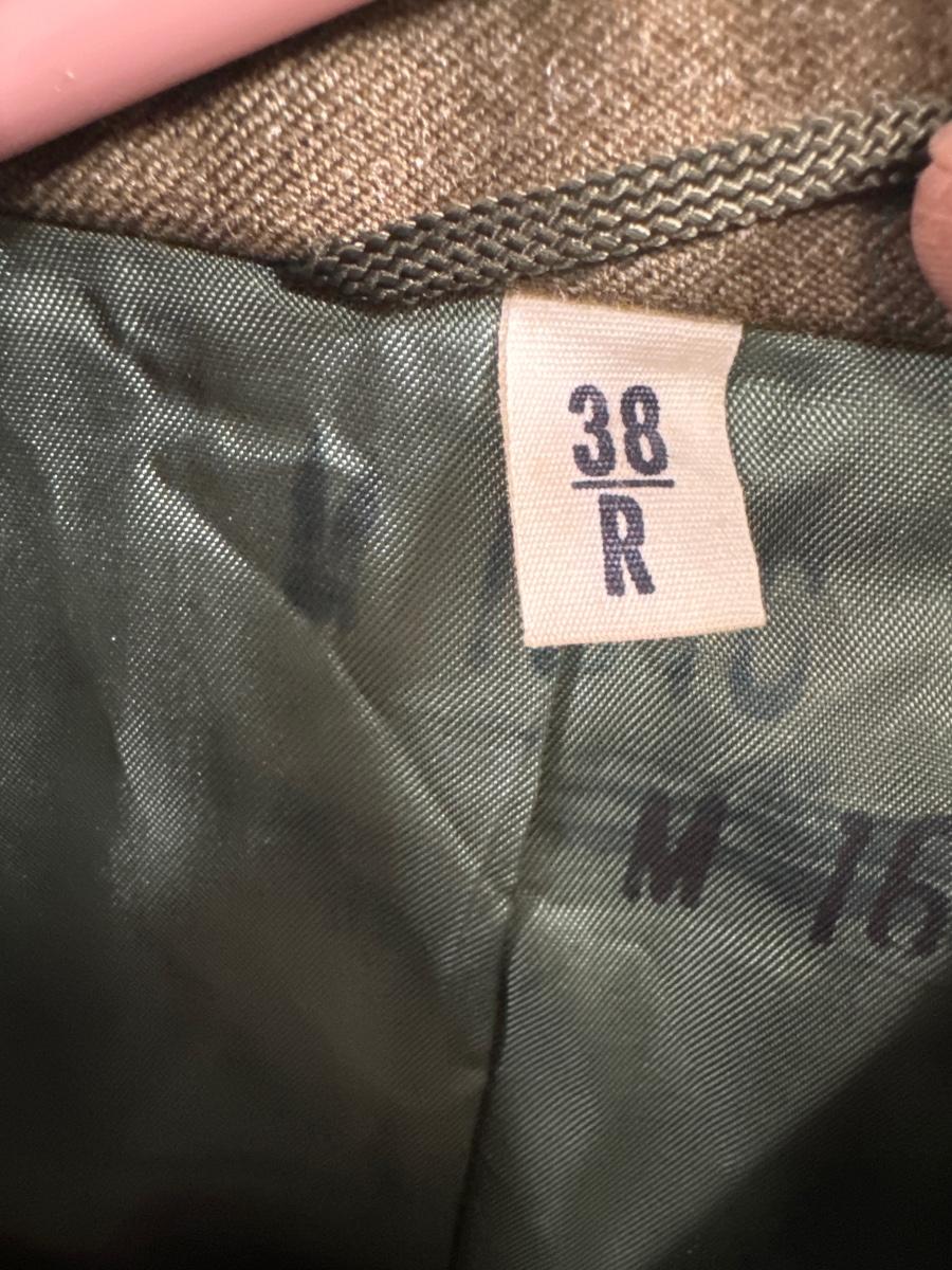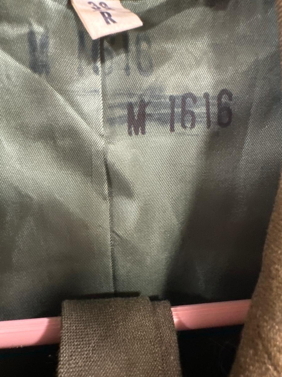 The patch on the left sleeve is for the seventh army unit and the insignia is a private class E2. The pictures make it look light green, but it’s not. It is the normal hunter green color and is in great condition.