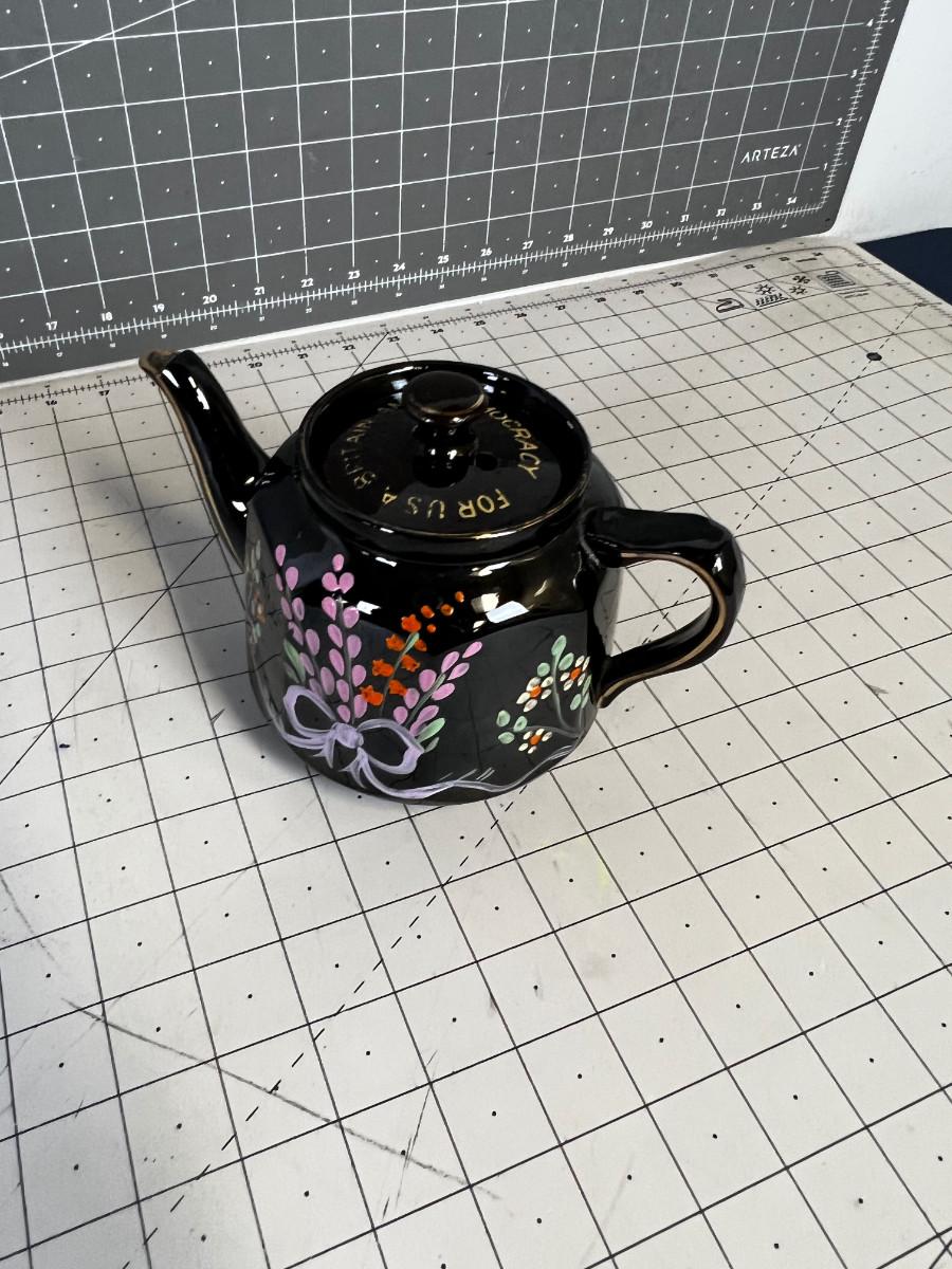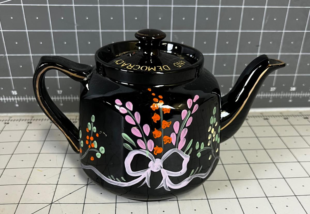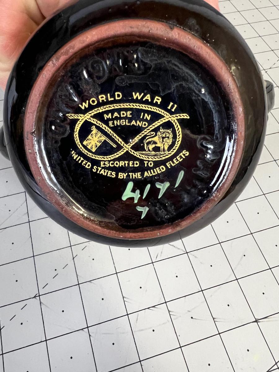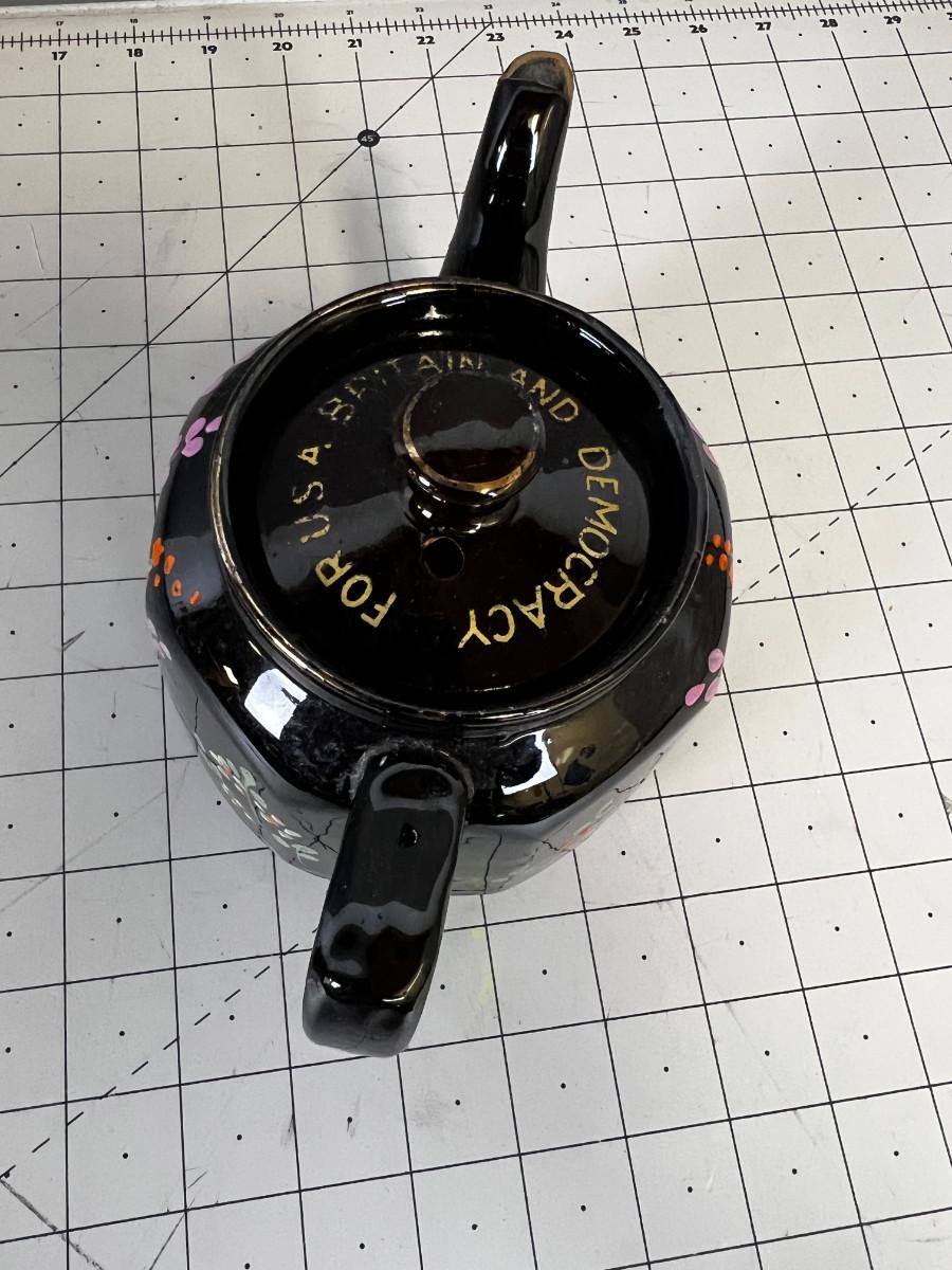 World War II Tea Pot Lid says, " For USA, Britain and Democracy"