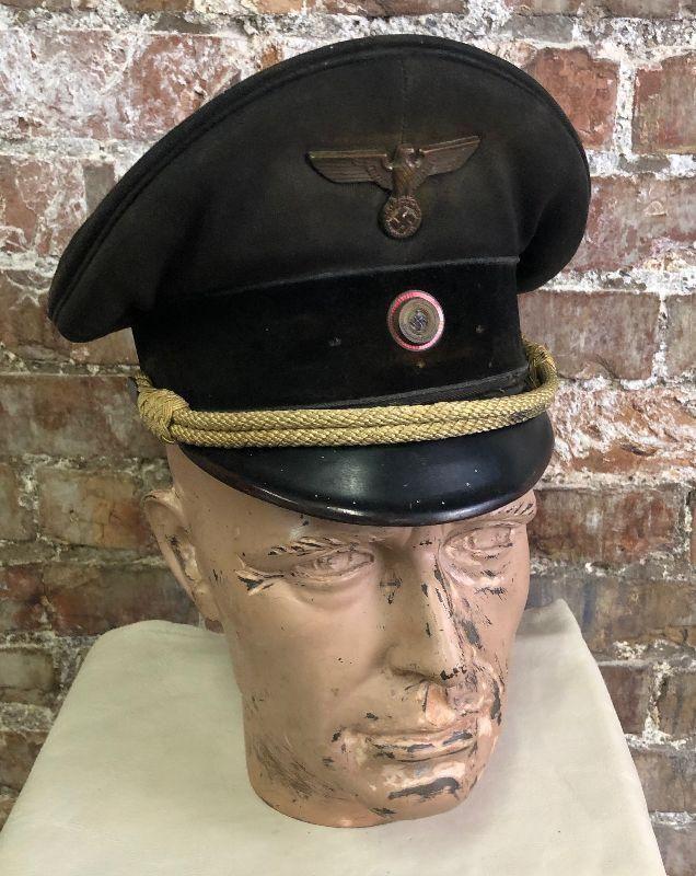 World War Two German Political Officers Visor Cap Authentic war memorabilia. US GI war trophy. Hat shows wear and some damage. The closet match we could find is a political officers cap but not 100 % sure. Color of the cap is a dark brown. Shipping anywhere in the US for $14. I will consider offers on this>