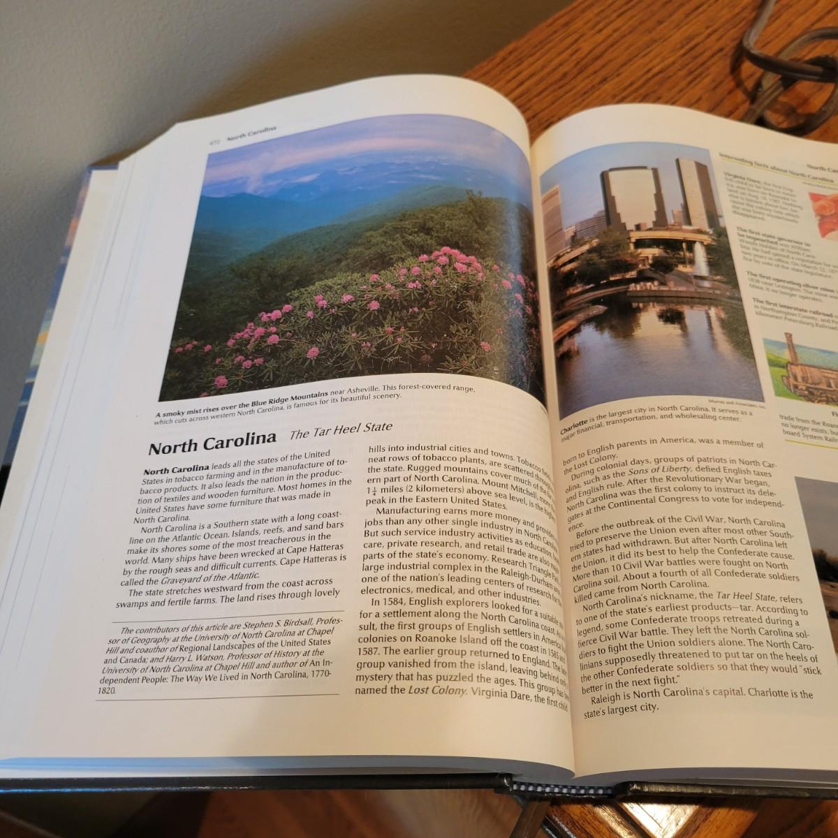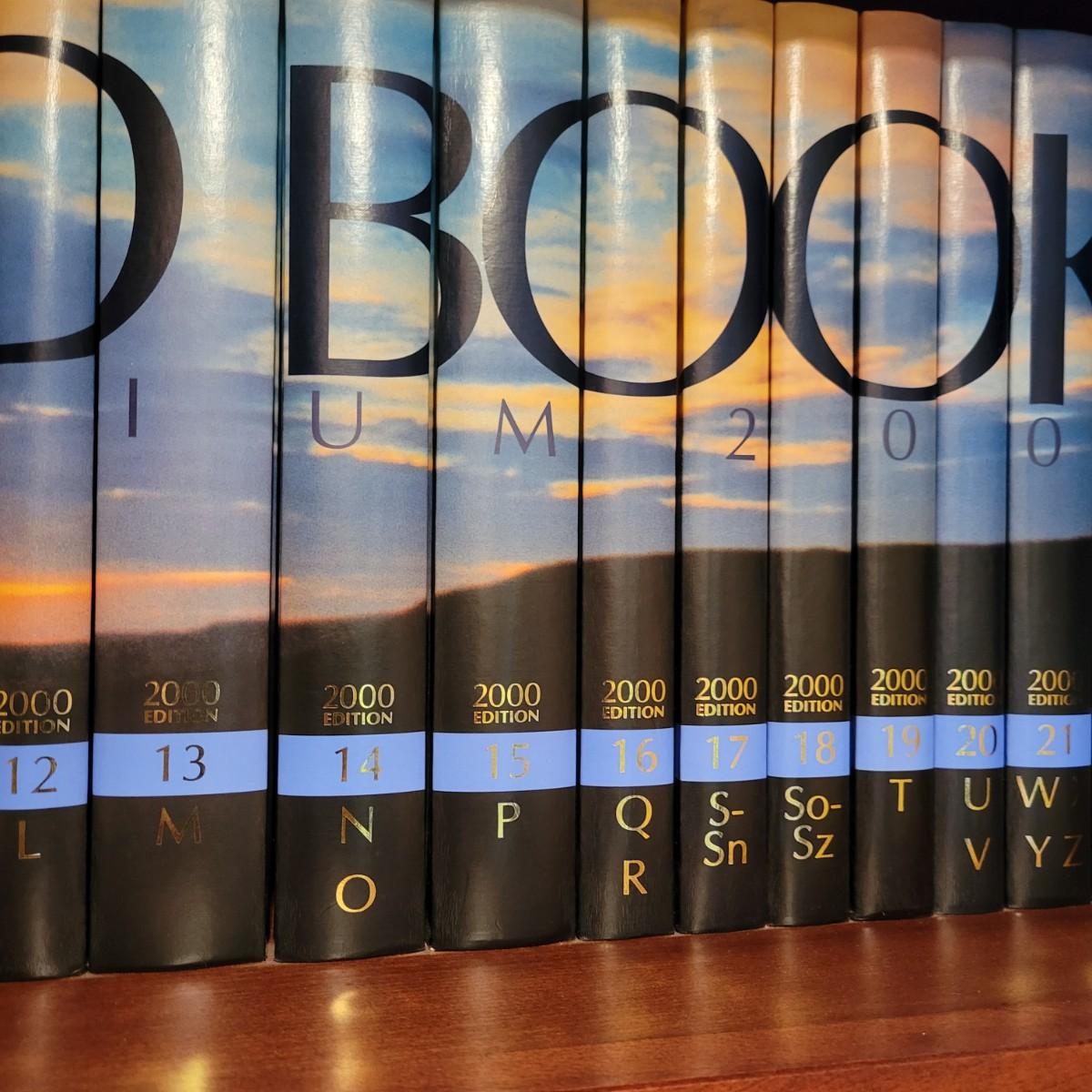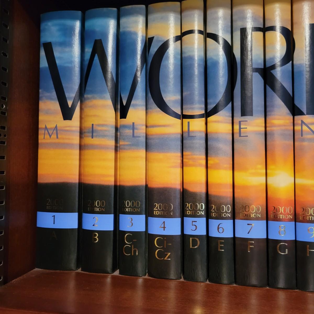 A complete set of World Book encyclopedias that have a decorative scene of a sunset on the spines. There are 22 volumes in the set. Shipping available,