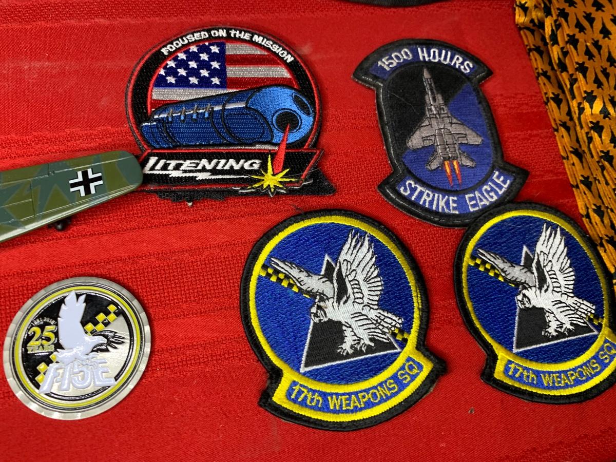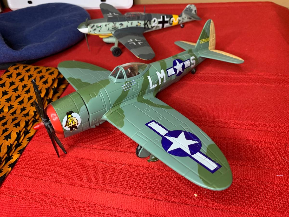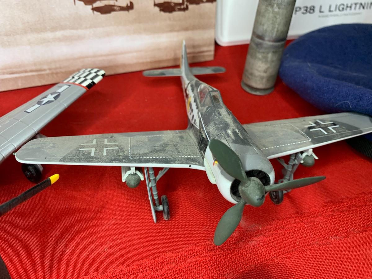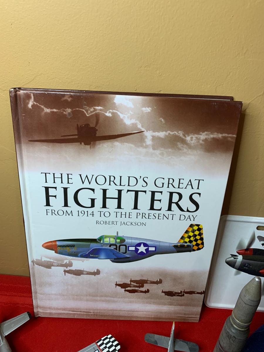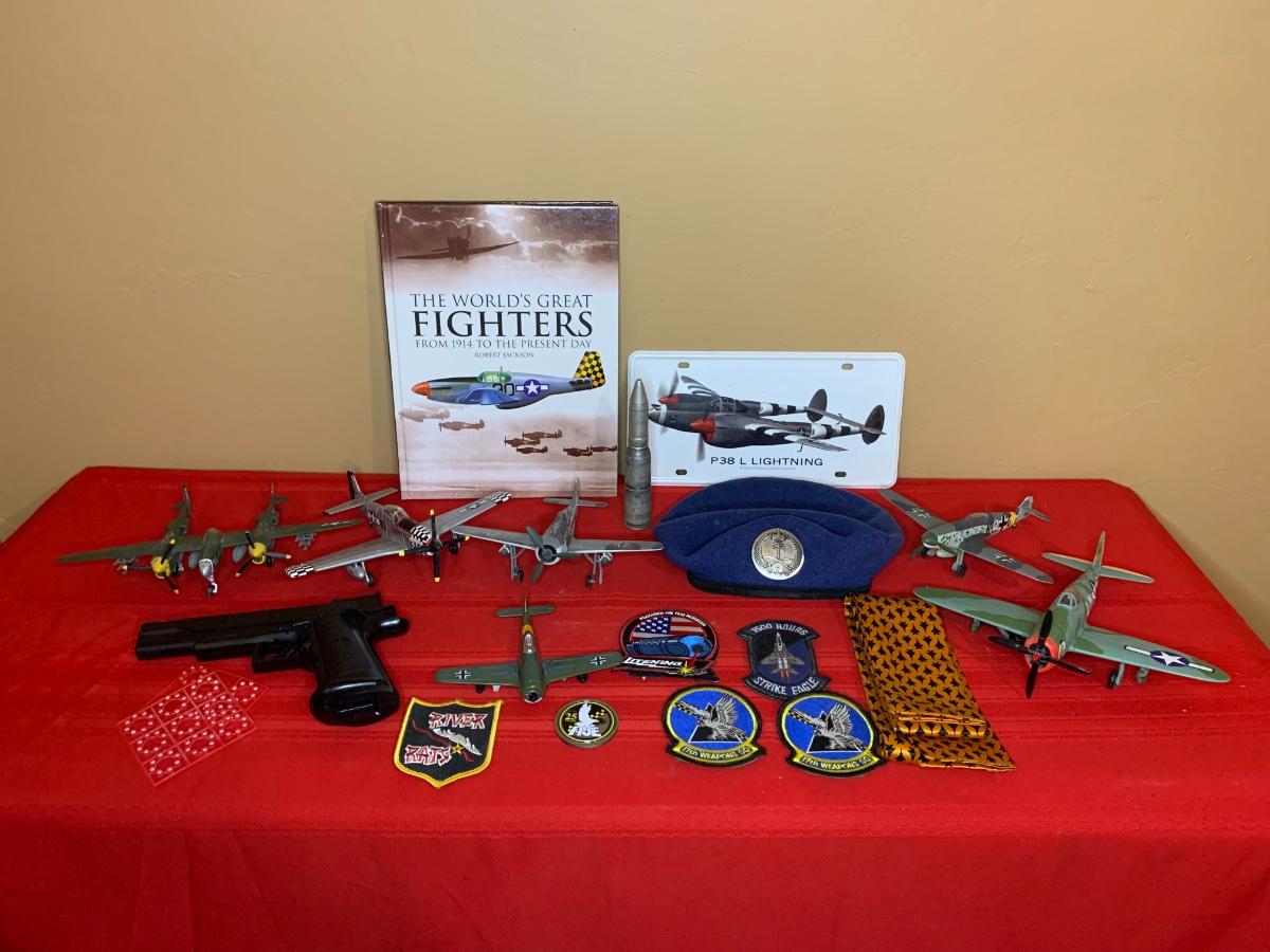 An assortment of die cast planes, BB gun, a 20 MM dummy round, patches, a fighter pilot tie, a squadron challenge coin, a book and more. Perfect for the aviation lover in your family!