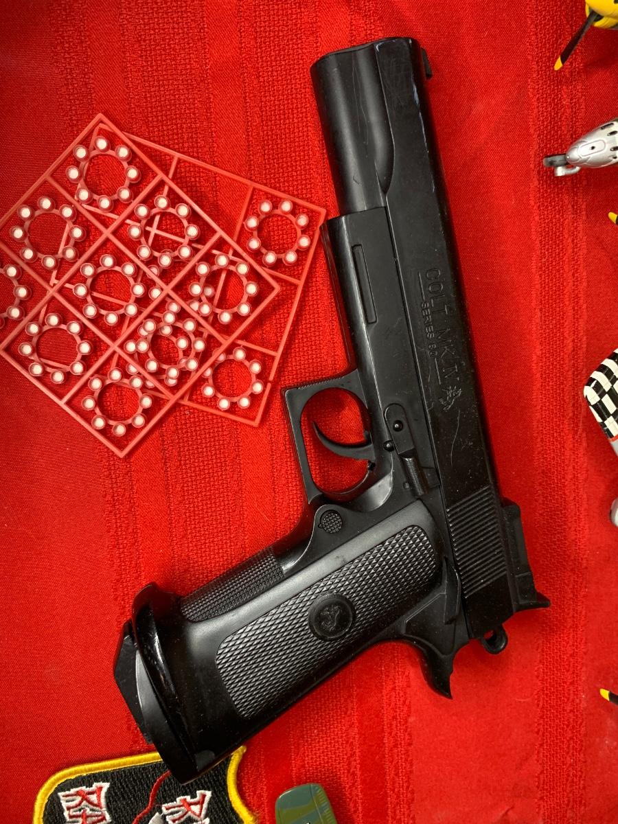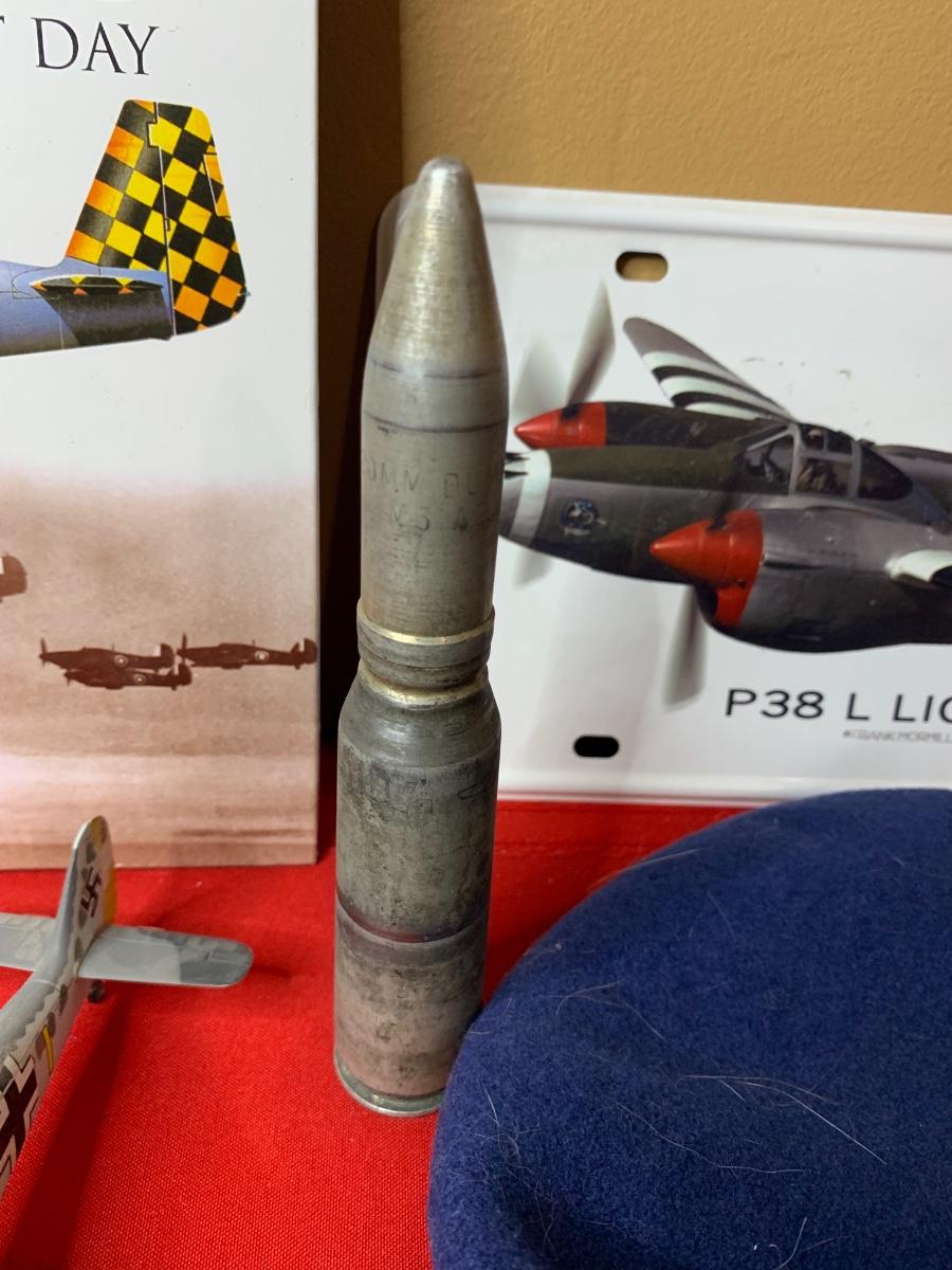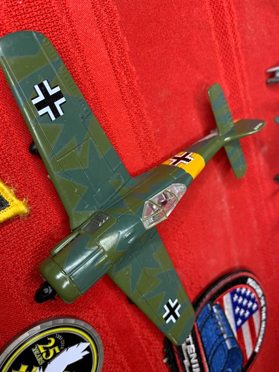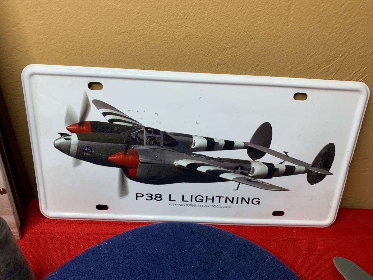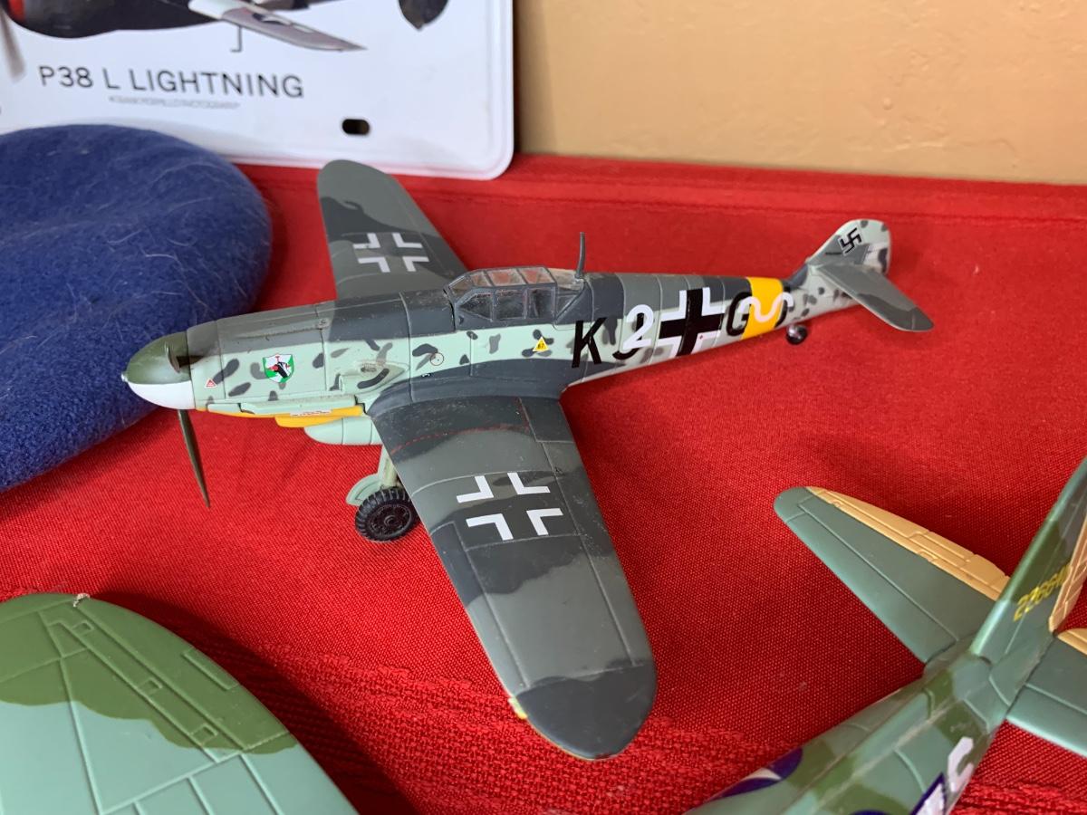 An assortment of die cast planes, BB gun, a 20 MM dummy round, patches, a fighter pilot tie, a squadron challenge coin, a book and more. Perfect for the aviation lover in your family!