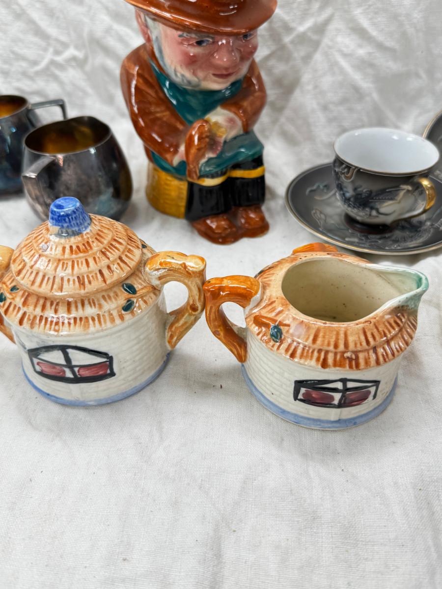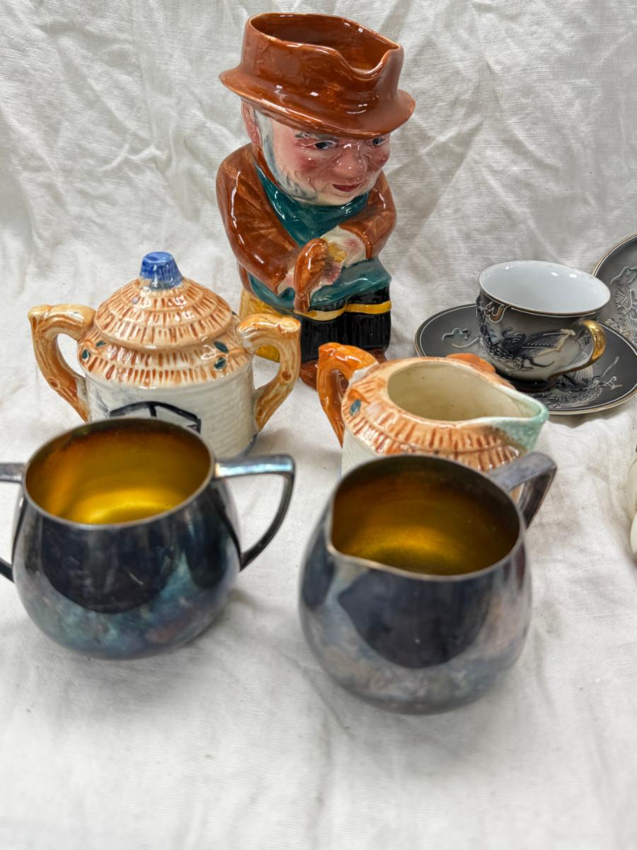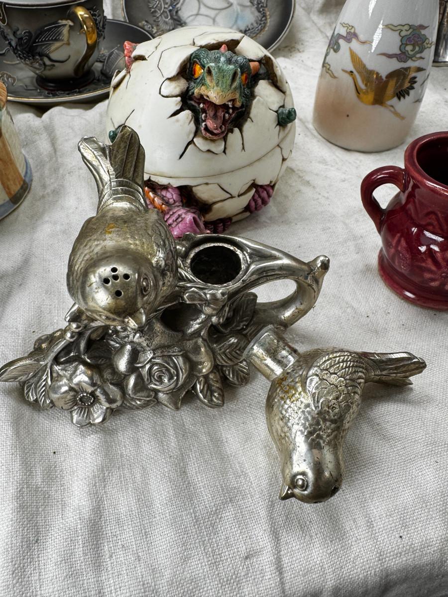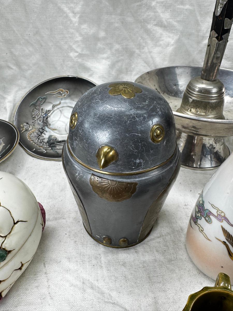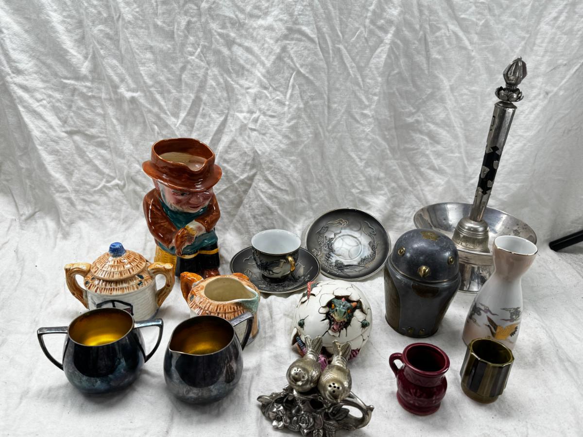 Asian pewter bird container with brass accents, English cermaic Toby in good condition, Silver Plate cream and sugar ( tarnished) Englans cottage Cream and sugar ceramic good condition, Tibetan ritual bell with Silver accents, shown in Sterling silver Gorham bowl with weighted bottom 11OZ. Salt and pepper birds in stand, Moriage dragon tea cup and 2 plates ( Japan) Dragon egg 2001 trinket hinged resin box. Saku ceramic pitcher, 2 tiny ceramic cups.