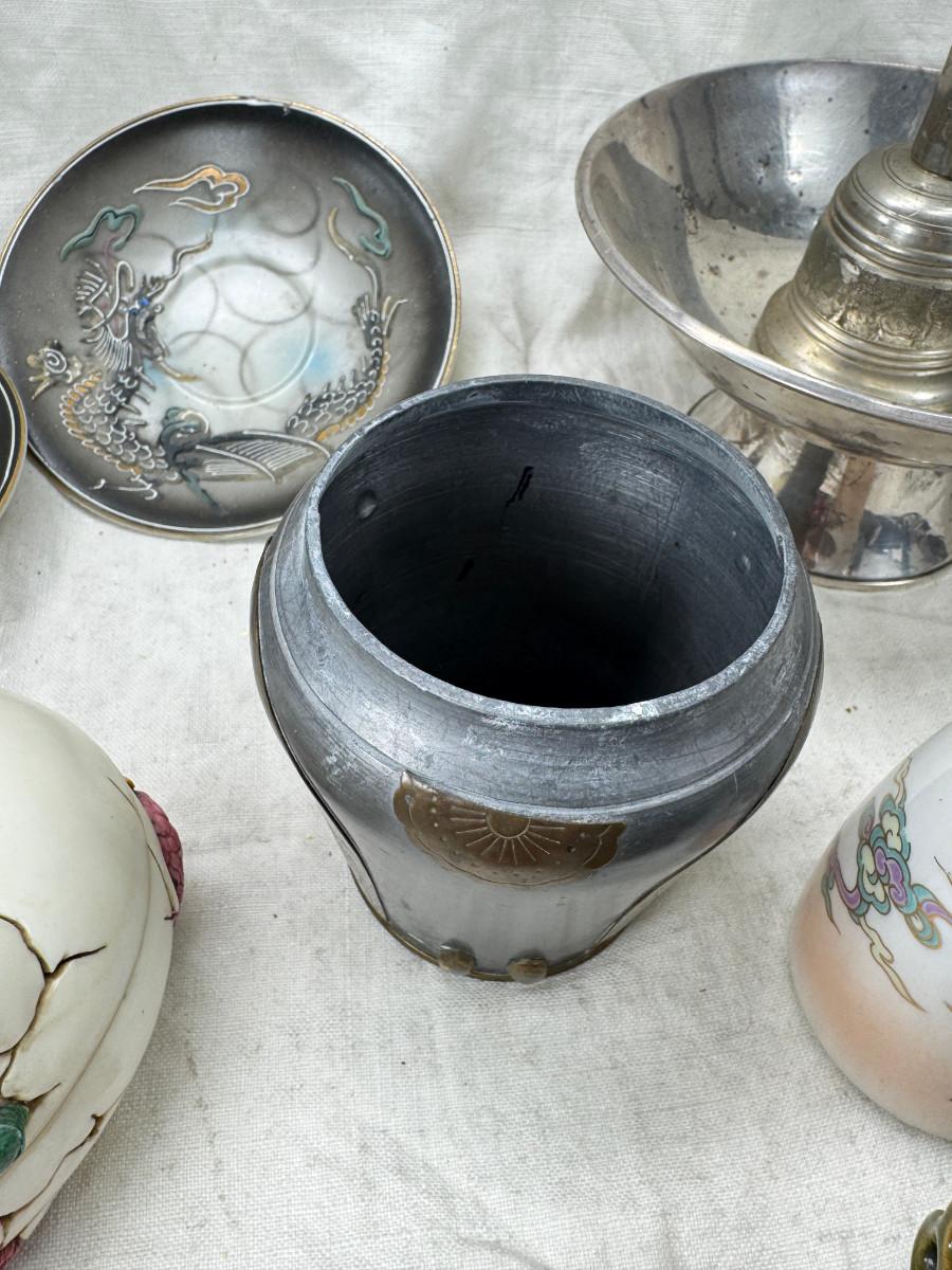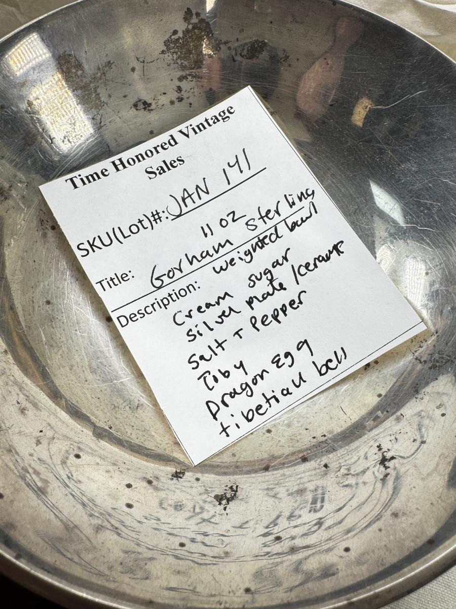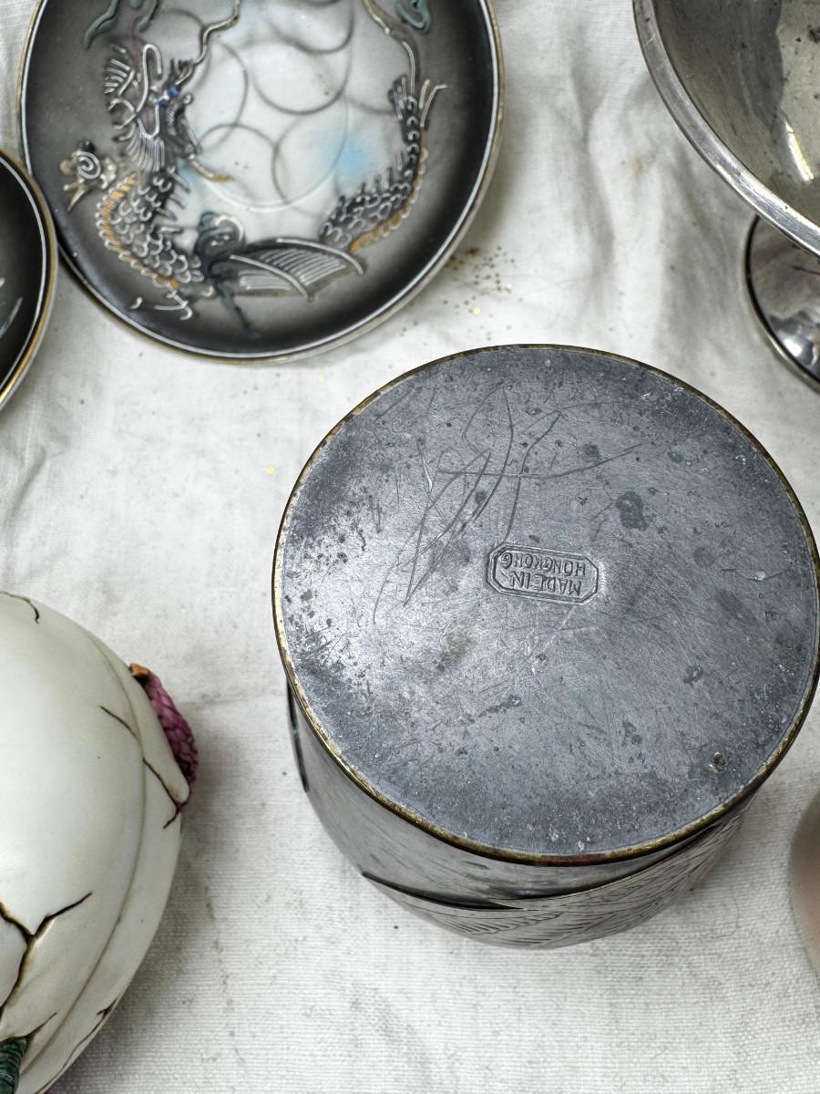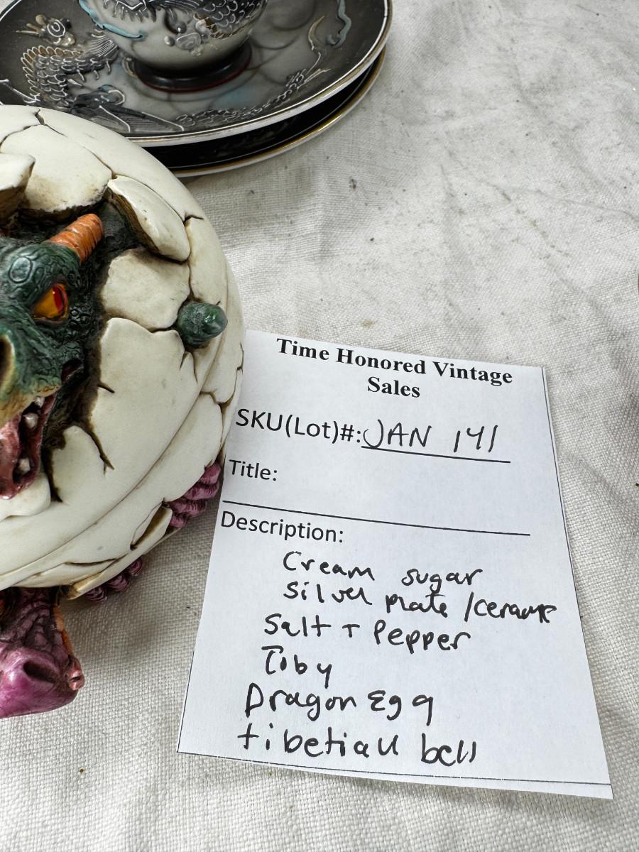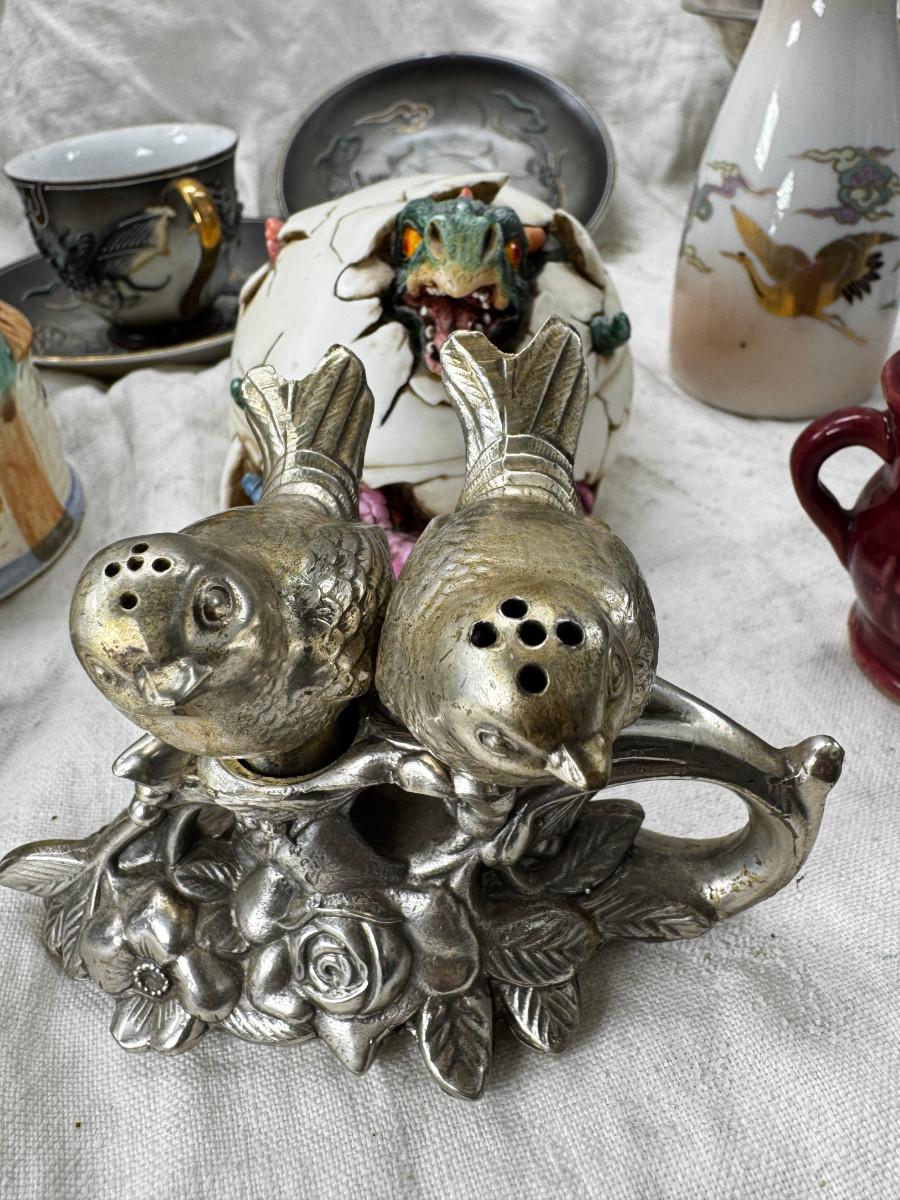 Asian pewter bird container with brass accents, English cermaic Toby in good condition, Silver Plate cream and sugar ( tarnished) Englans cottage Cream and sugar ceramic good condition, Tibetan ritual bell with Silver accents, shown in Sterling silver Gorham bowl with weighted bottom 11OZ. Salt and pepper birds in stand, Moriage dragon tea cup and 2 plates ( Japan) Dragon egg 2001 trinket hinged resin box. Saku ceramic pitcher, 2 tiny ceramic cups.
