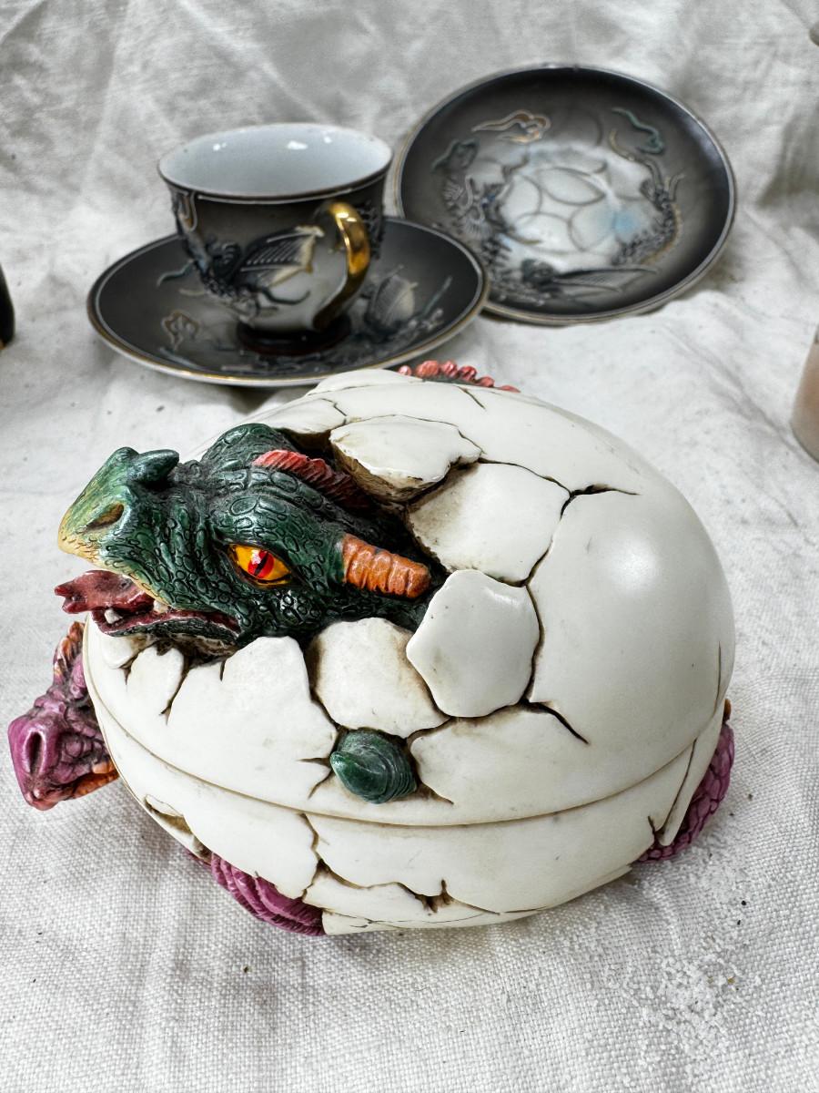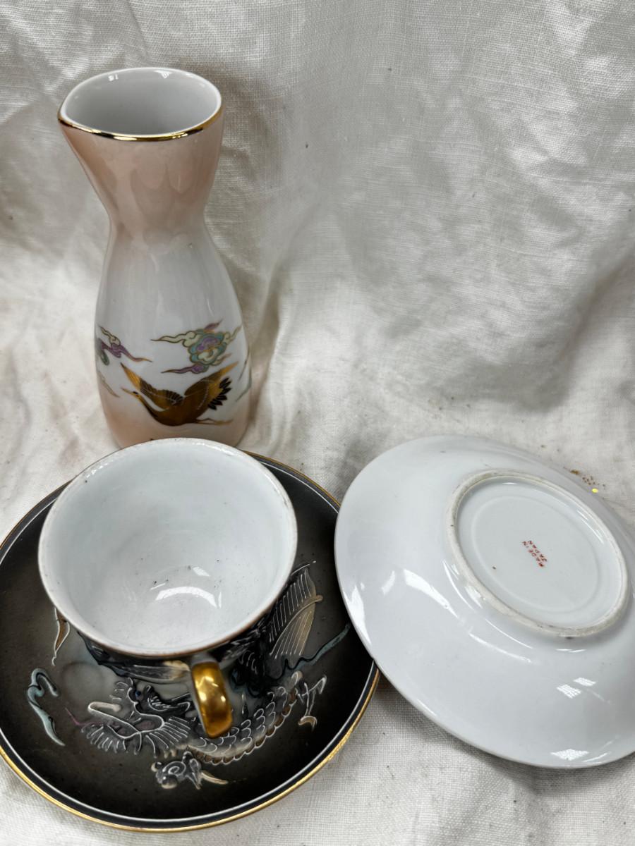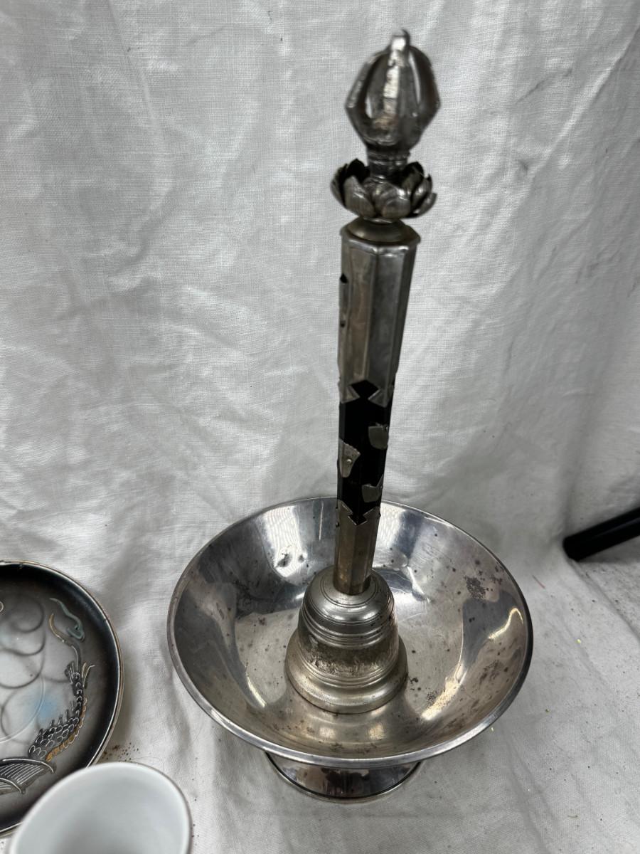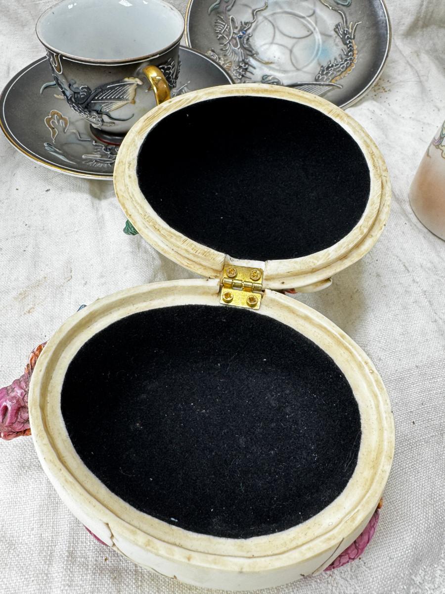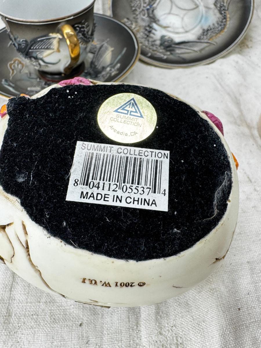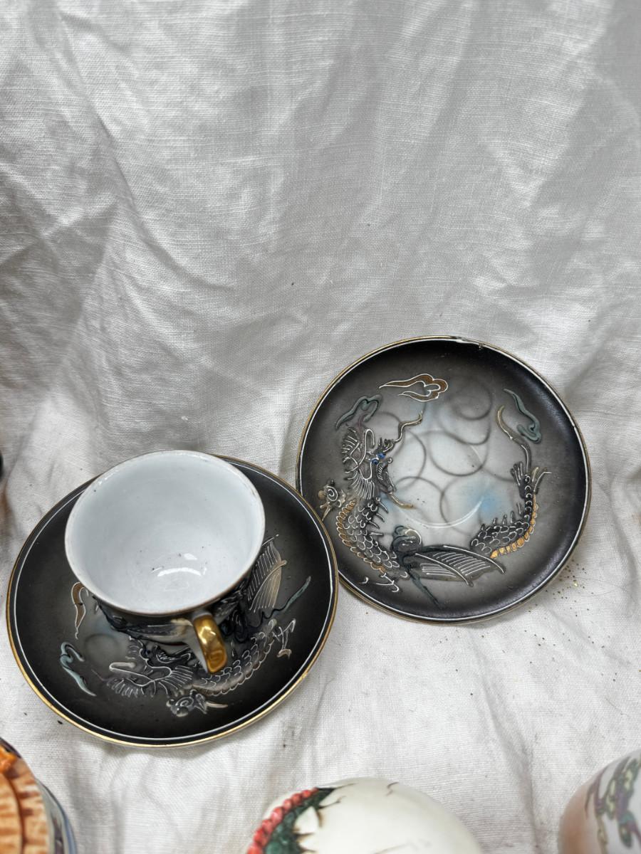 Asian pewter bird container with brass accents, English cermaic Toby in good condition, Silver Plate cream and sugar ( tarnished) Englans cottage Cream and sugar ceramic good condition, Tibetan ritual bell with Silver accents, shown in Sterling silver Gorham bowl with weighted bottom 11OZ. Salt and pepper birds in stand, Moriage dragon tea cup and 2 plates ( Japan) Dragon egg 2001 trinket hinged resin box. Saku ceramic pitcher, 2 tiny ceramic cups.
