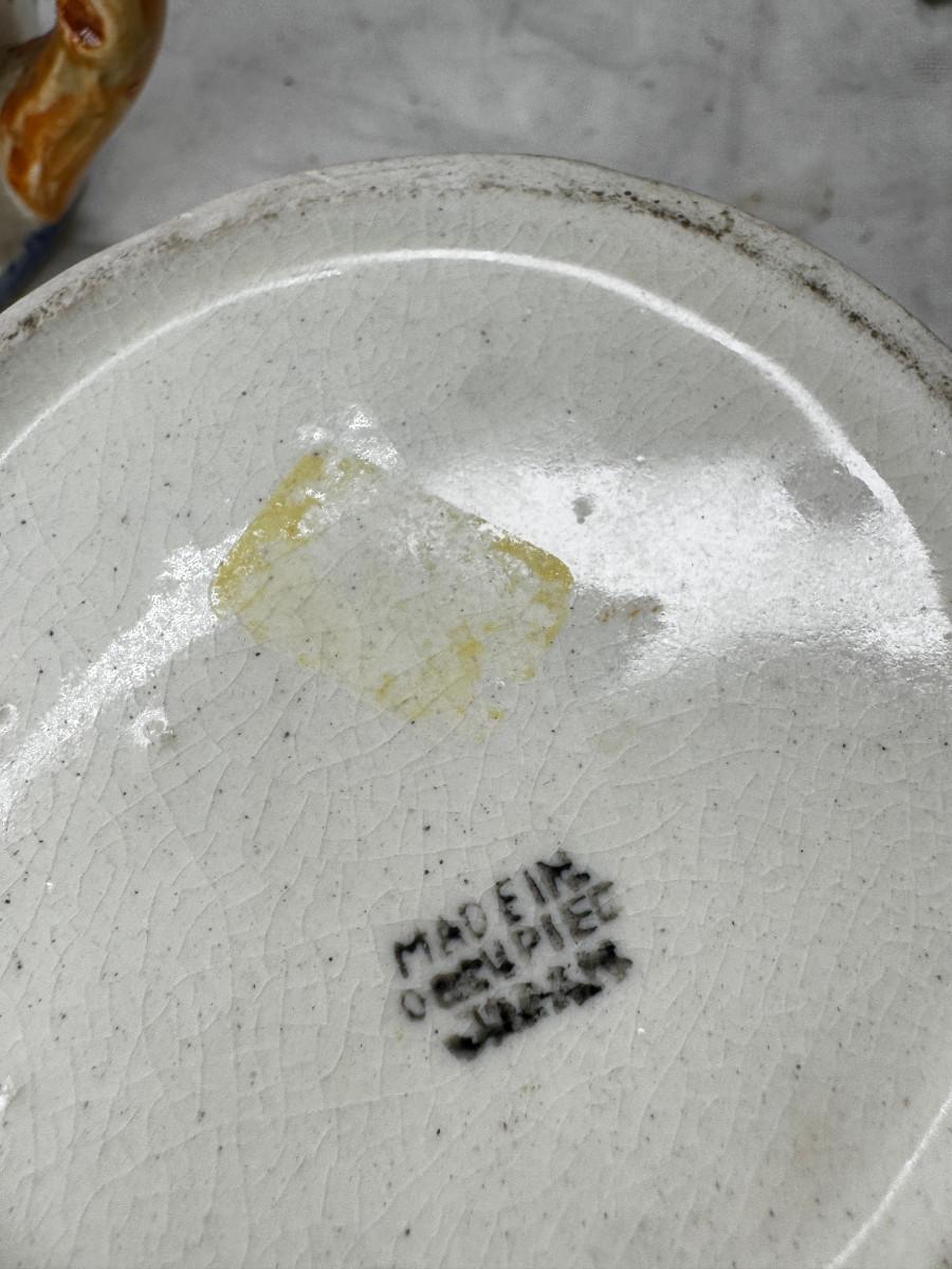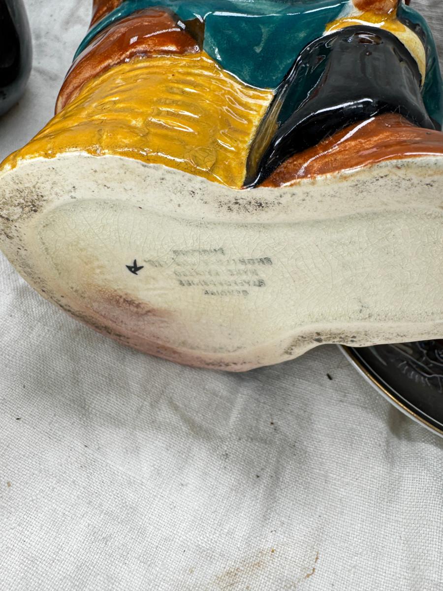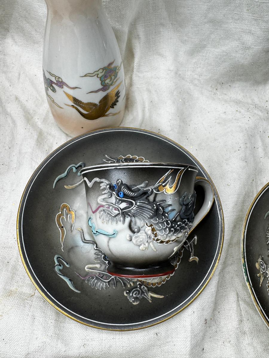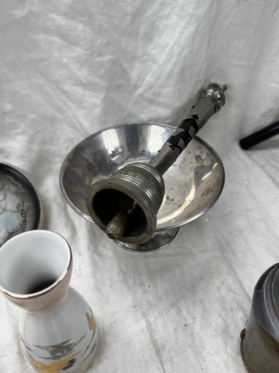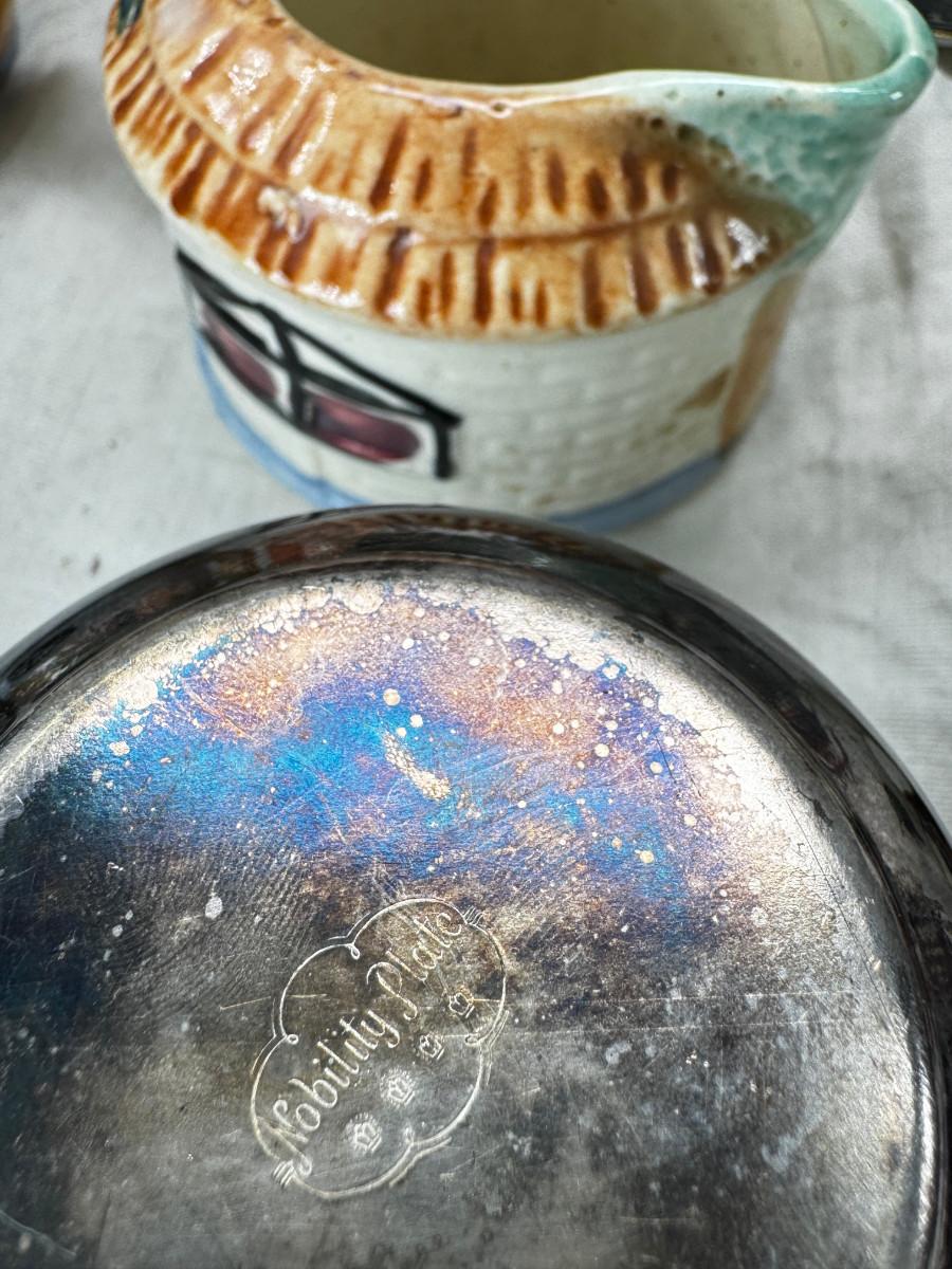 Asian pewter bird container with brass accents, English cermaic Toby in good condition, Silver Plate cream and sugar ( tarnished) Englans cottage Cream and sugar ceramic good condition, Tibetan ritual bell with Silver accents, shown in Sterling silver Gorham bowl with weighted bottom 11OZ. Salt and pepper birds in stand, Moriage dragon tea cup and 2 plates ( Japan) Dragon egg 2001 trinket hinged resin box. Saku ceramic pitcher, 2 tiny ceramic cups.