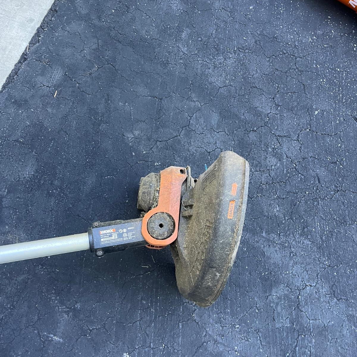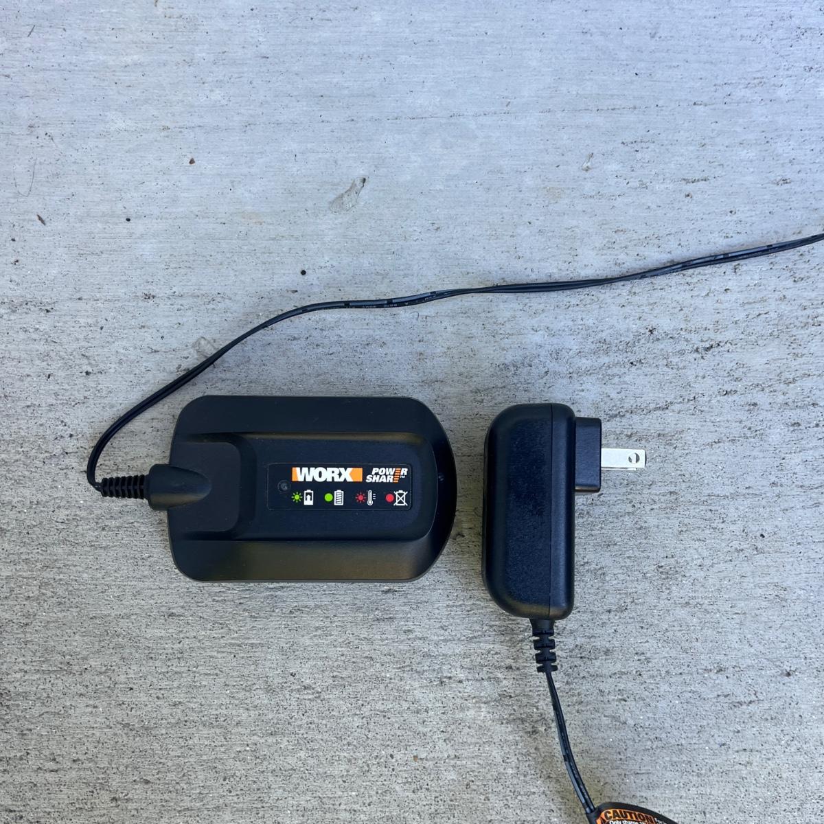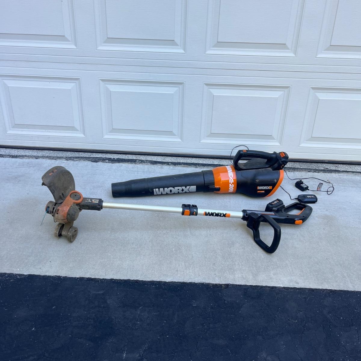 Lot includes a Worx 20V string trimmer/edger, blower , two batteries and one battery charger. String trimmer measures 1:” x 14” x 48”long. Both items powered on when trigger pulled.