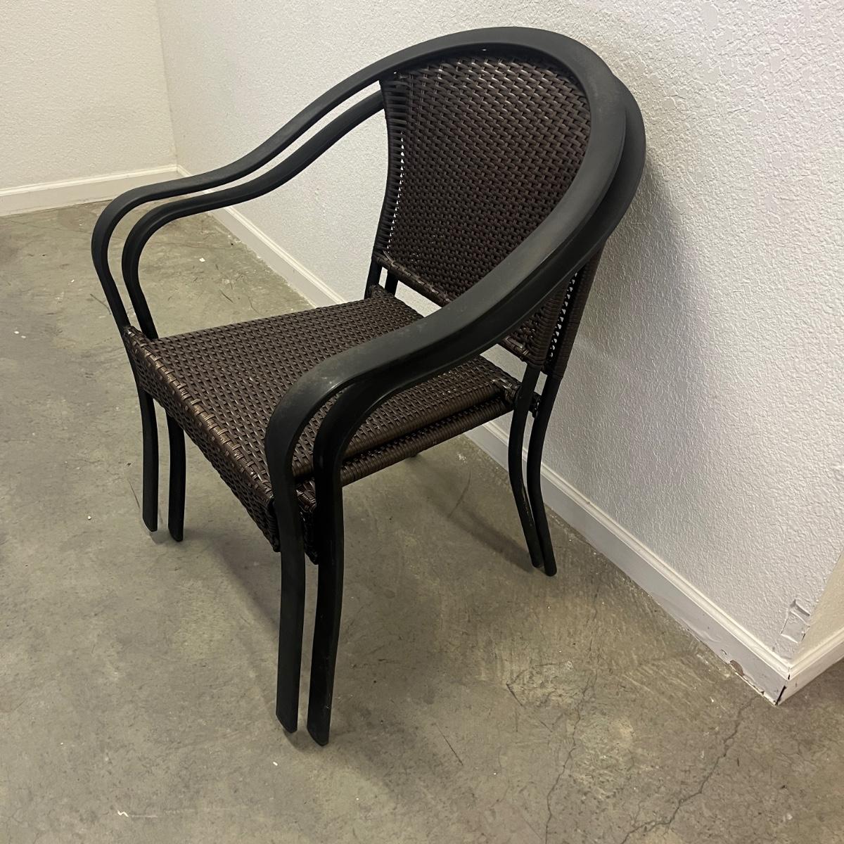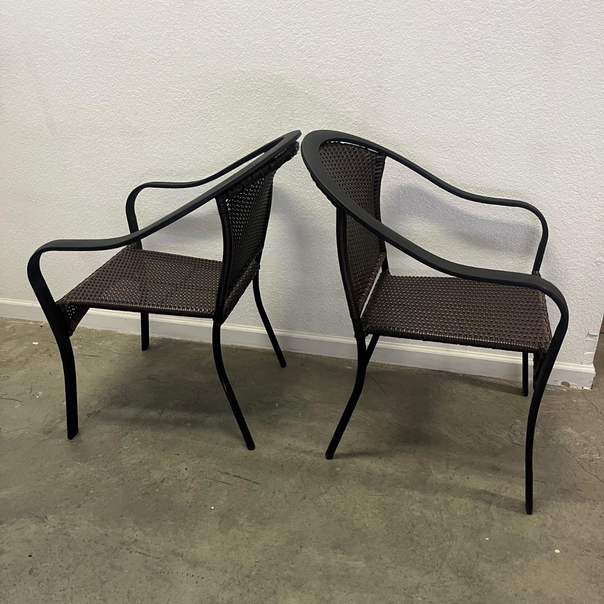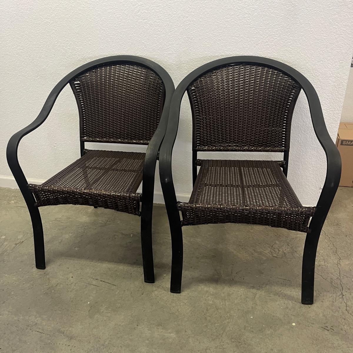 Lot includes two stackable aluminum framed chairs with a synthetic woven wicker seat and back. Chairs measure 21” x 25” x 34”H with a 17” seat height. Both chairs have scratches, see pictures.