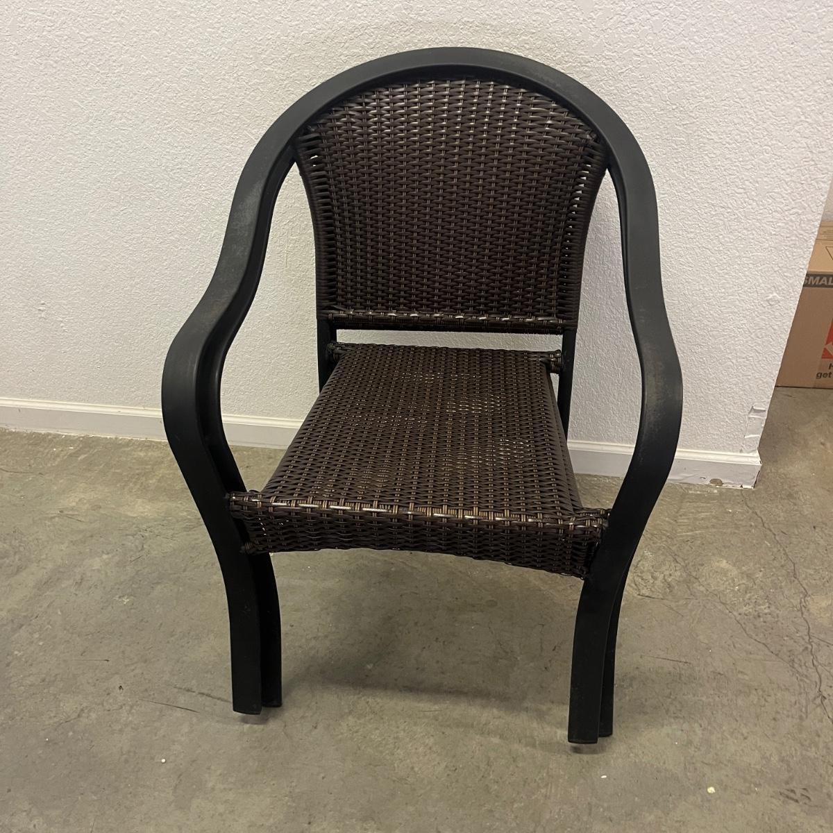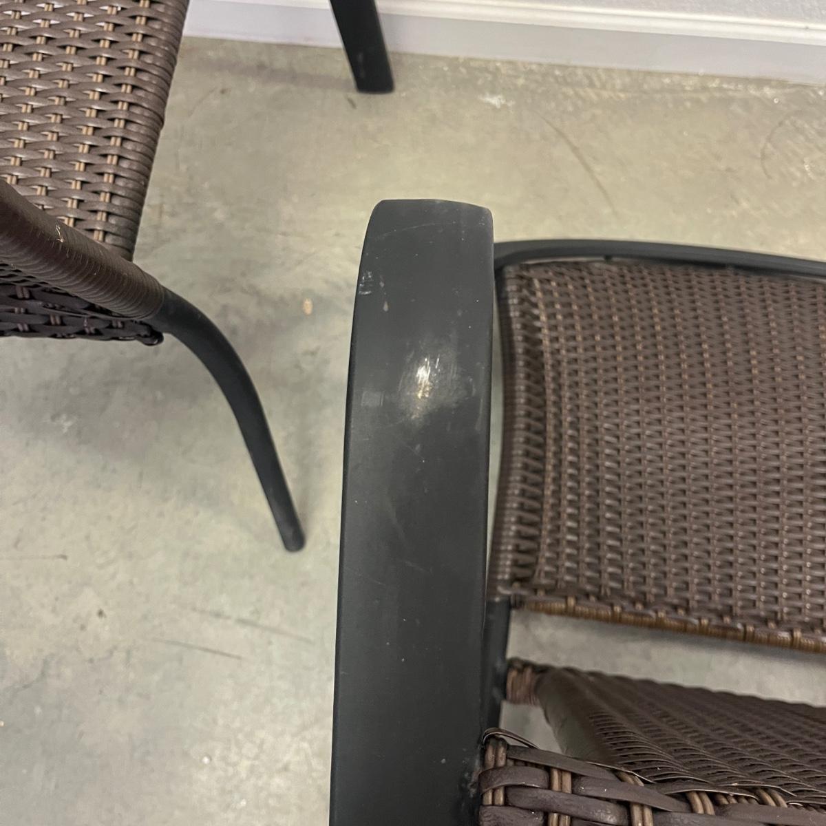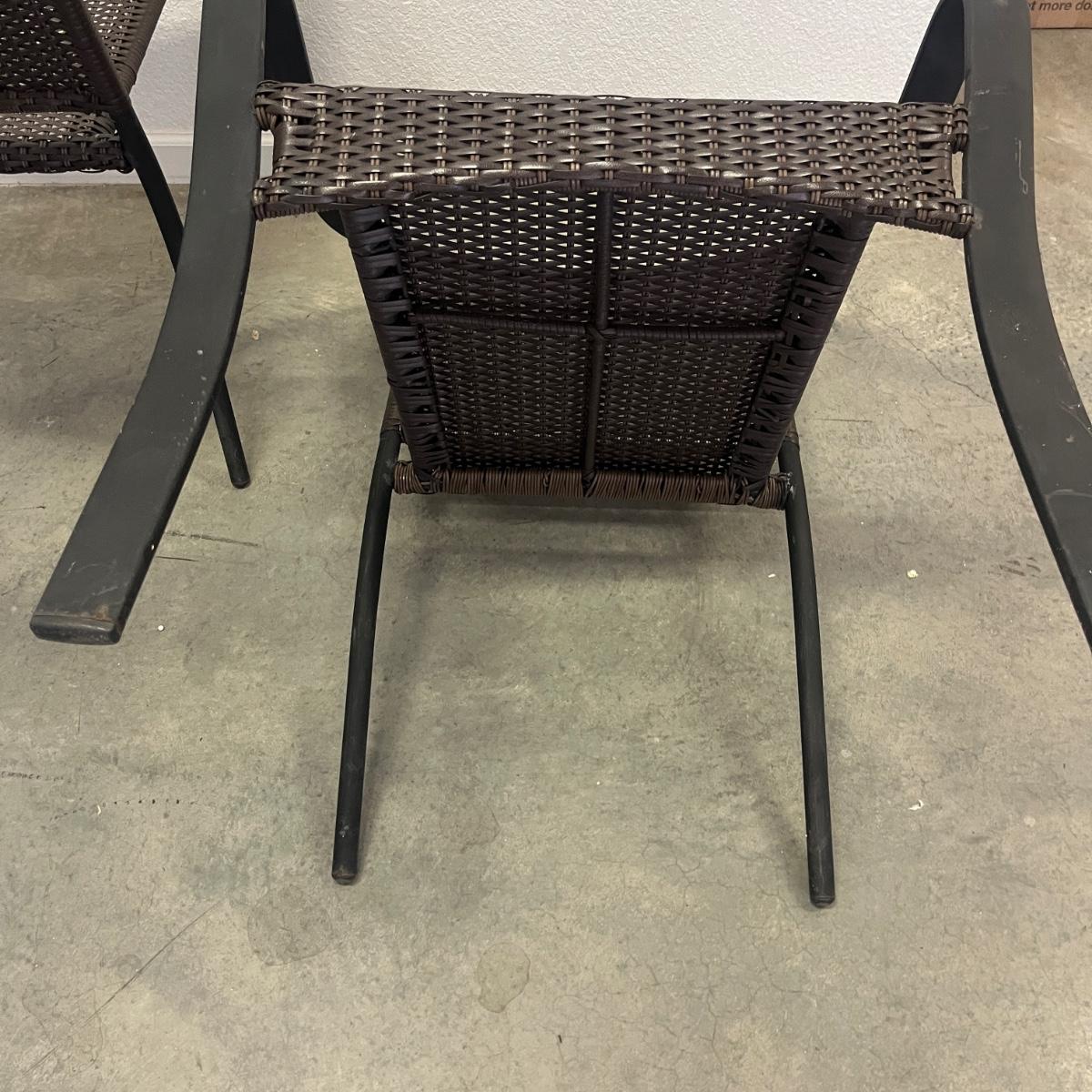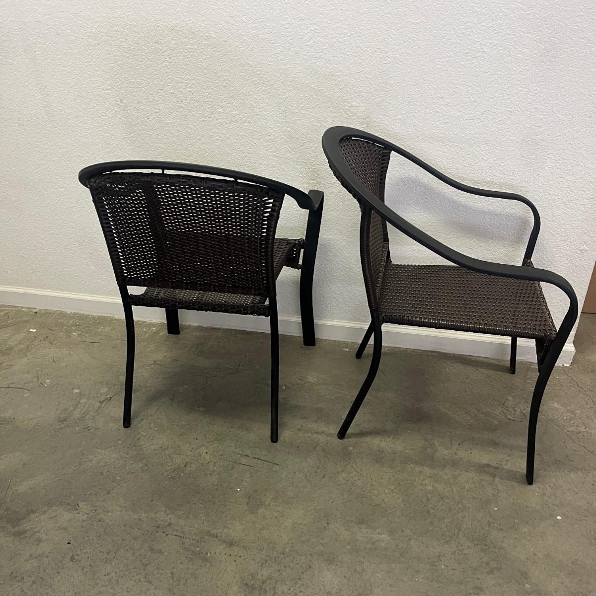 Lot includes two stackable aluminum framed chairs with a synthetic woven wicker seat and back. Chairs measure 21” x 25” x 34”H with a 17” seat height. Both chairs have scratches, see pictures.