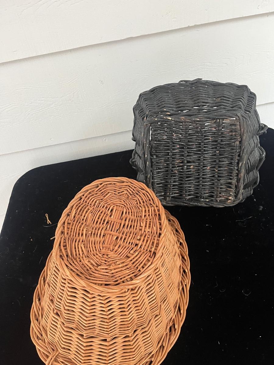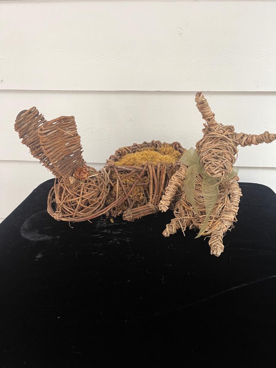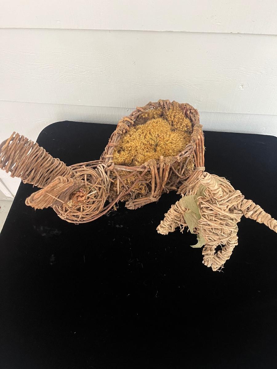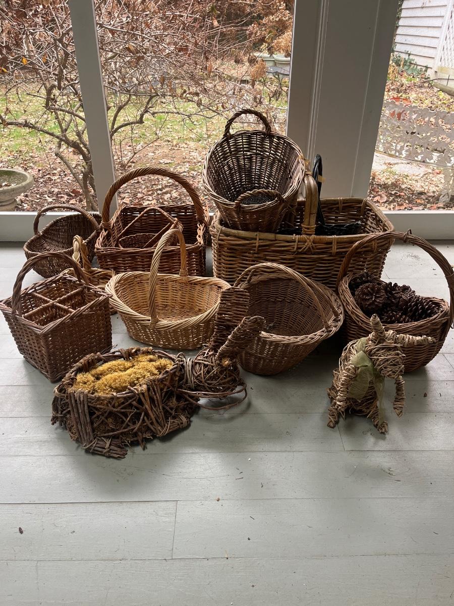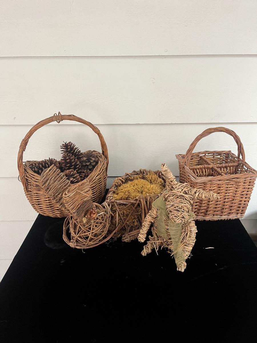 Lot includes two woven animals and an assortment of baskets in a variety of sizes and shapes. Some baskets have handles that are unraveling, see pictures. Largest basket measures 15” x 24” x 29”.