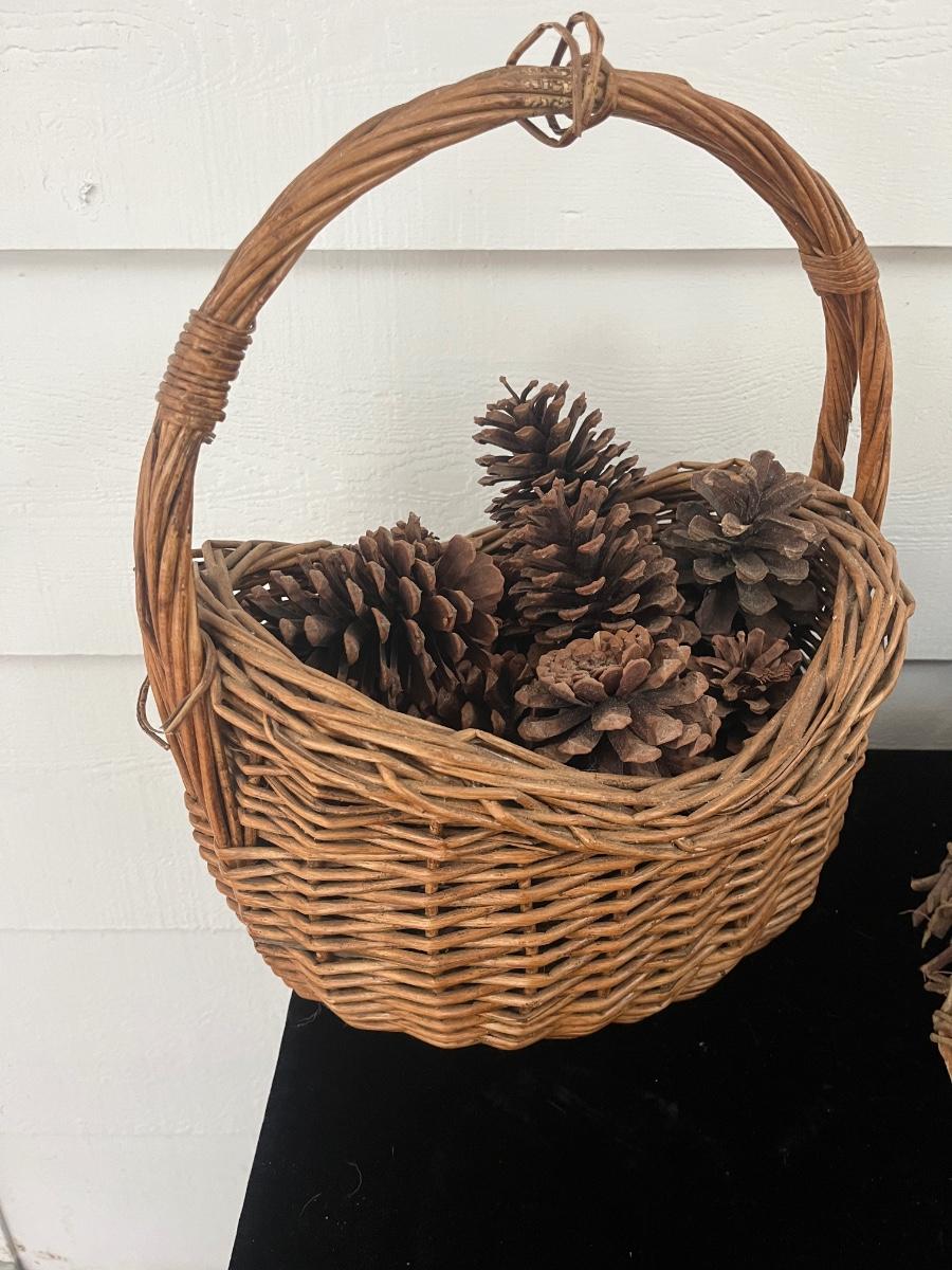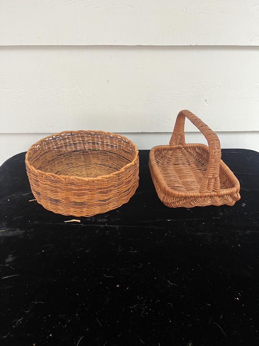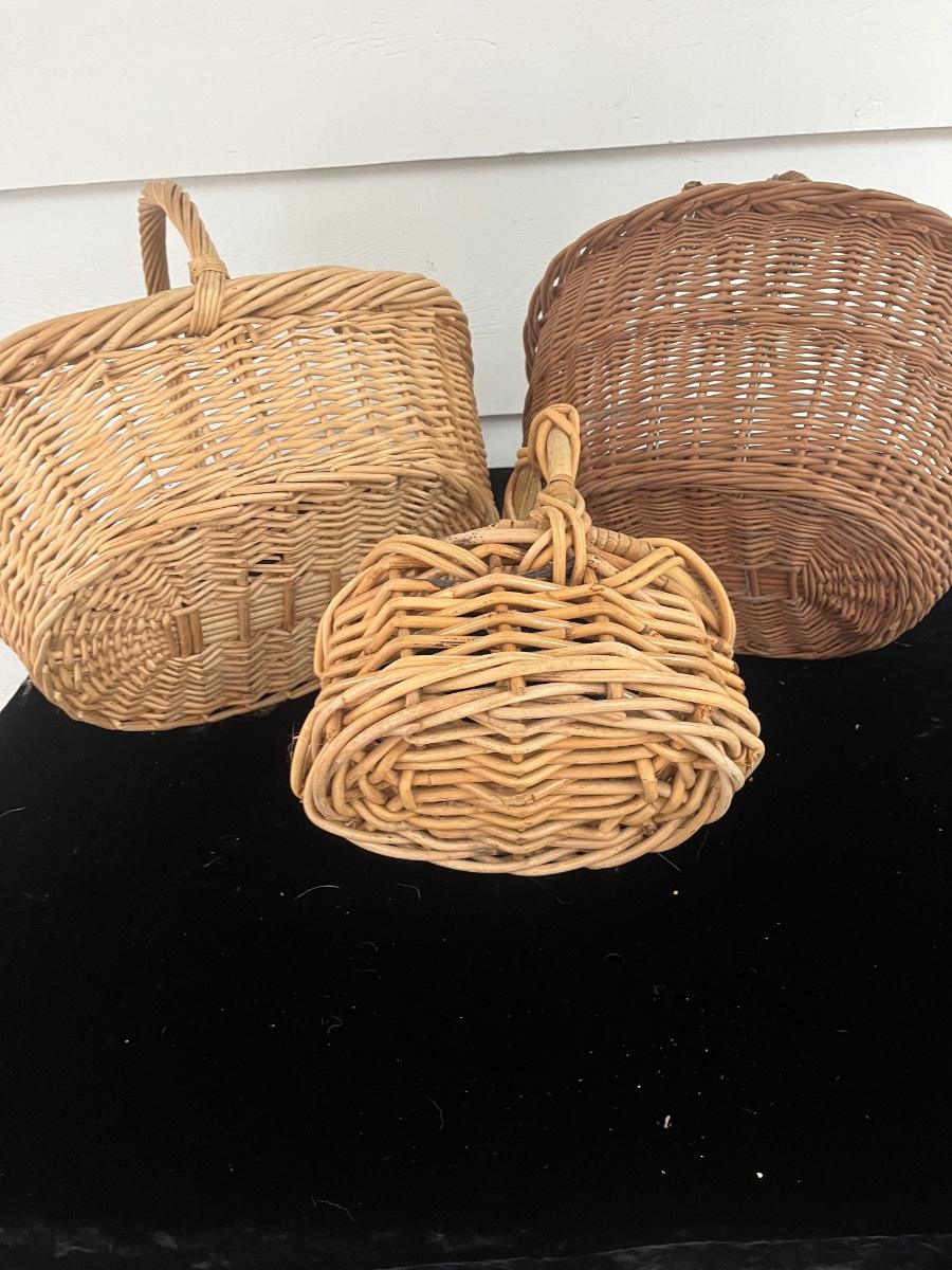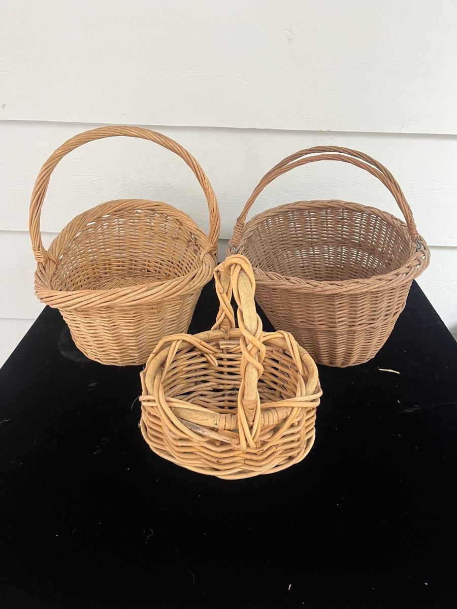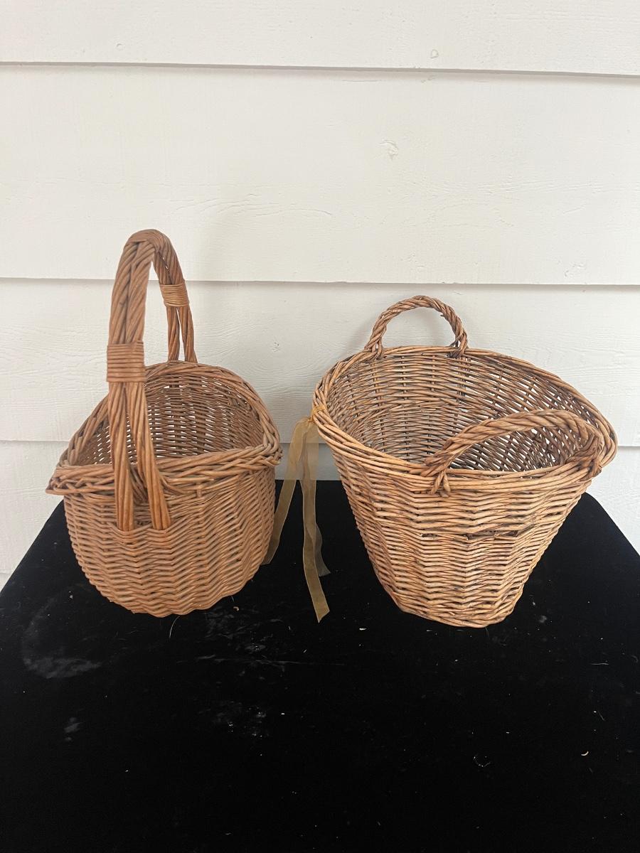 Lot includes two woven animals and an assortment of baskets in a variety of sizes and shapes. Some baskets have handles that are unraveling, see pictures. Largest basket measures 15” x 24” x 29”.