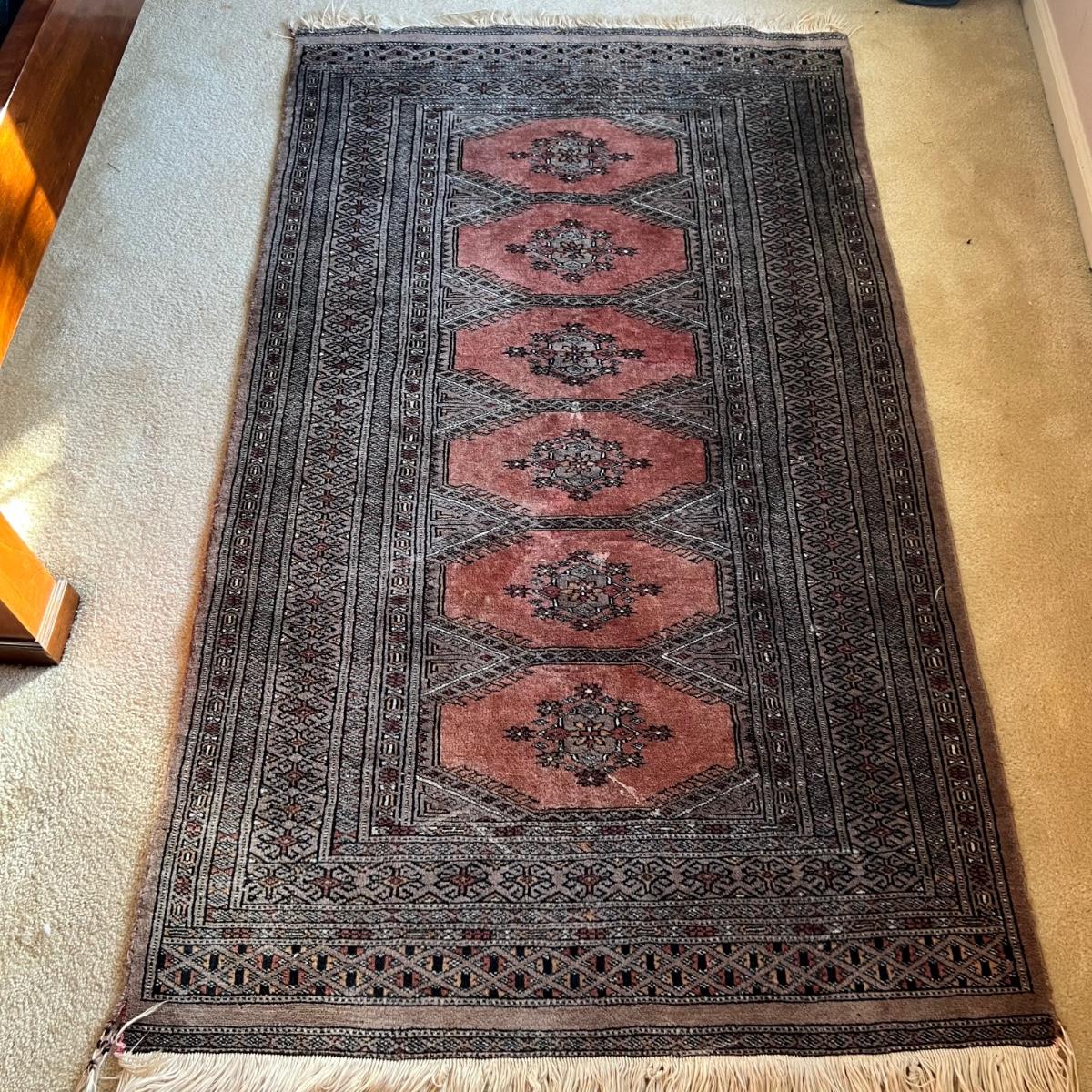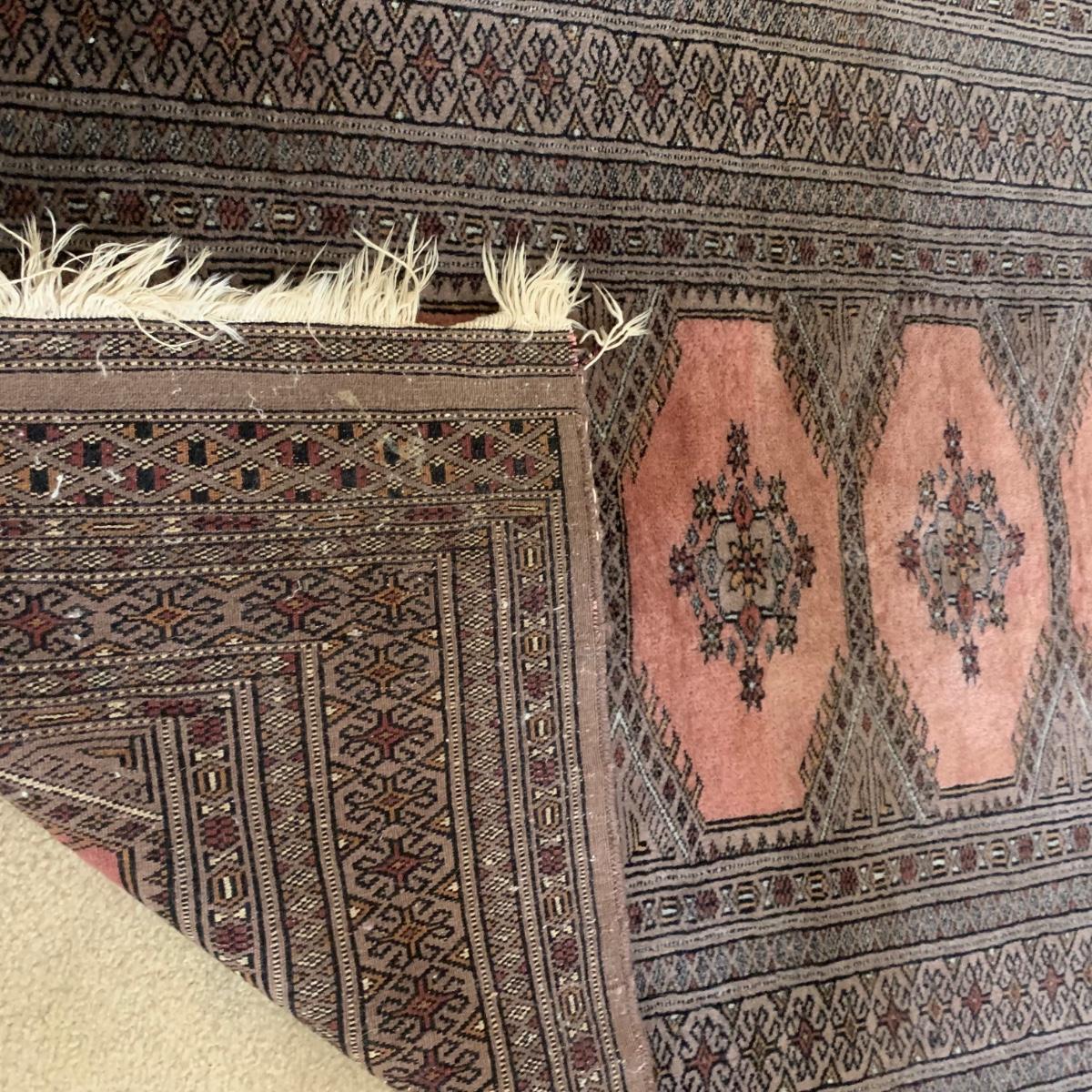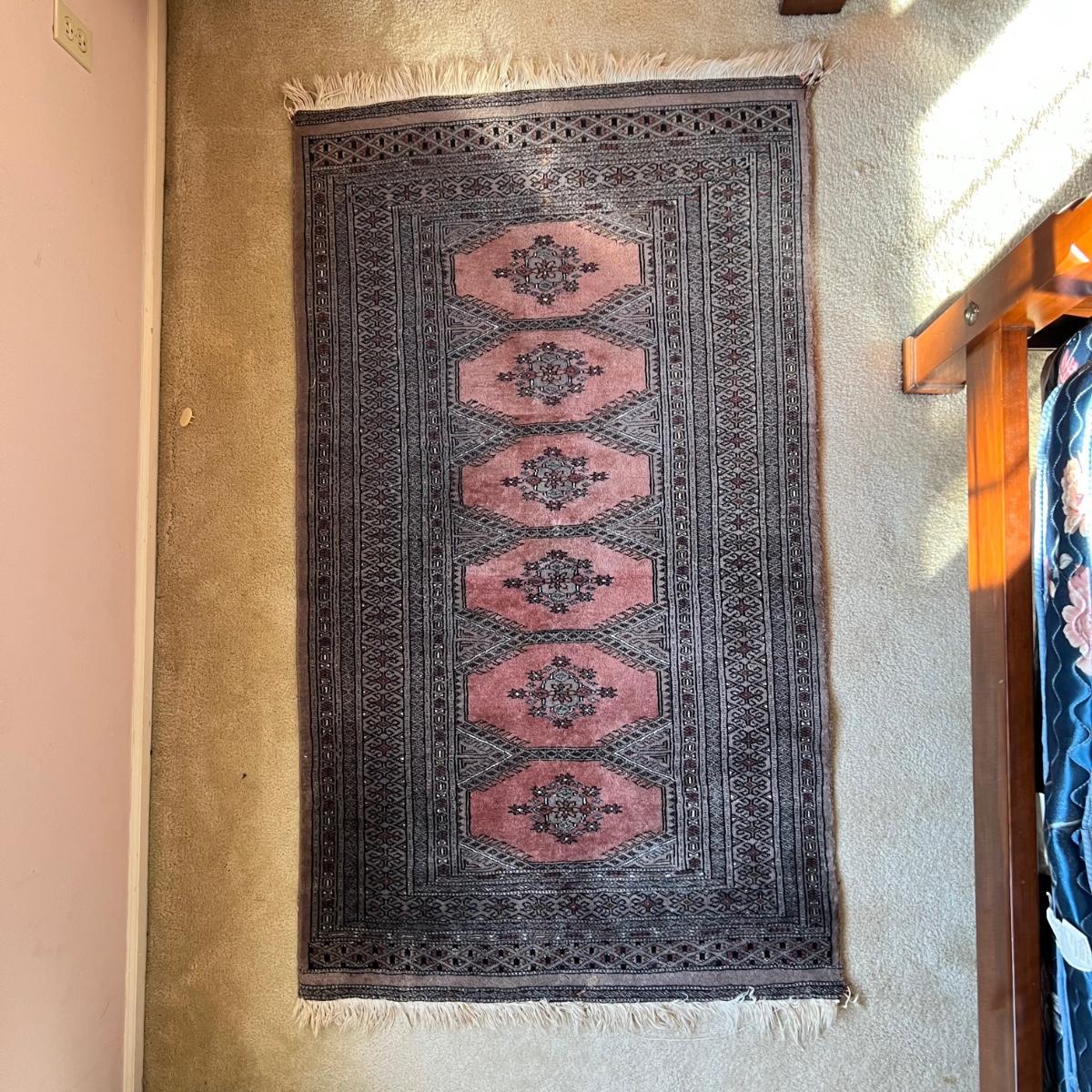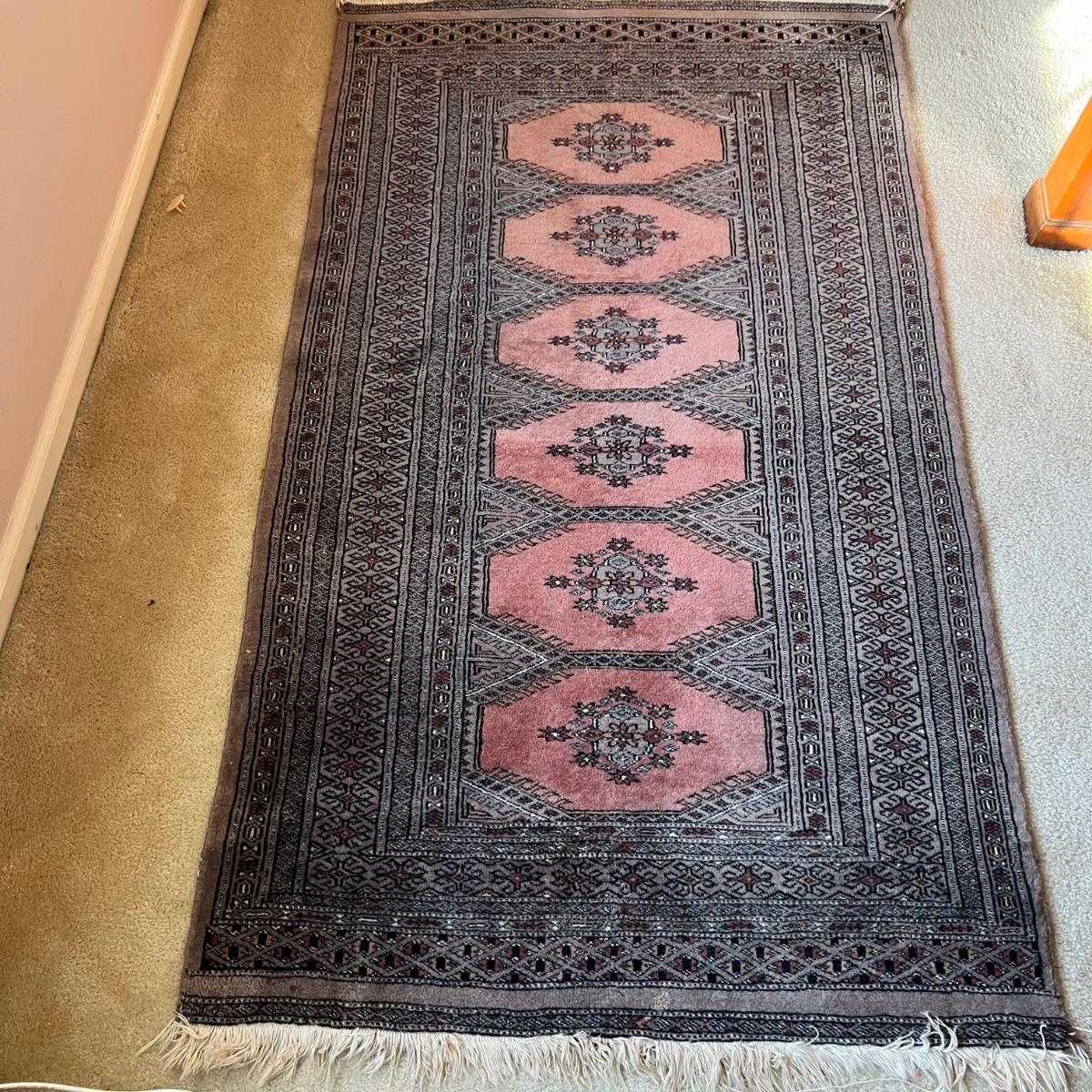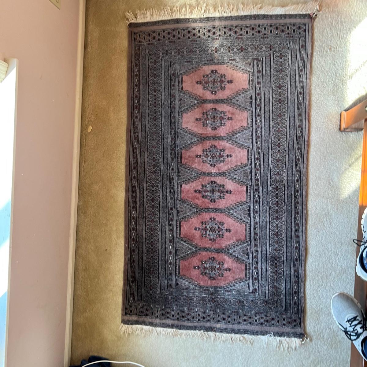 Taupe and misty pink 37”W x 64”L woven area rug. Minor soil spots on rug seem very cleanable (note photos). Two corners of the rug have a small 2” rip/unraveled area.