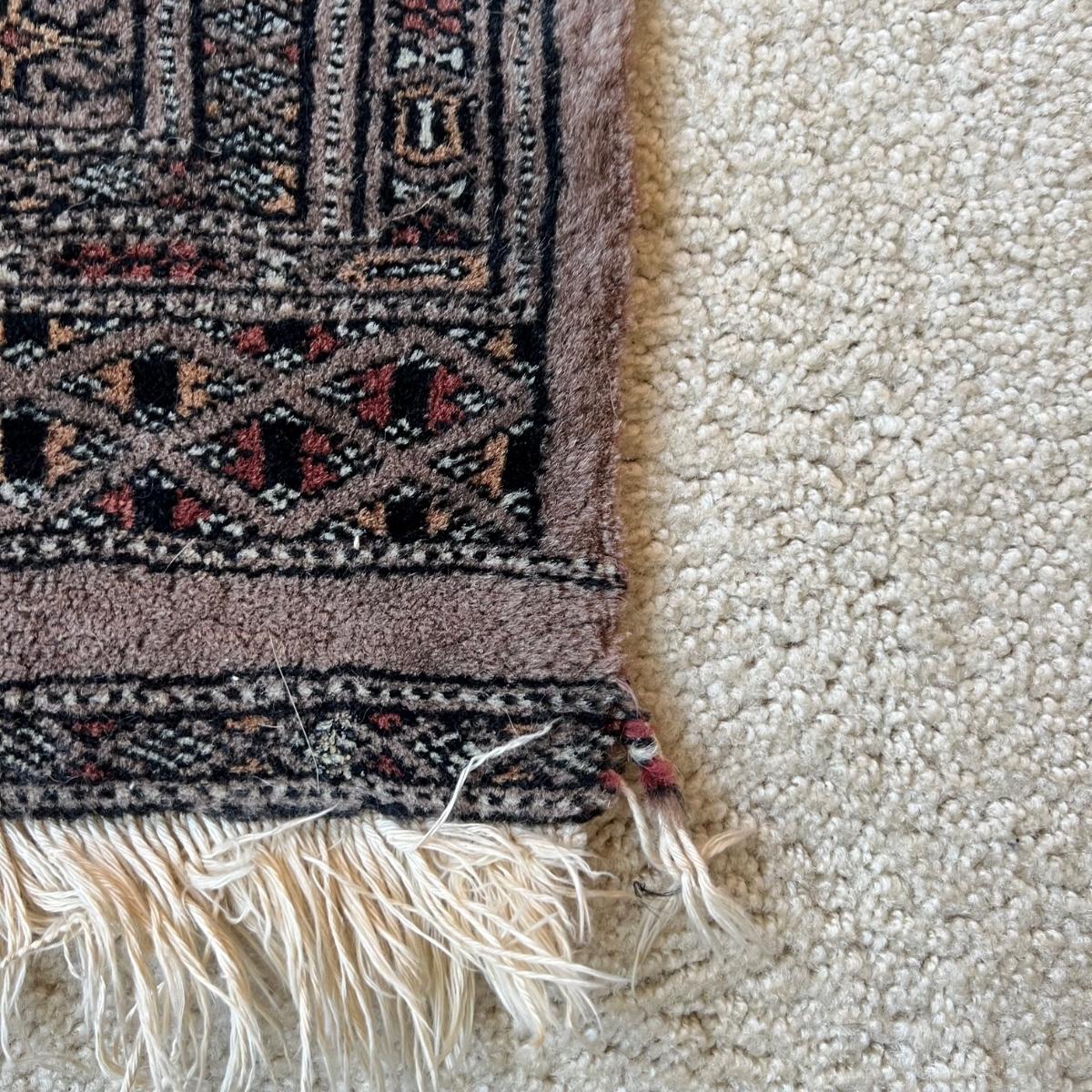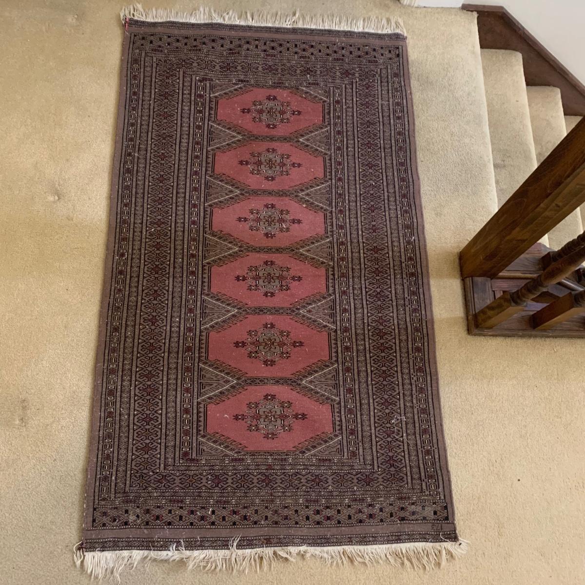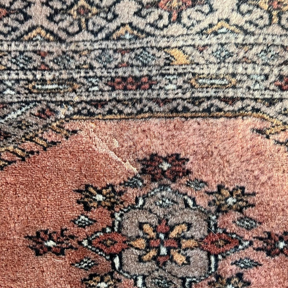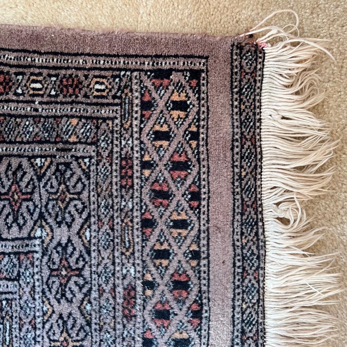 Taupe and misty pink 37”W x 64”L woven area rug. Minor soil spots on rug seem very cleanable (note photos). Two corners of the rug have a small 2” rip/unraveled area.