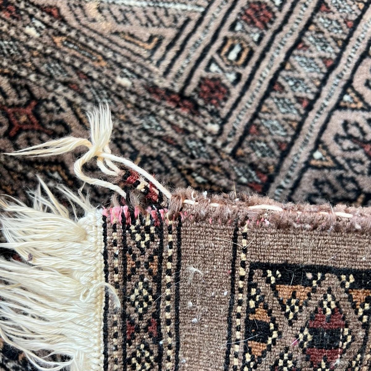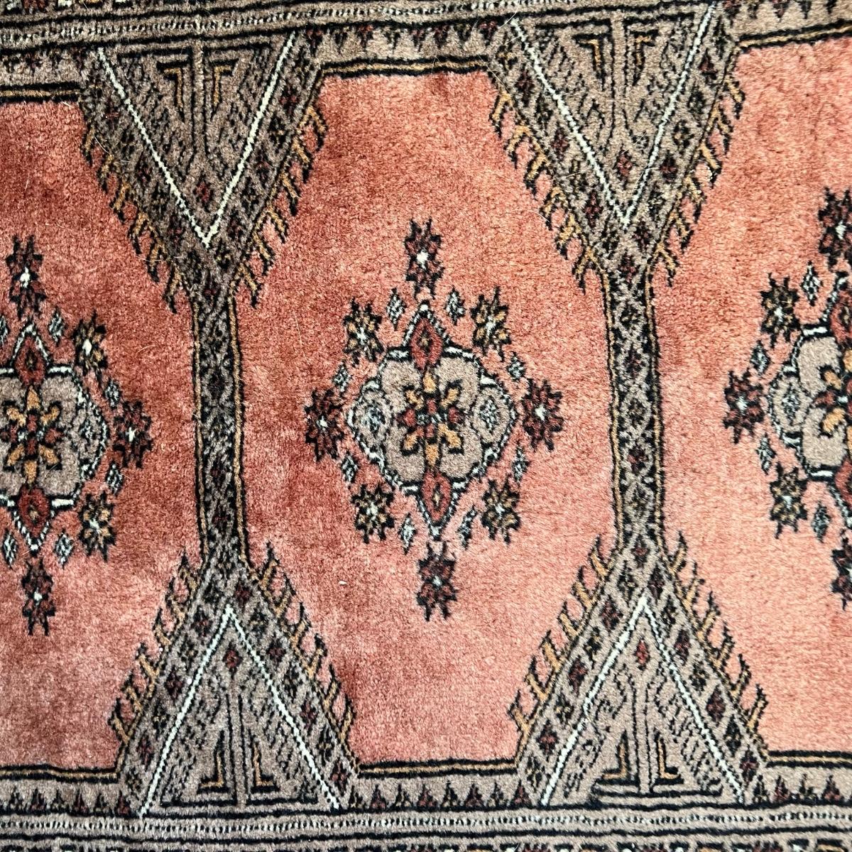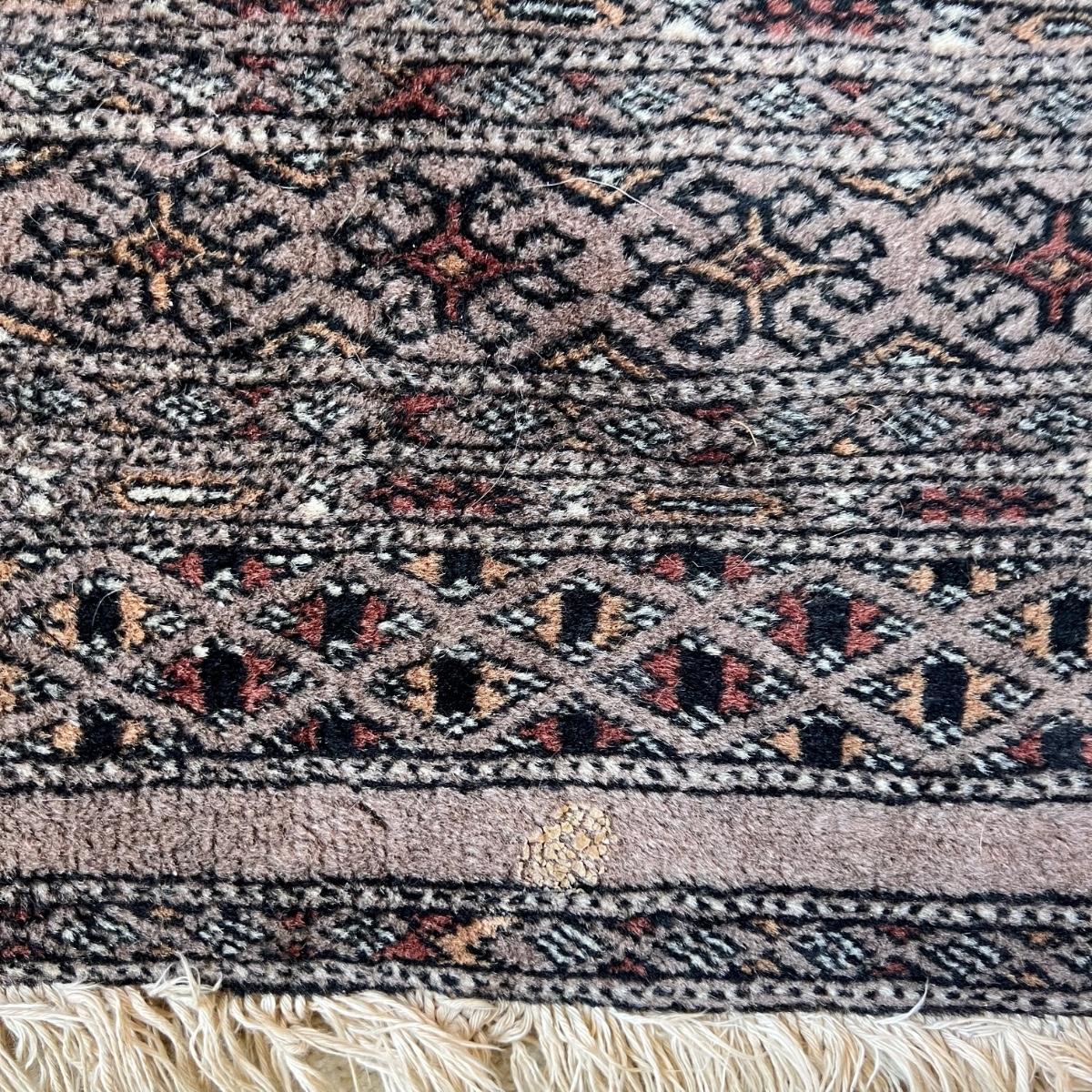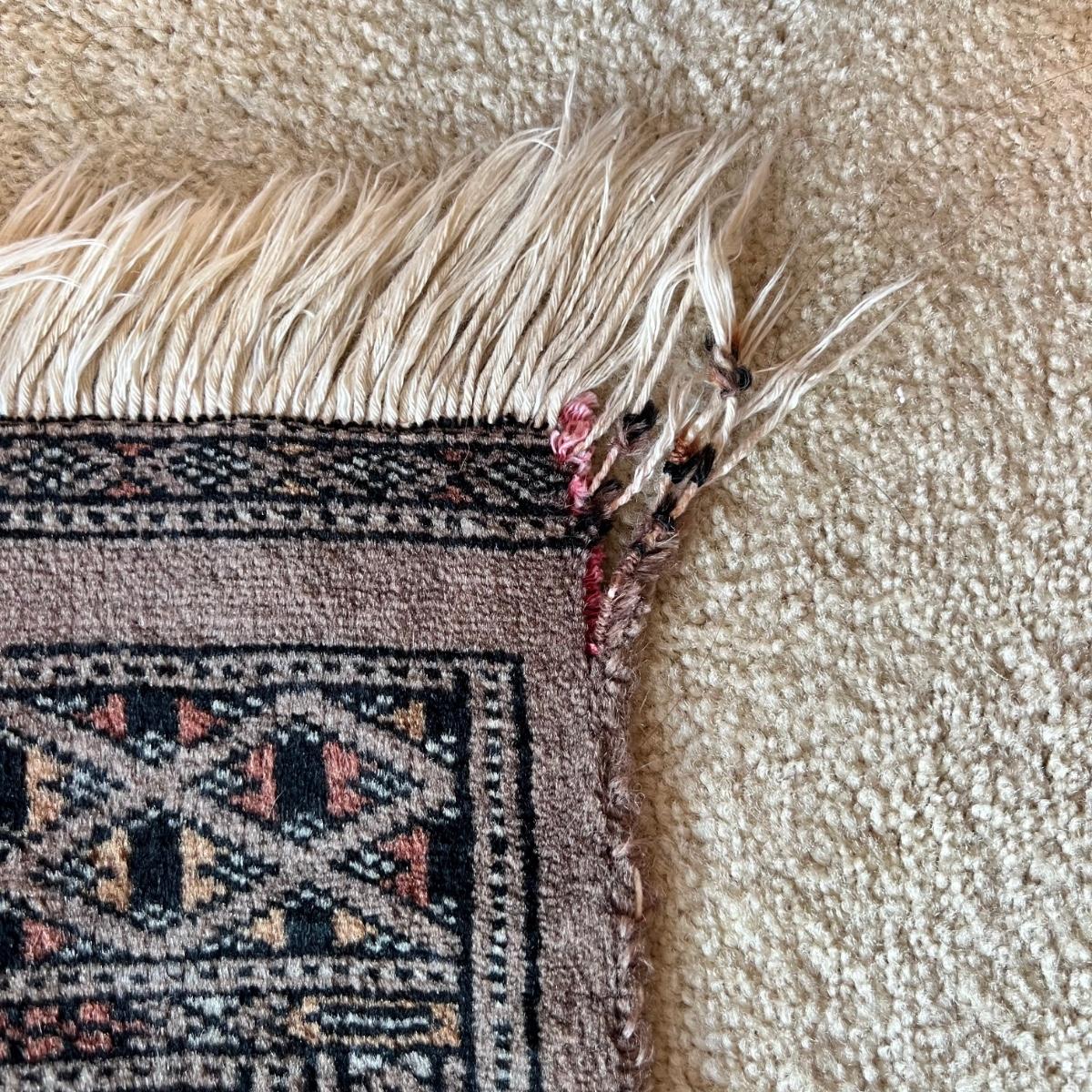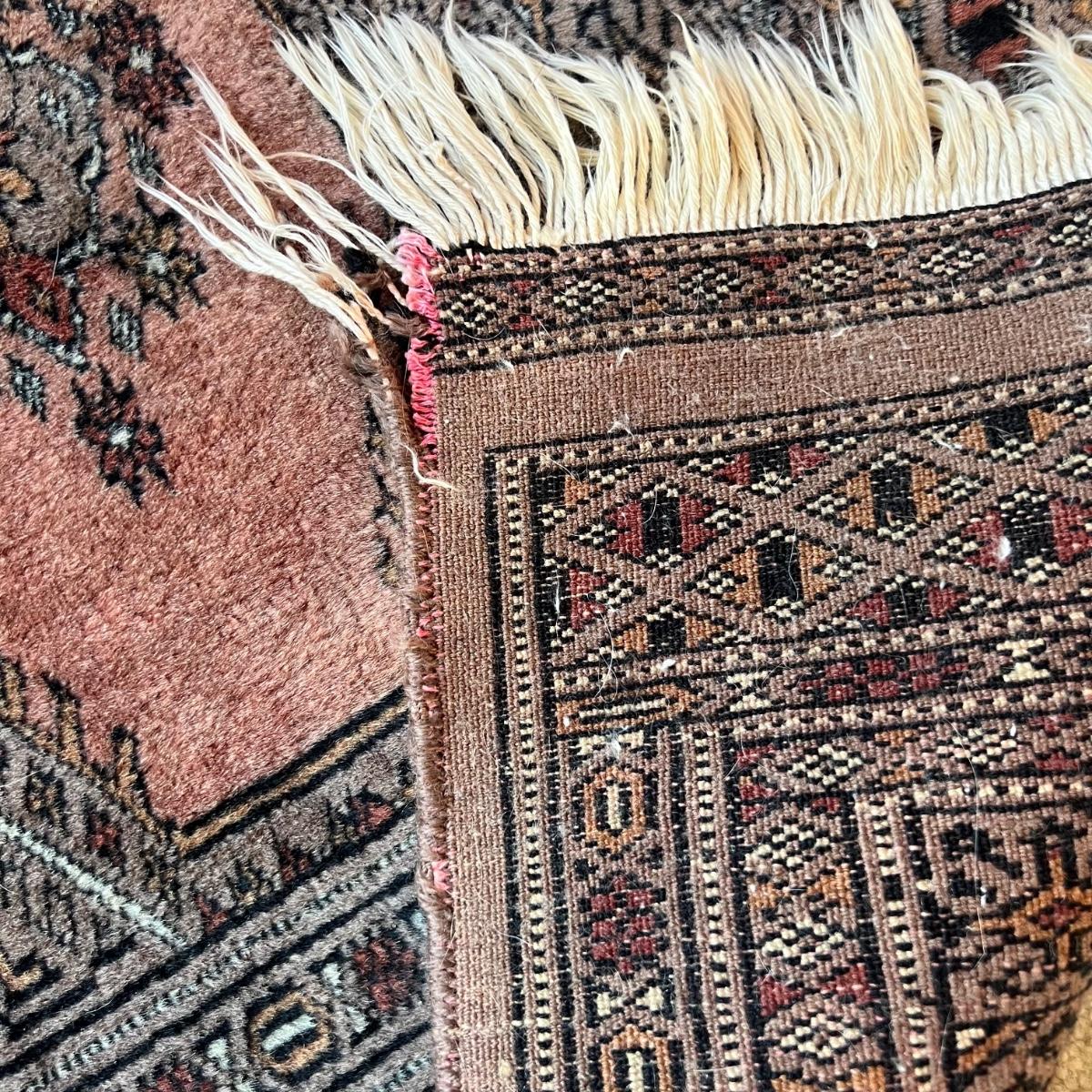 Taupe and misty pink 37”W x 64”L woven area rug. Minor soil spots on rug seem very cleanable (note photos). Two corners of the rug have a small 2” rip/unraveled area.