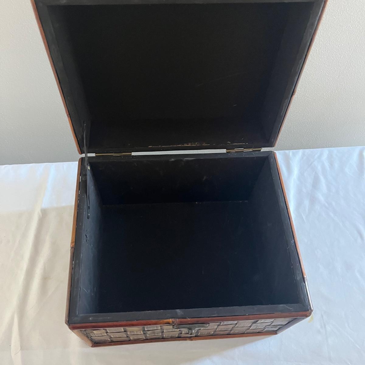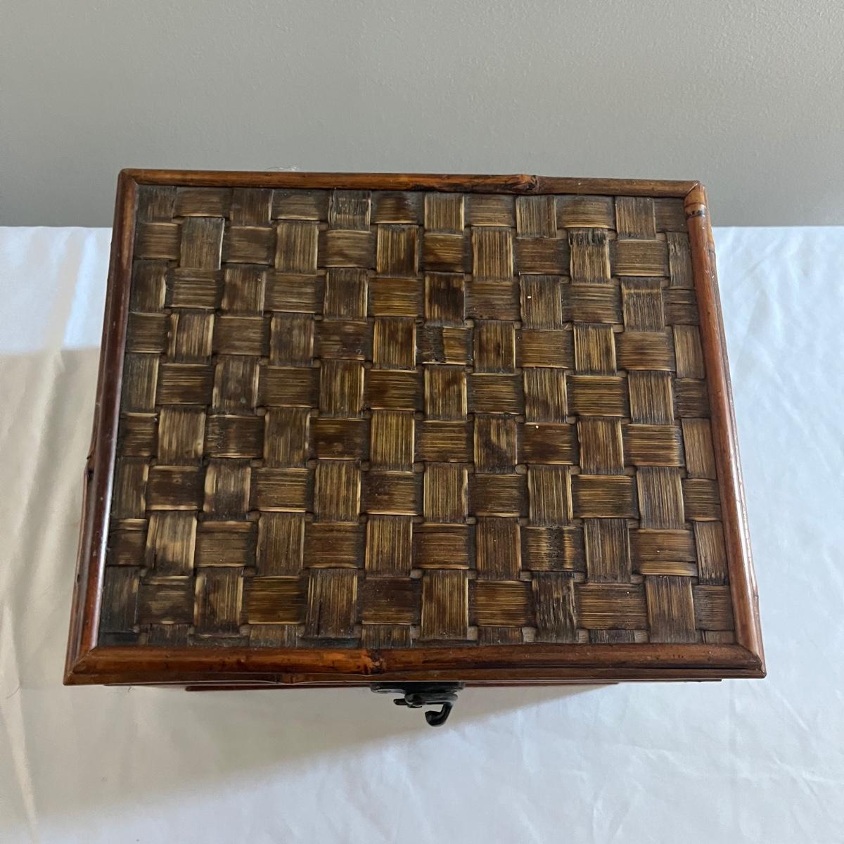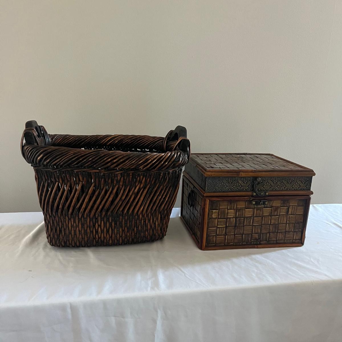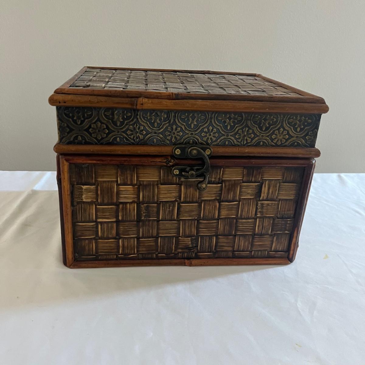 Lot includes a wooden box with a woven pattern and a patterned piece of metal around the lid. Dark brown colored woven basket also included. Box measures 8.5” x 10” x 8”.