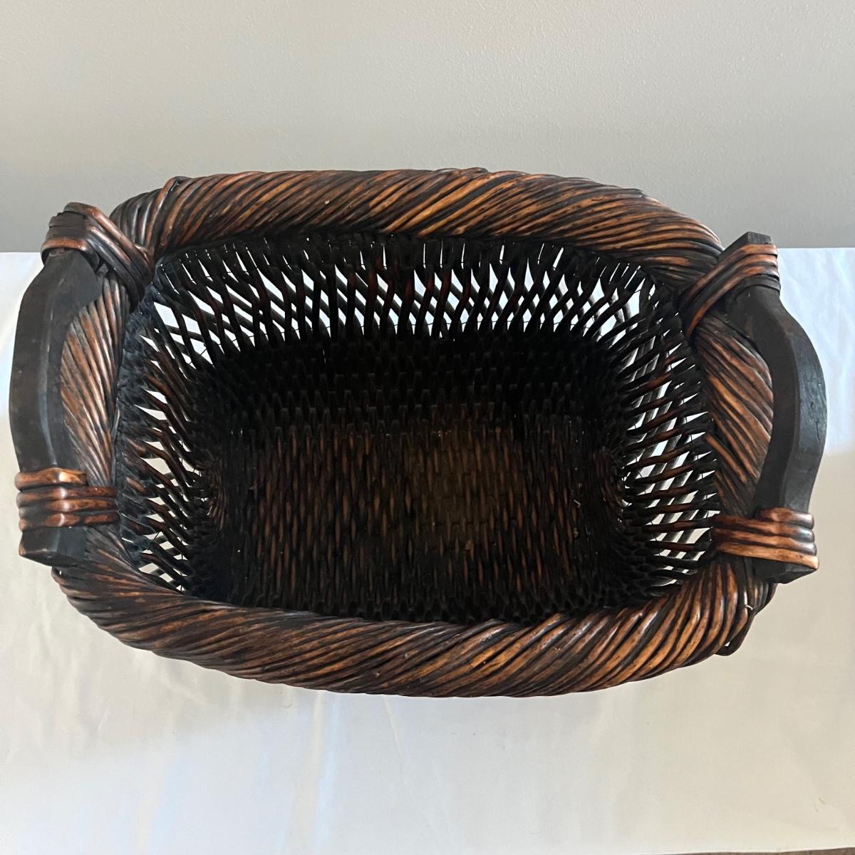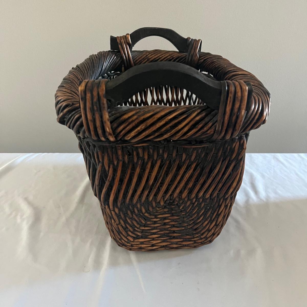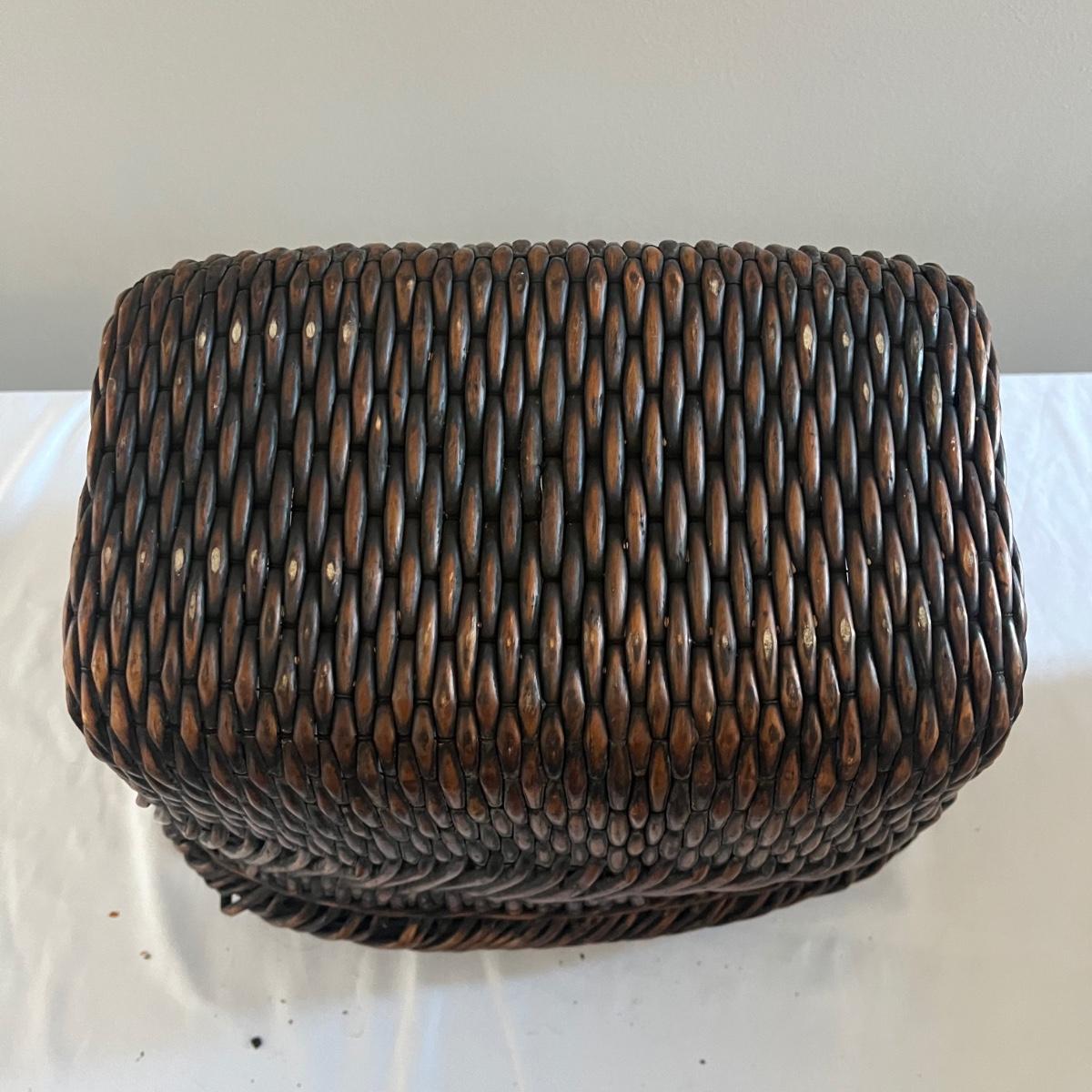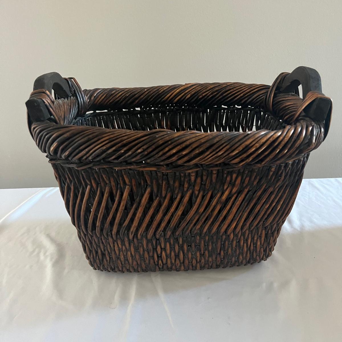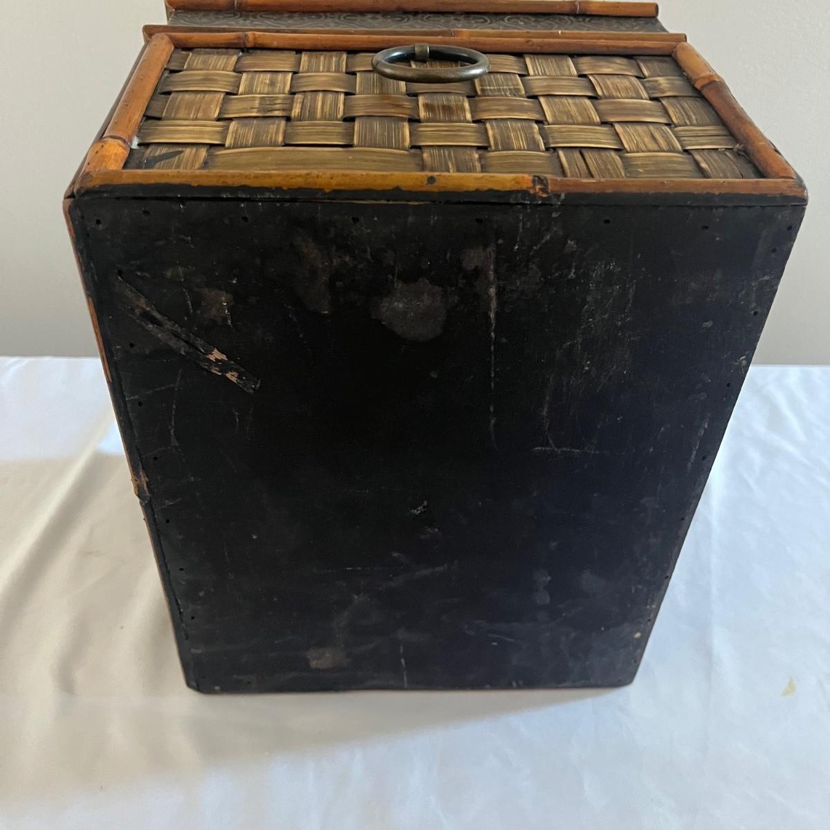 Lot includes a wooden box with a woven pattern and a patterned piece of metal around the lid. Dark brown colored woven basket also included. Box measures 8.5” x 10” x 8”.