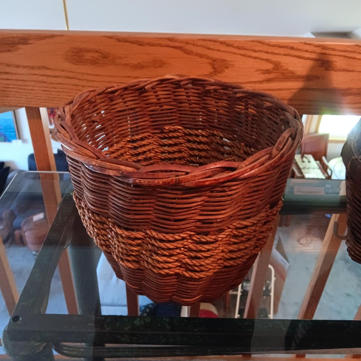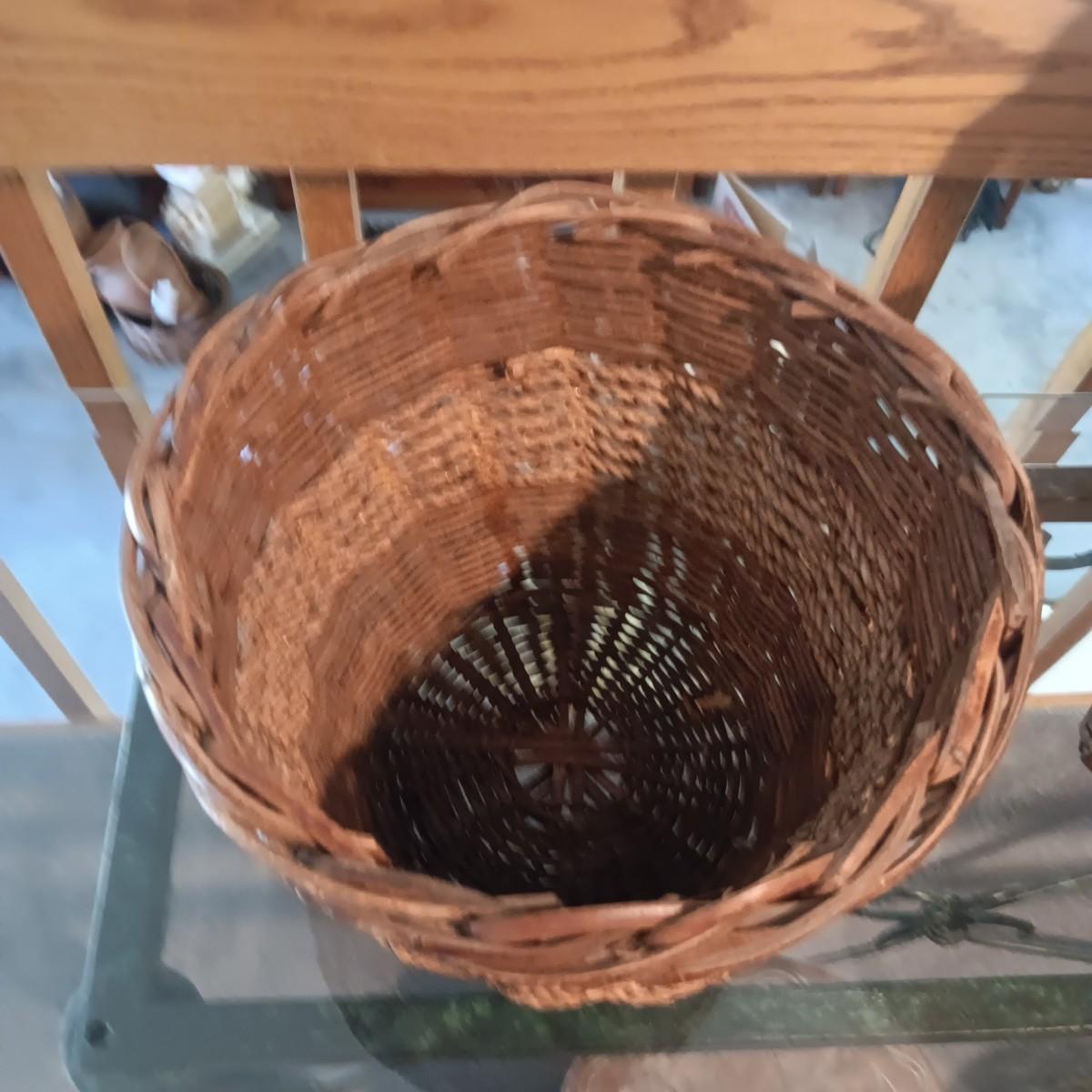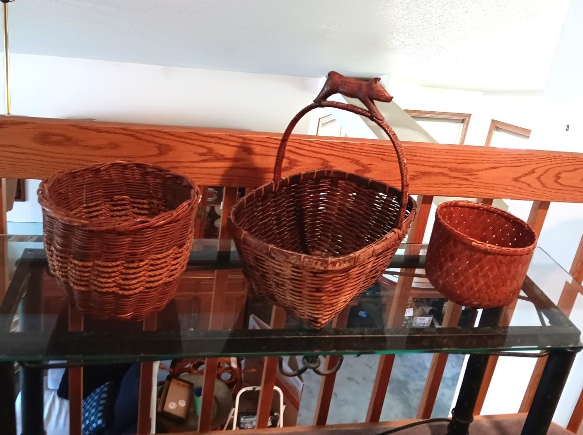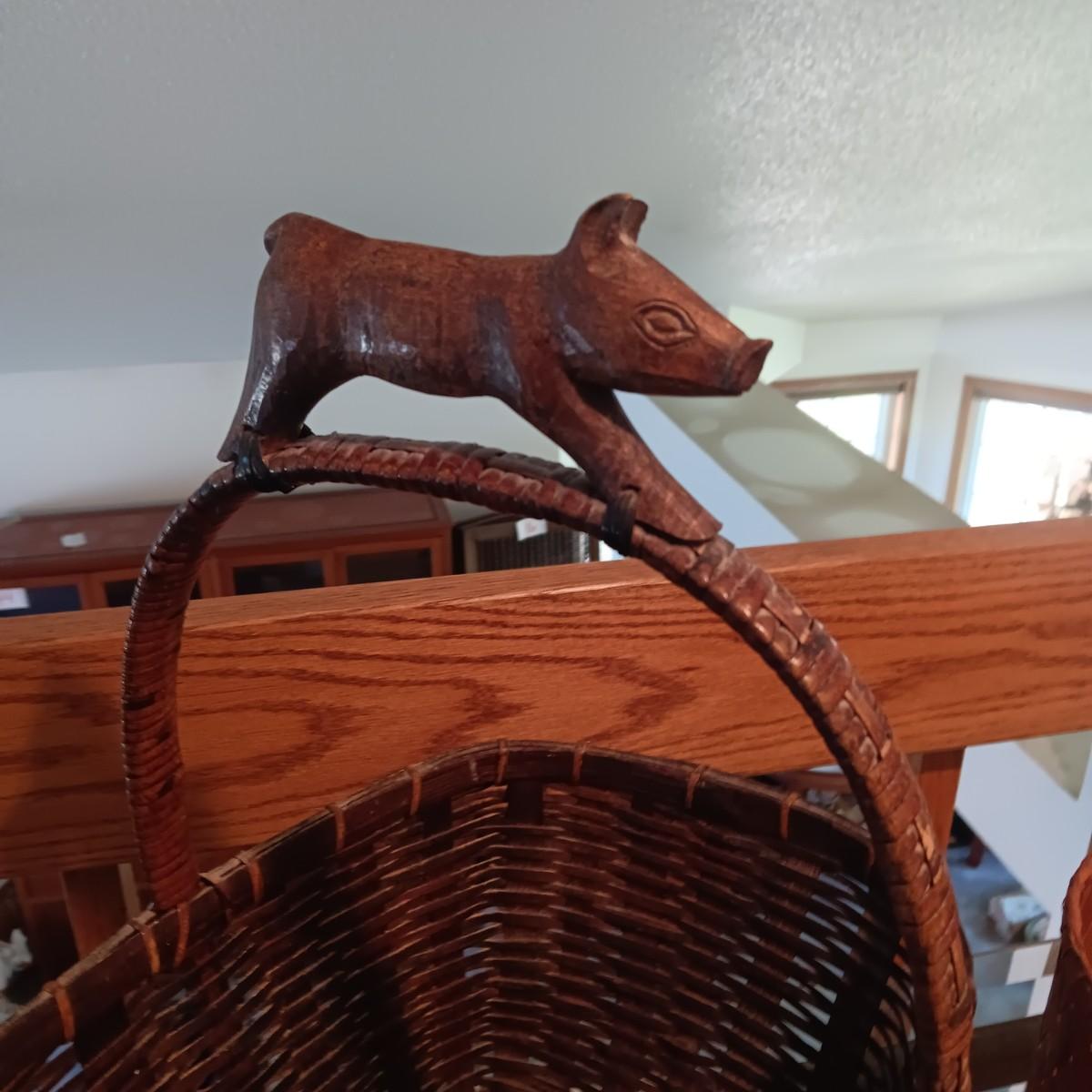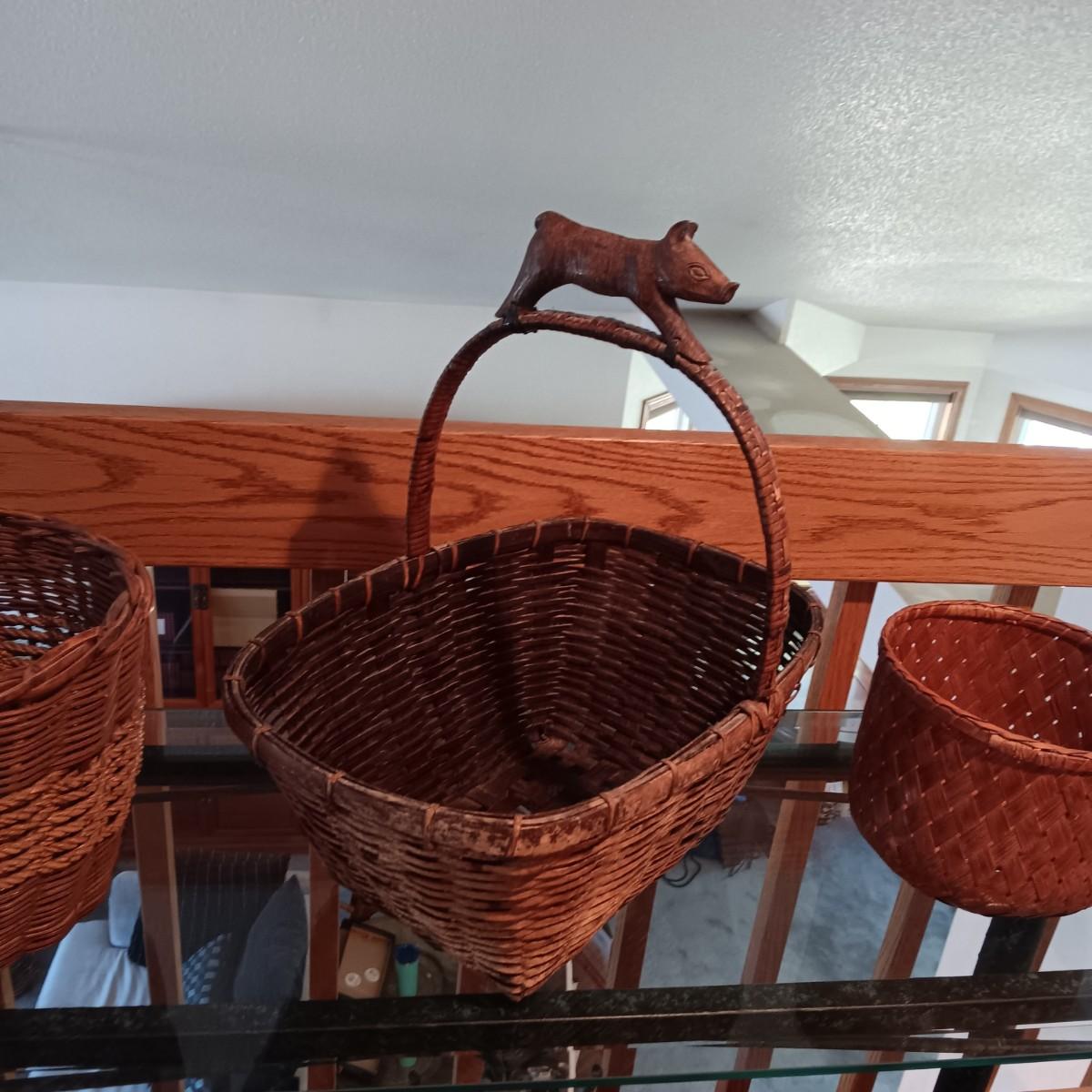 WOVEN BASKET W/WOODEN PIG HANDLE AND 2 OTHER BASKETS