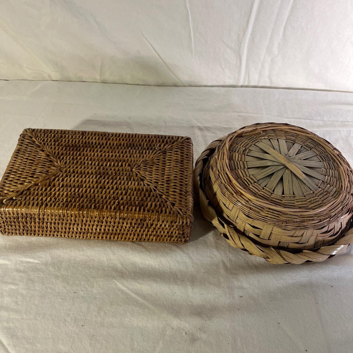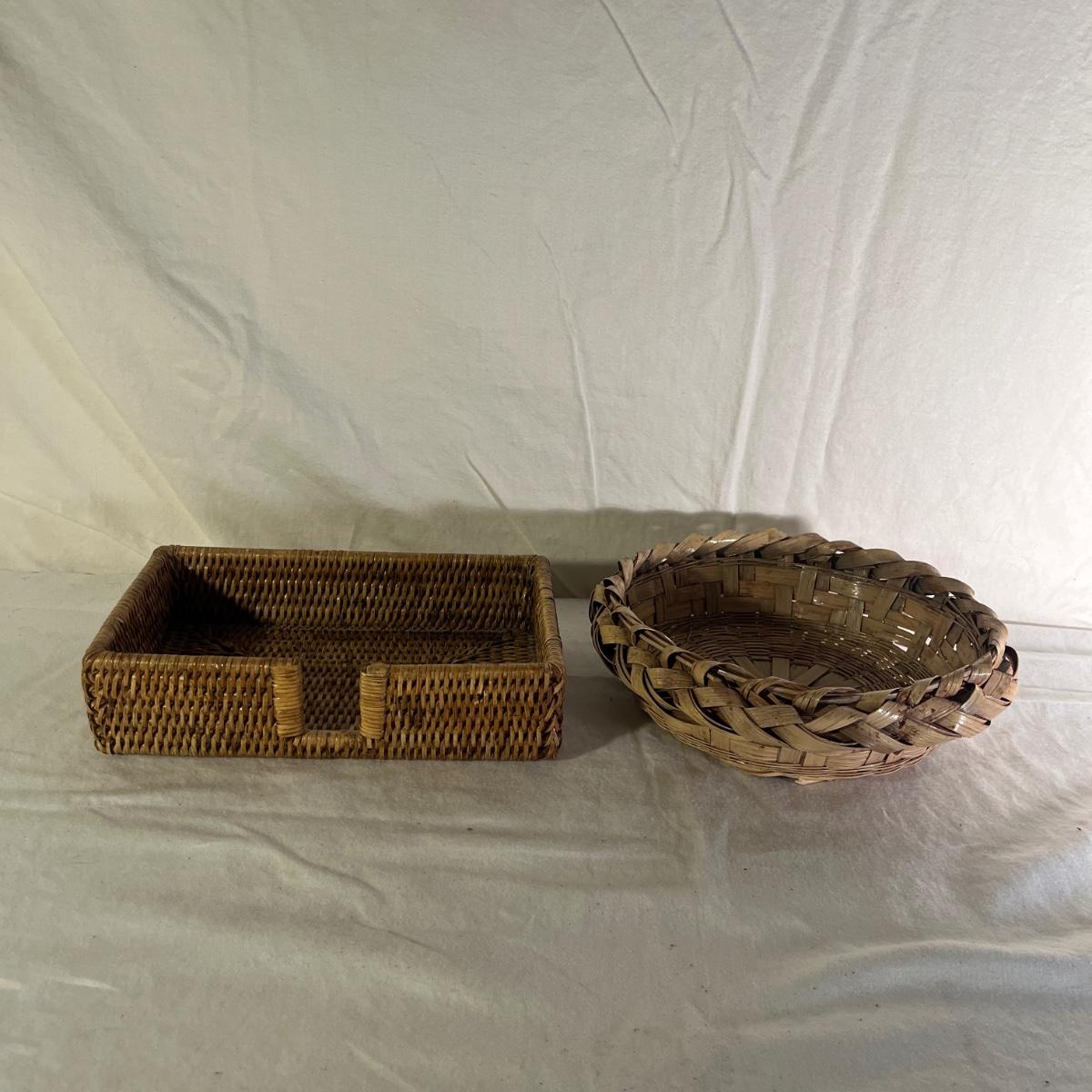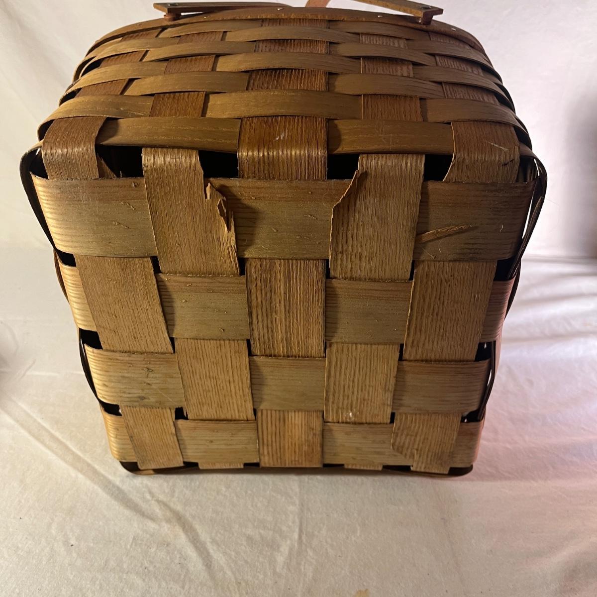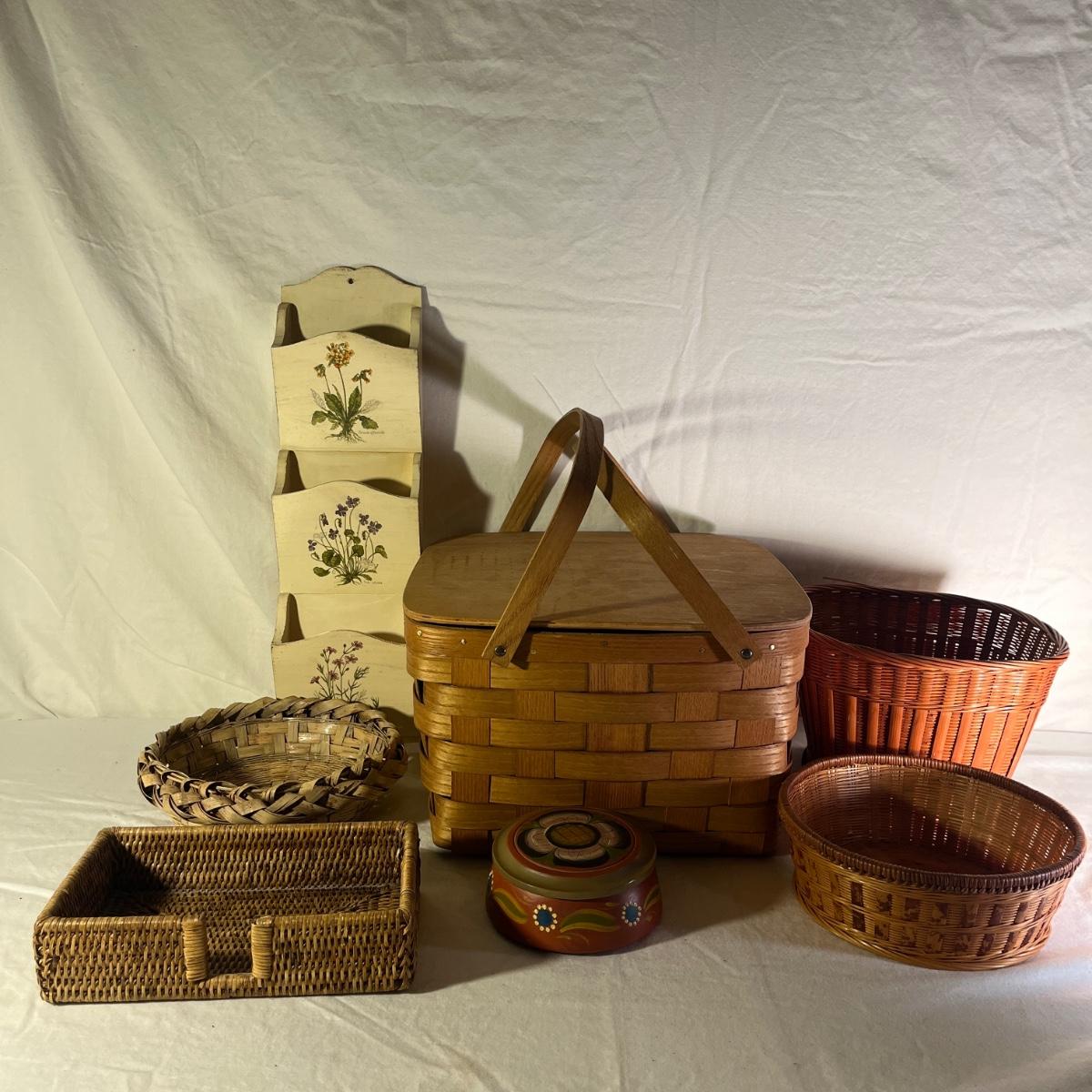 Lot includes a Basketville brand woven picnic basket, four woven baskets in various shapes & sizes, a painted wooden jar with a lid, and a wooden hanging letter organizer with floral designs. Picnic basket measures 13.5” x 13.5” x 8.5”H. There is slight damage on the bottom of the picnic basket; see photos.