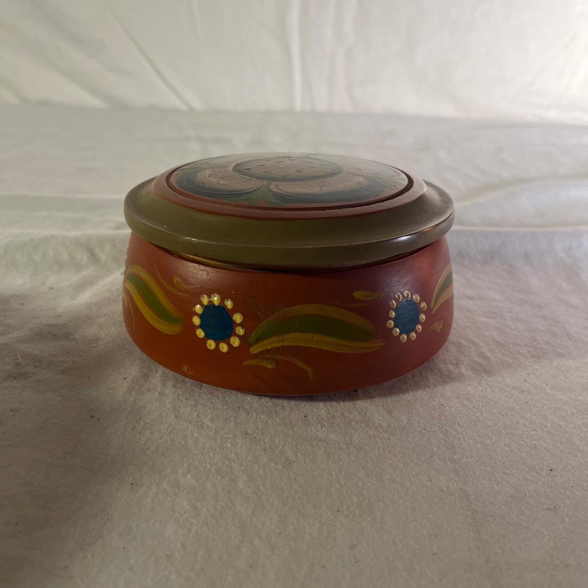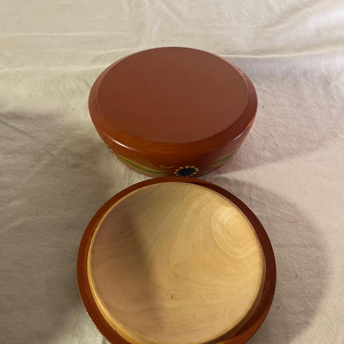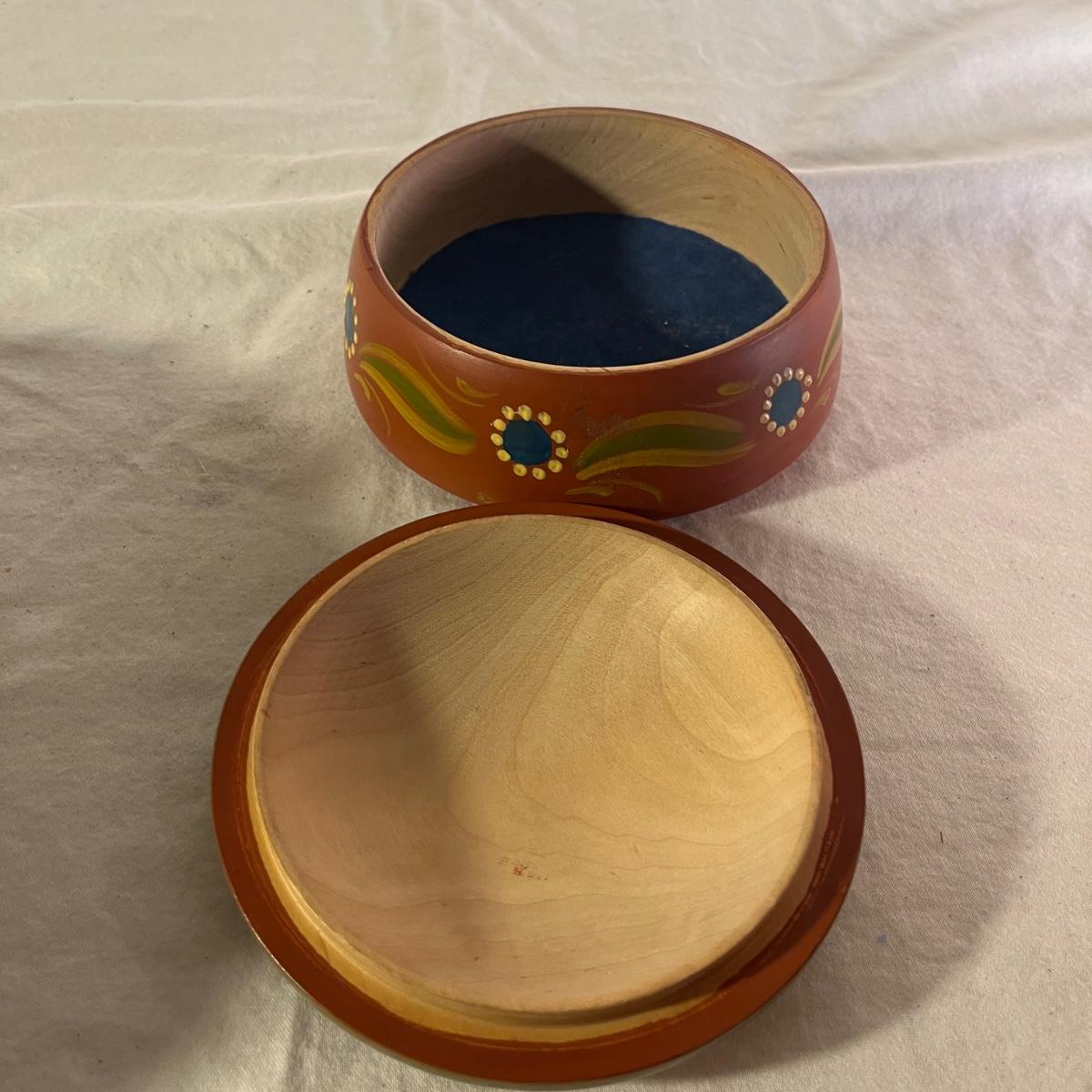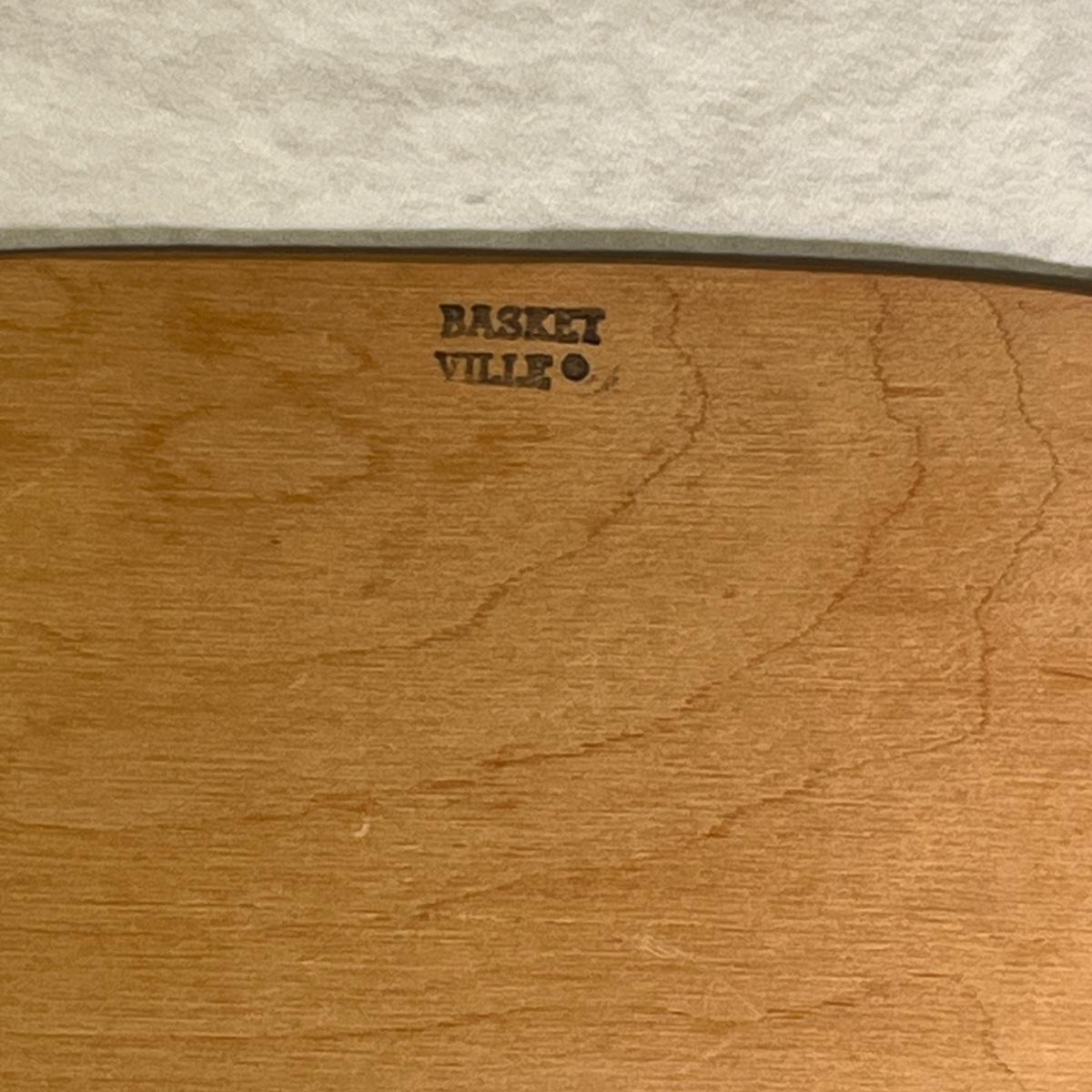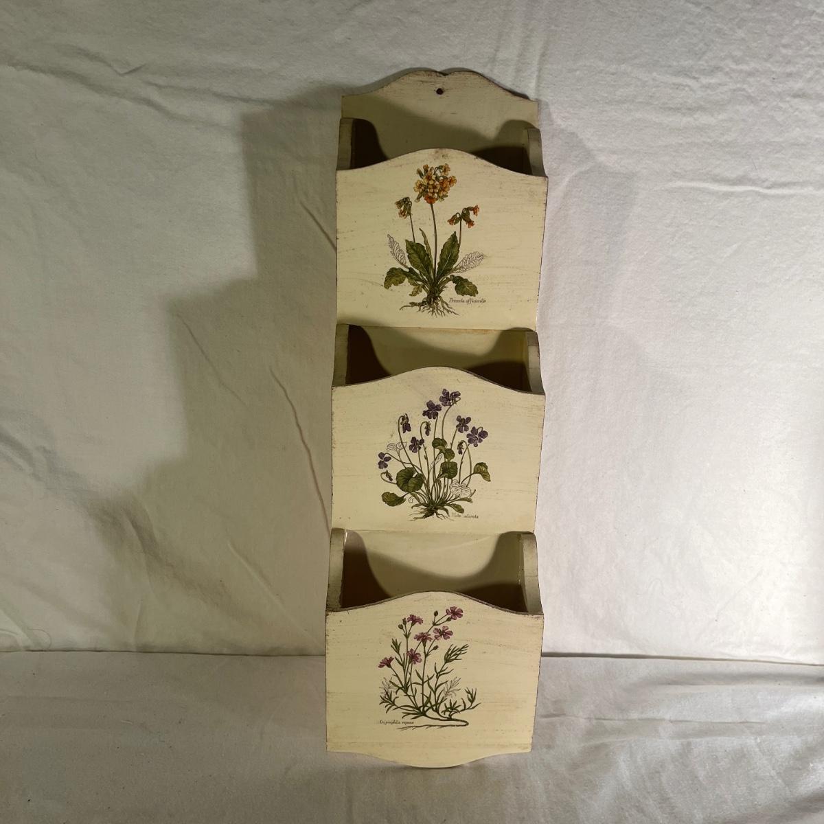 Lot includes a Basketville brand woven picnic basket, four woven baskets in various shapes & sizes, a painted wooden jar with a lid, and a wooden hanging letter organizer with floral designs. Picnic basket measures 13.5” x 13.5” x 8.5”H. There is slight damage on the bottom of the picnic basket; see photos.