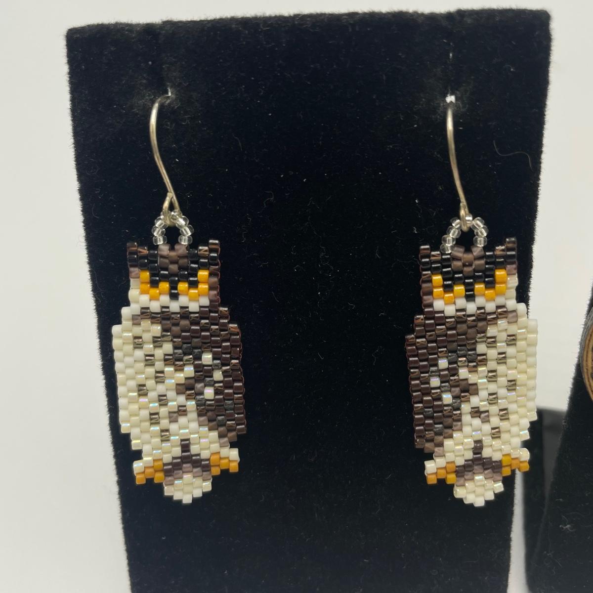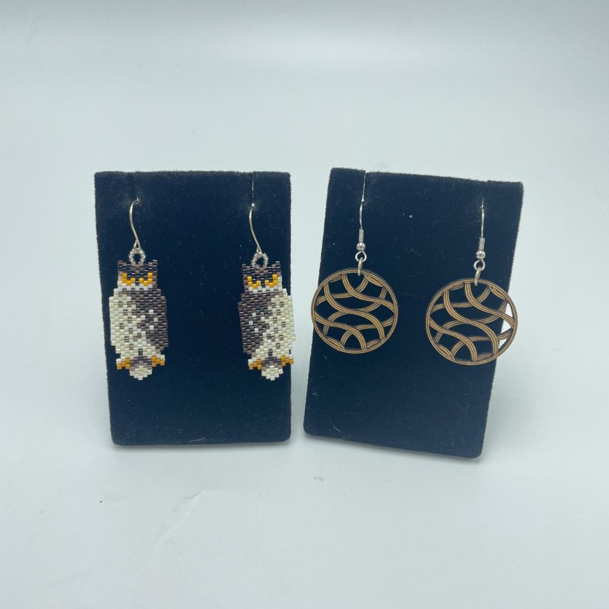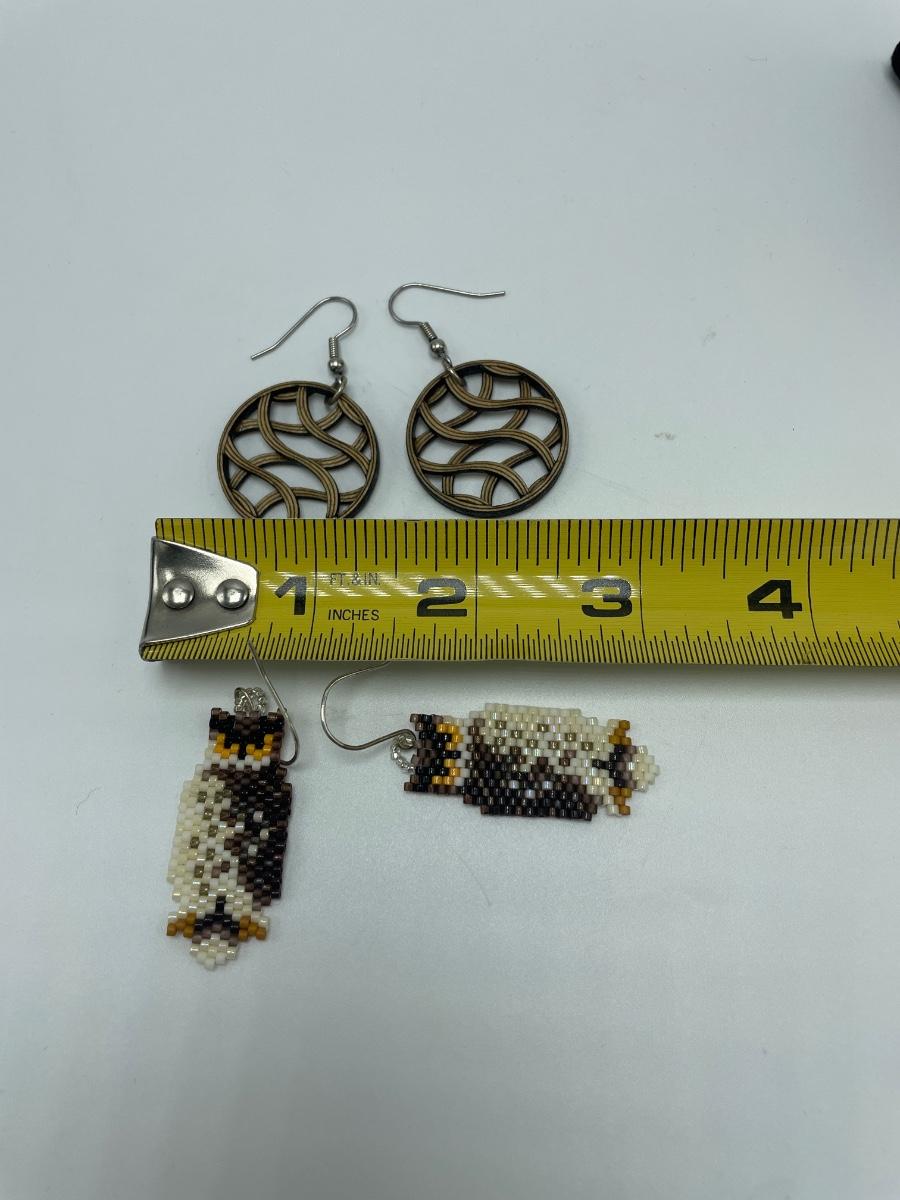 Lightweight wooden earrings and a pair of woven bead owls. Both have French wires and neither appear to have artist stamps or signatures. See images. Shipping available.